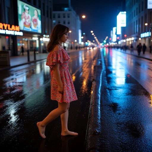 2. v67reflection, a young woman in a colorful dress looking at her reflection in a rain puddle on a city street at night, neon lights reflecting, wet asphalt, cinematic lighting