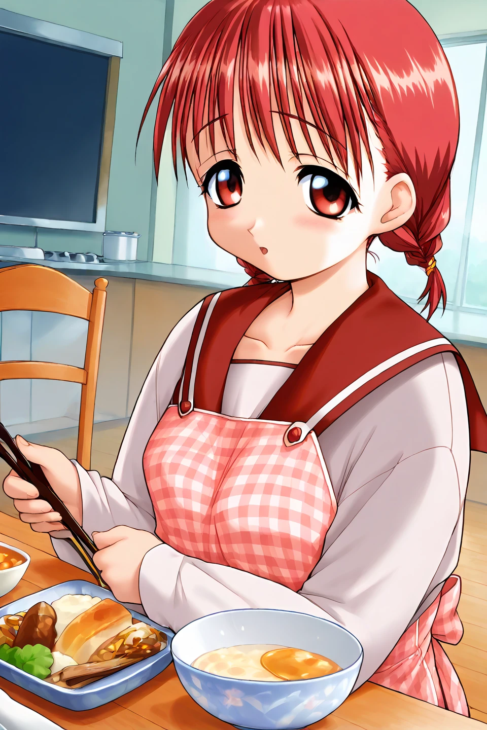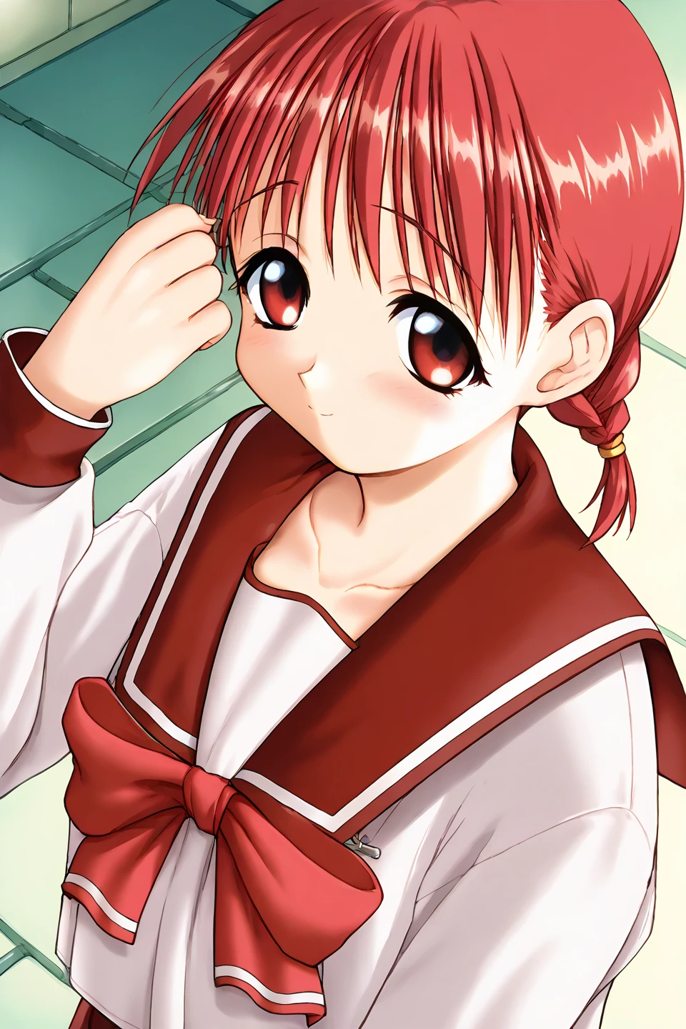 school uniform,serafuku,sailor collar,red sailor collar,long sleeves,collarbone,apron,