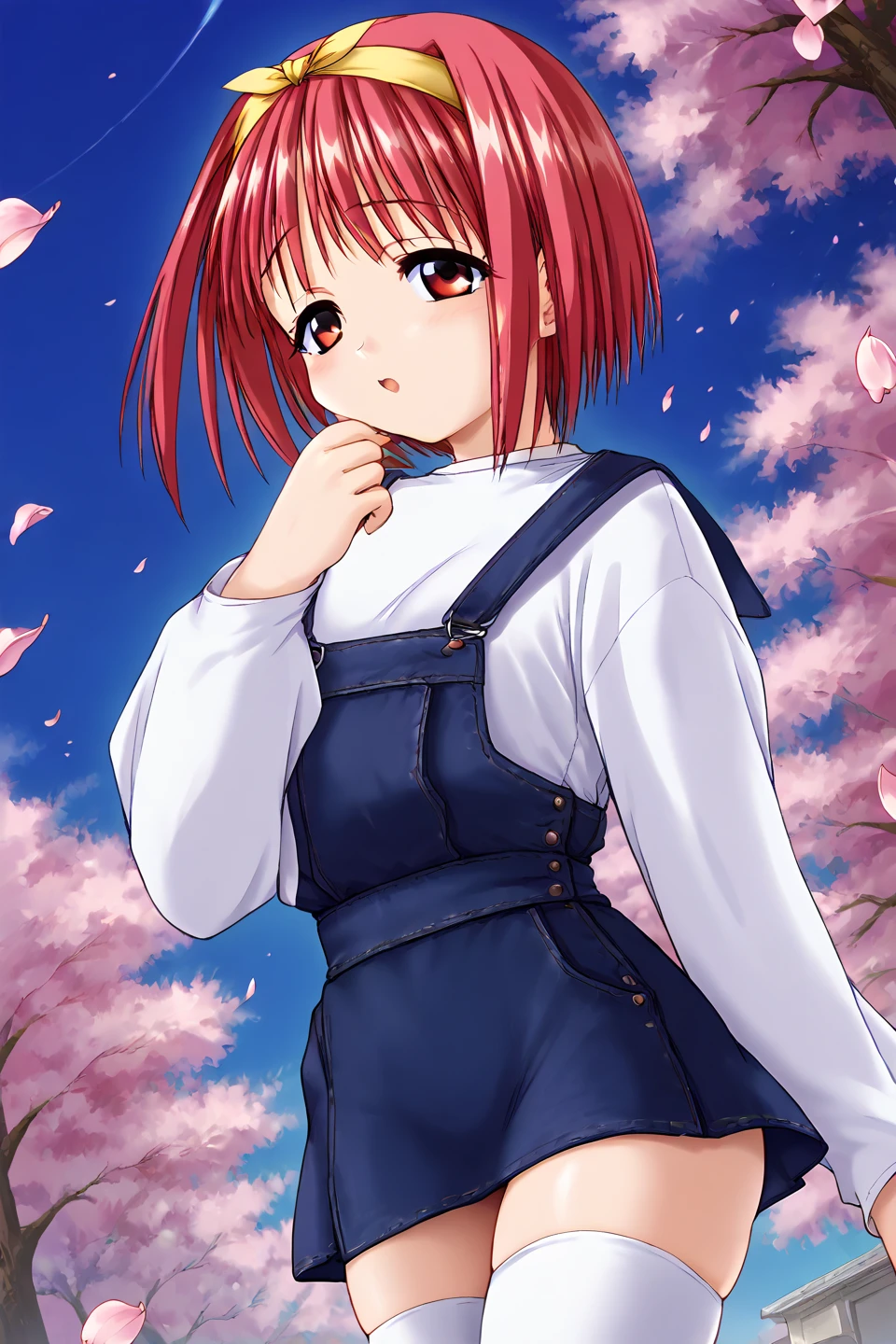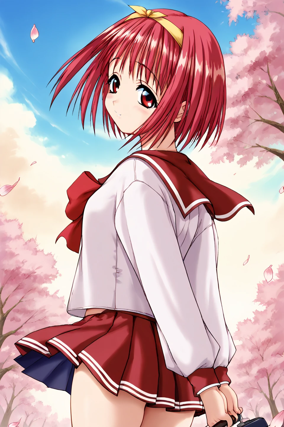 kamigishi akari, red eyes, red hair, short hair, braid, hairband, yellow hairband, hair bow, yellow bow