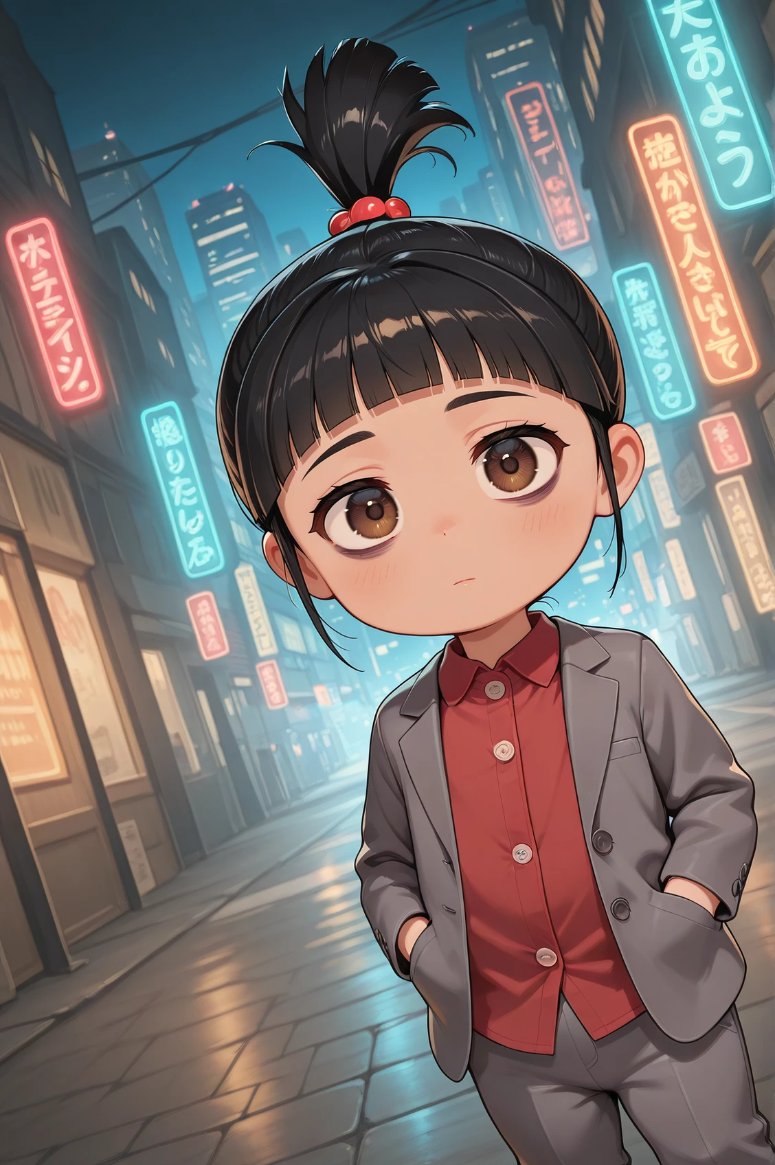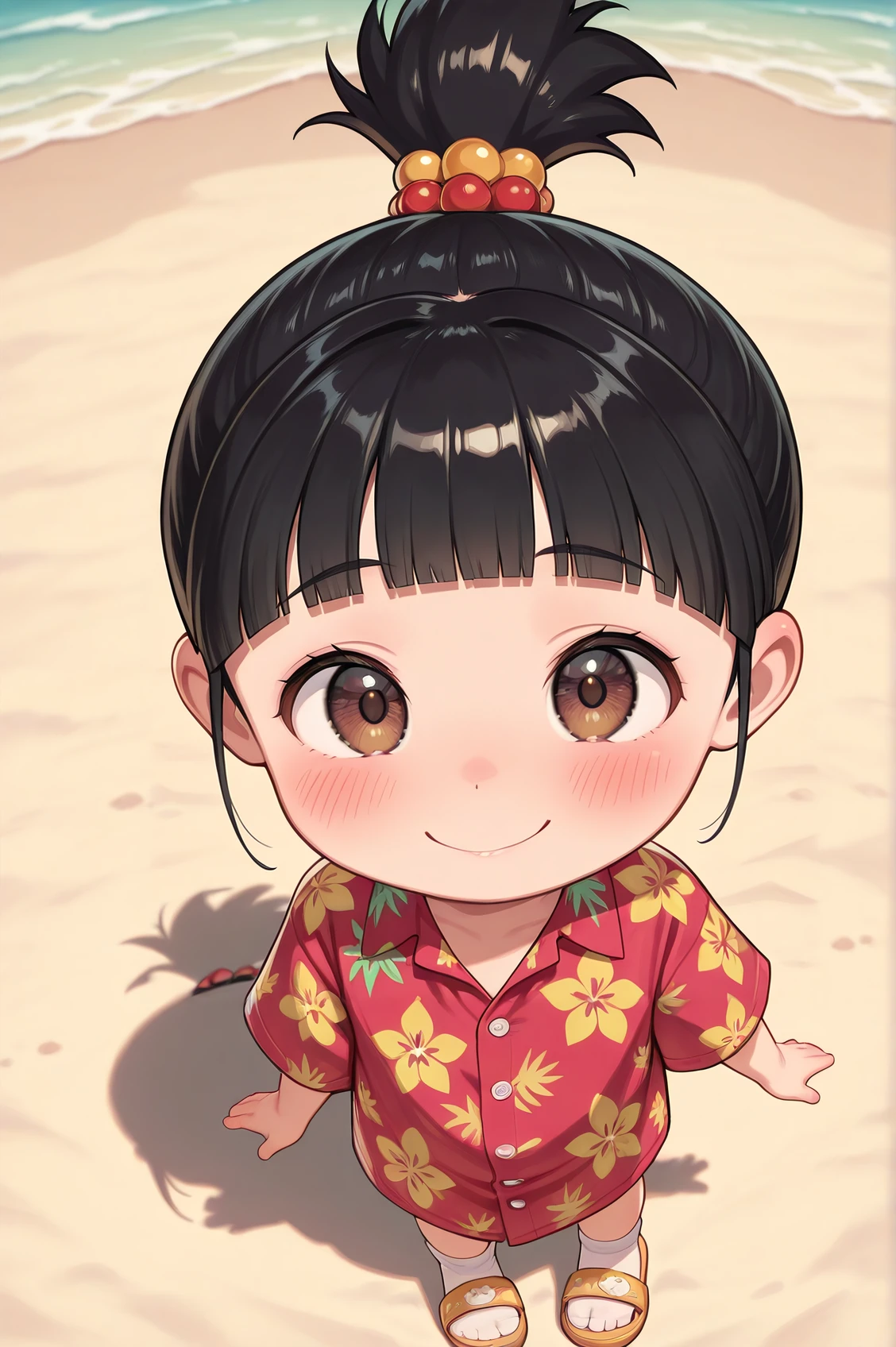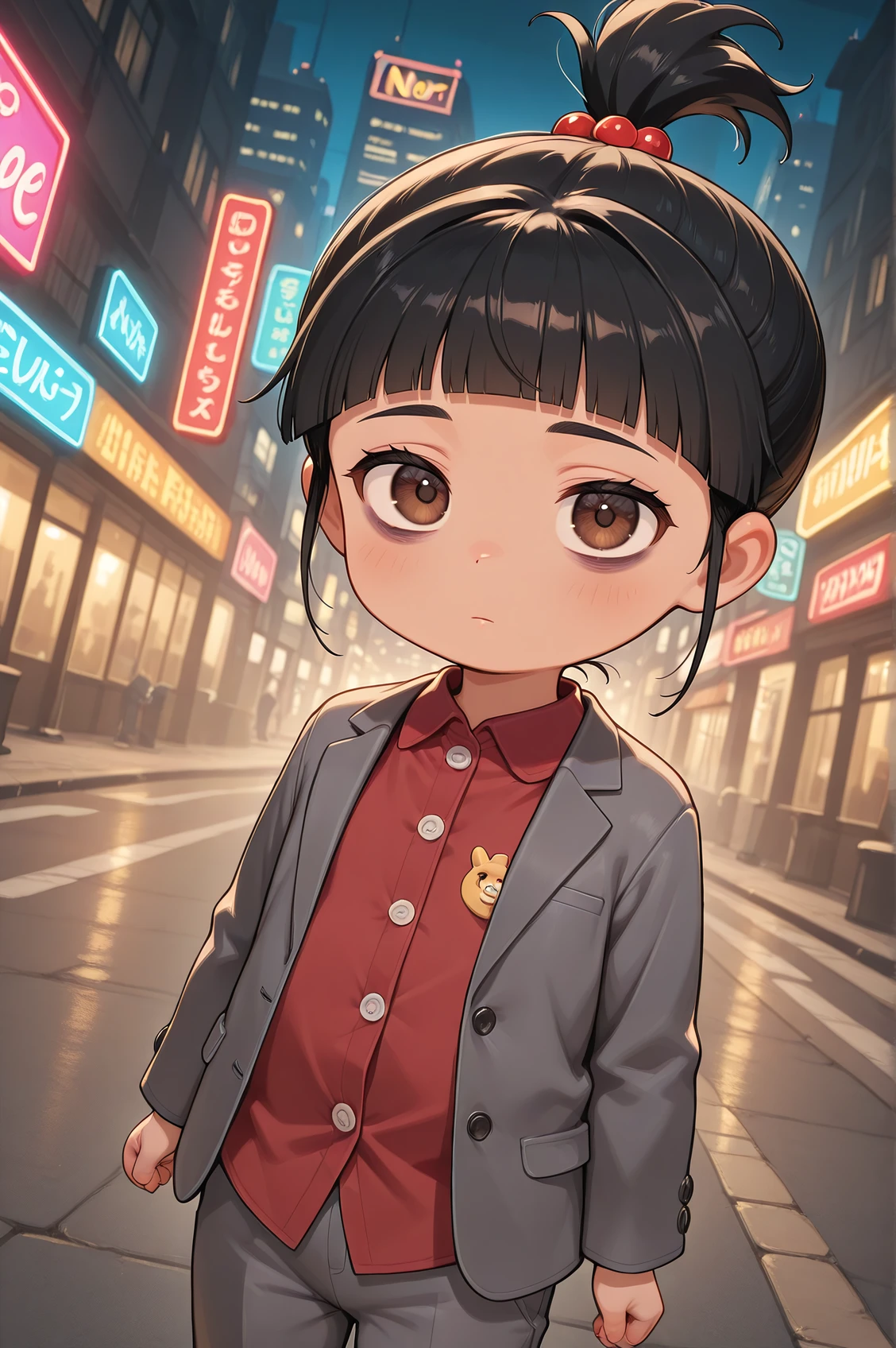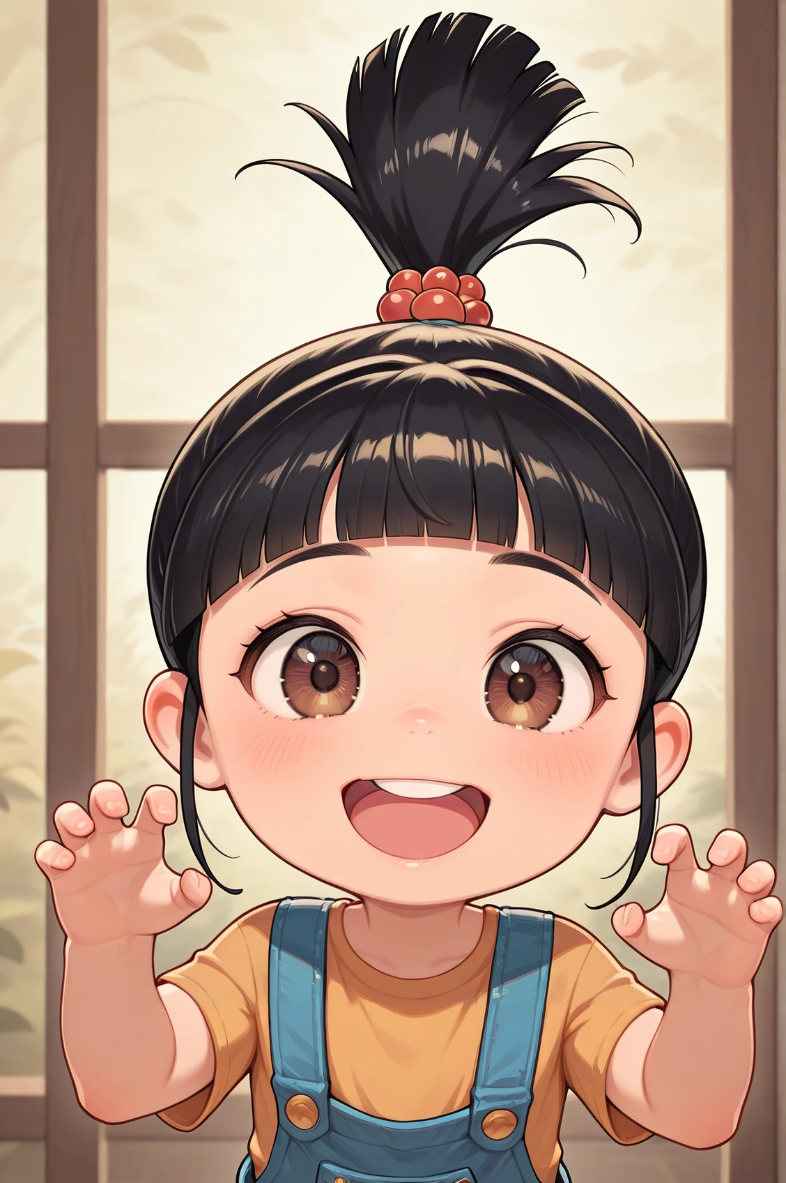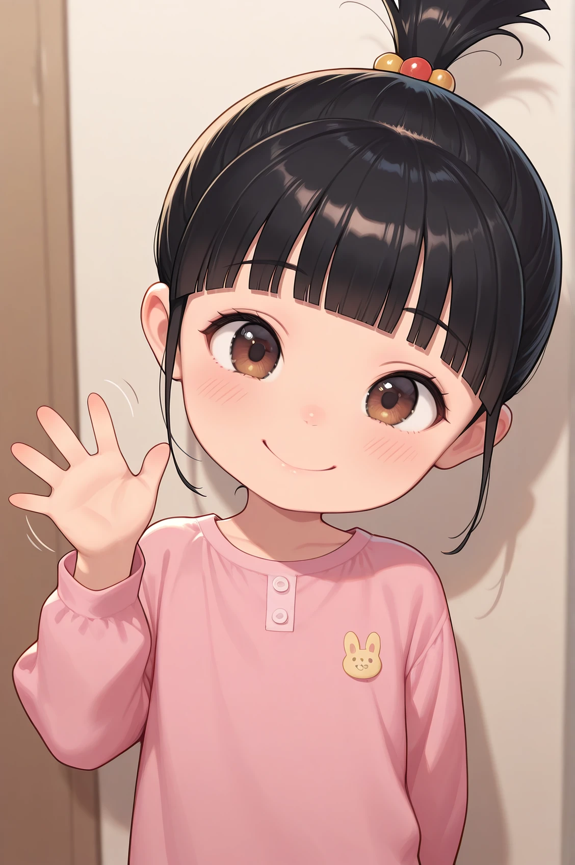 1girl, solo, brown eyes, black hair, bangs, blunt bangs, ponytail, hair bauble,