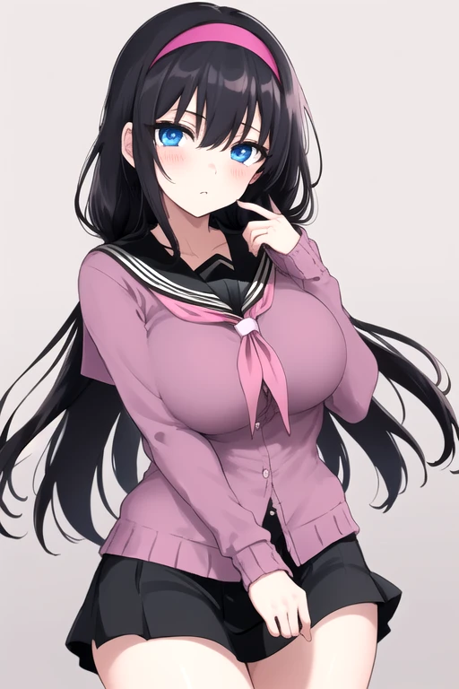MoyakoKonoe, 1girl, solo, long hair, blue eyes, black skirt, large breasts, black hair, dark pink hairband, serafuku, sweater, dark pink cardigan