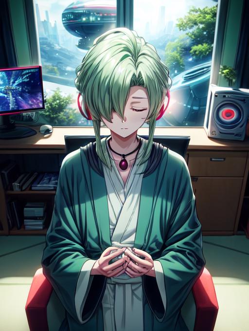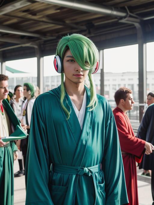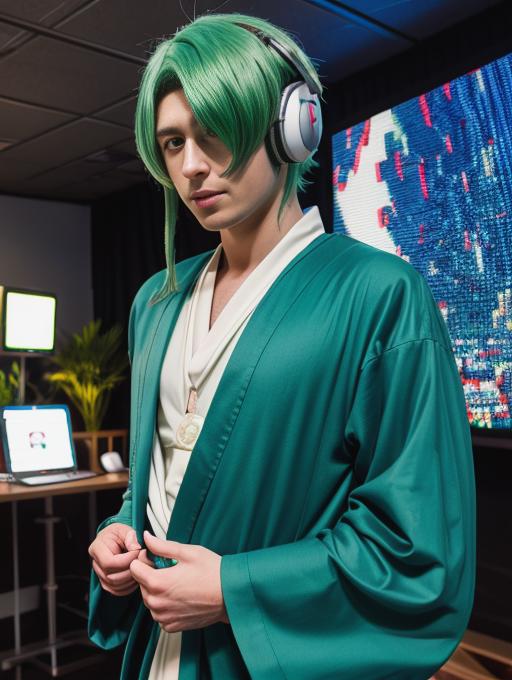 Additional words that may help: green hair, red eyes, white headphones, green robes,