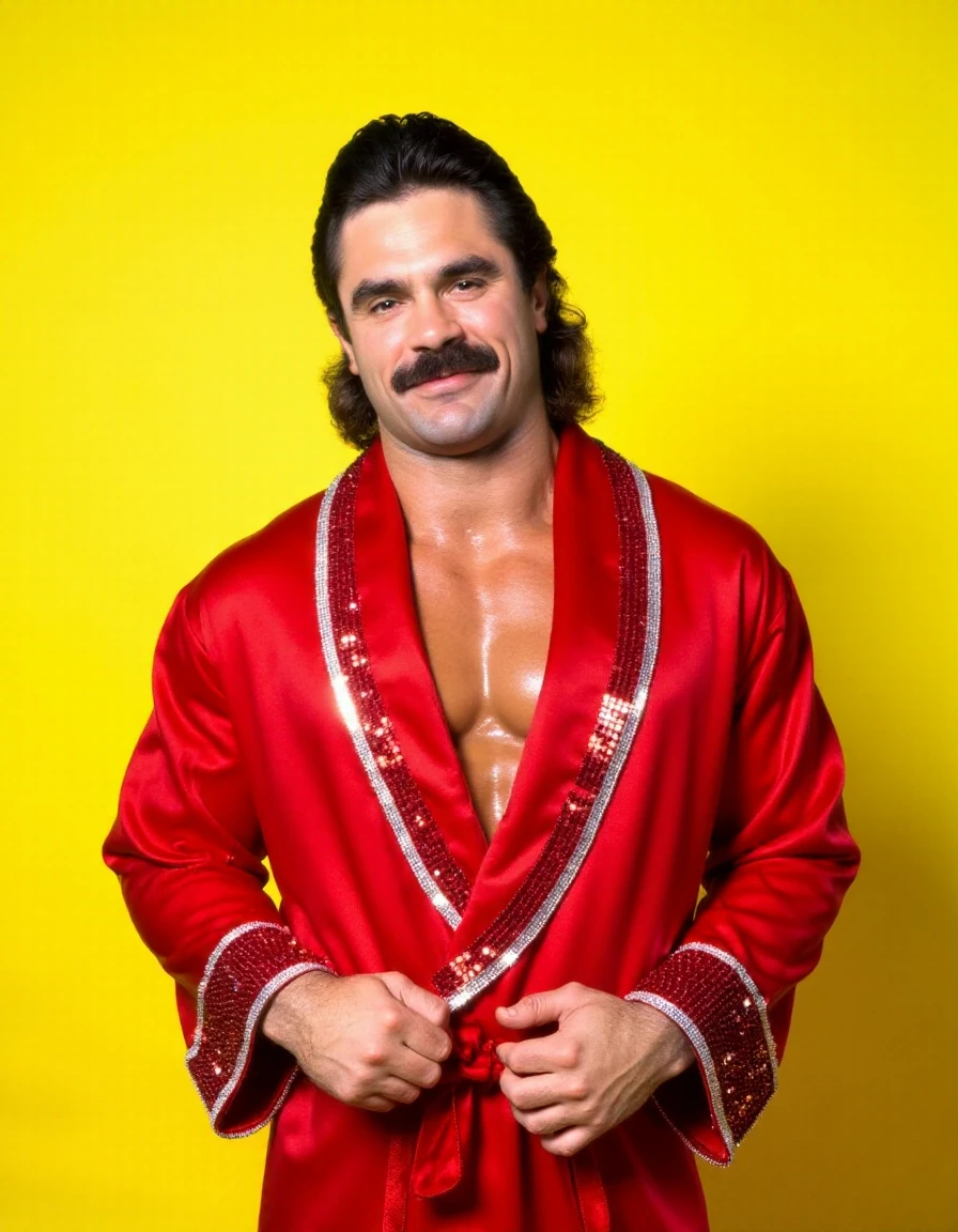 Rick Rude (real name Richard Erwin Rood) was a charismatic American professional wrestler best known for his flamboyant persona, chiseled physique, and arrogant swagger. Rising to fame in the 1980s and early 1990s, he became a staple of both WWF and WCW, often playing the seductive heel who flaunted his looks and insulted male fans while wooing their wives and girlfriends. Known for his signature airbrushed tights, swiveling hips, and smug promos, Rude captured multiple championships and left a lasting legacy as one of wrestling’s most iconic showmen. His blend of vanity, physical prowess, and over-the-top charisma made him unforgettable in and out of the ring.