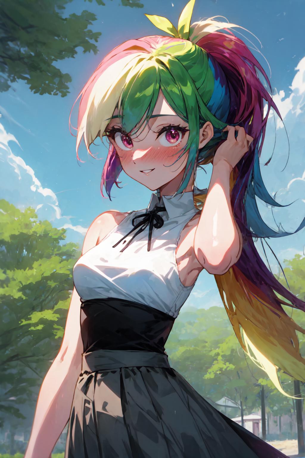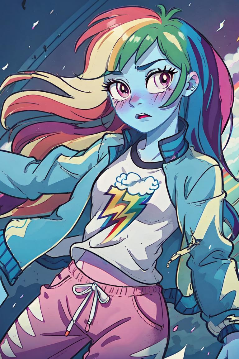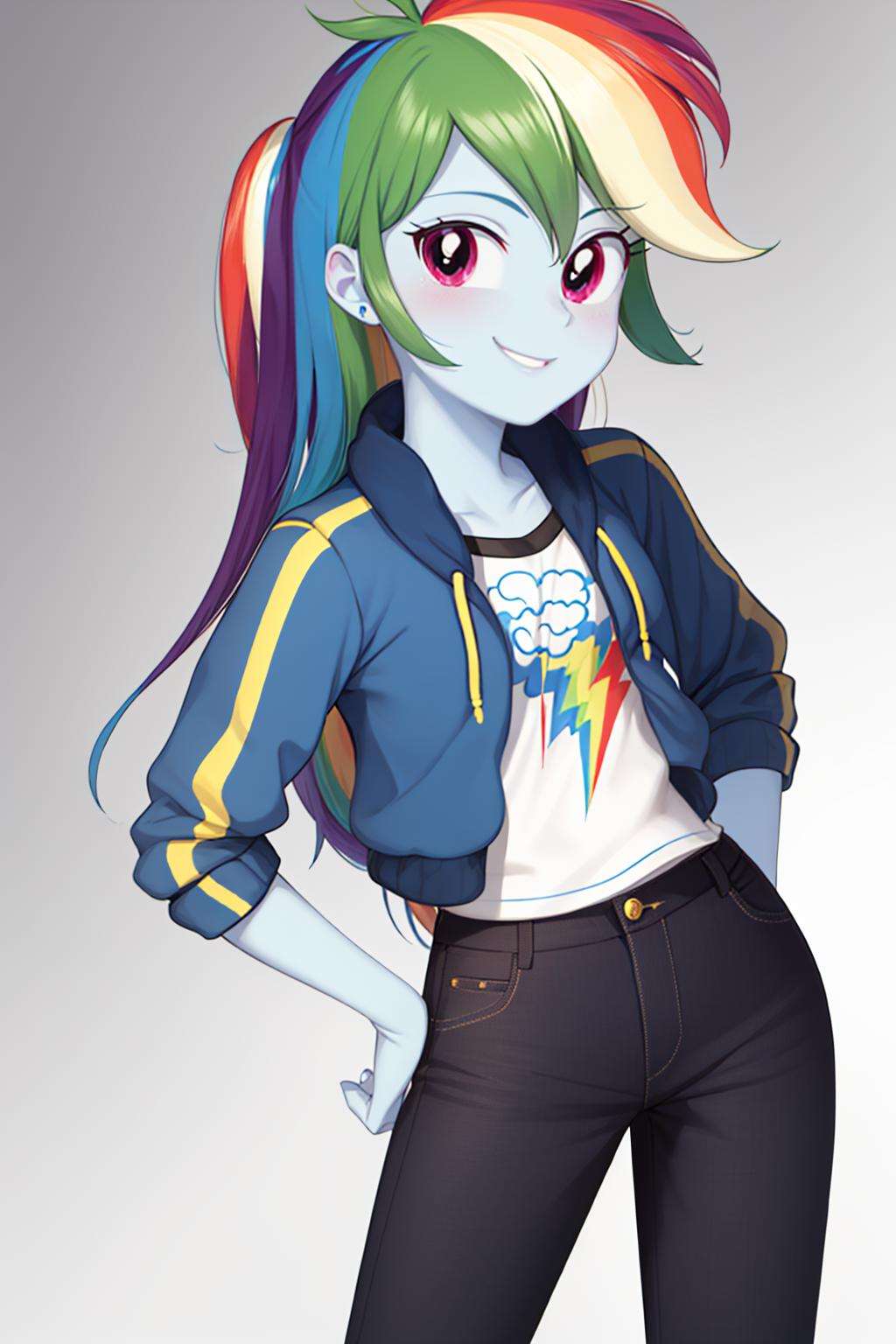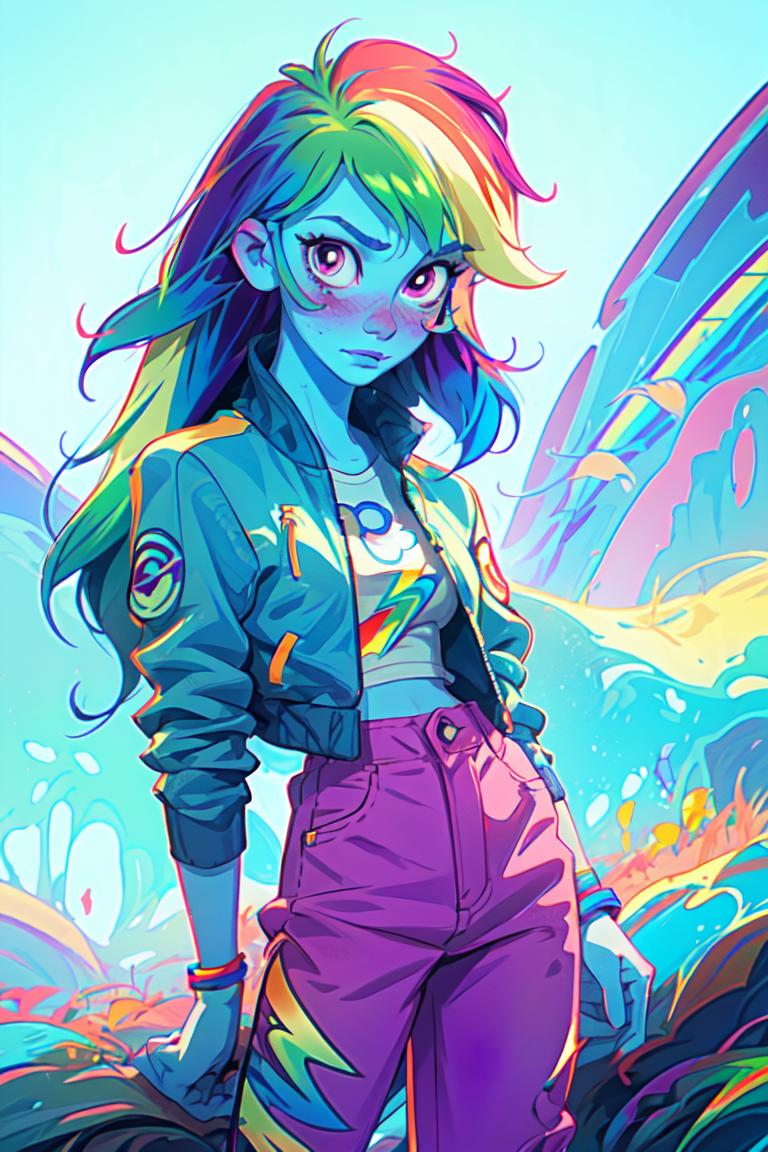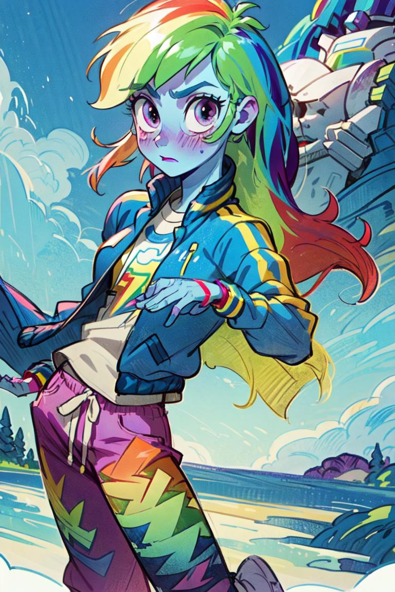 Trigger + Appearance: mlpdash, colored skin, blue skin, rainbow hair, purple eyes