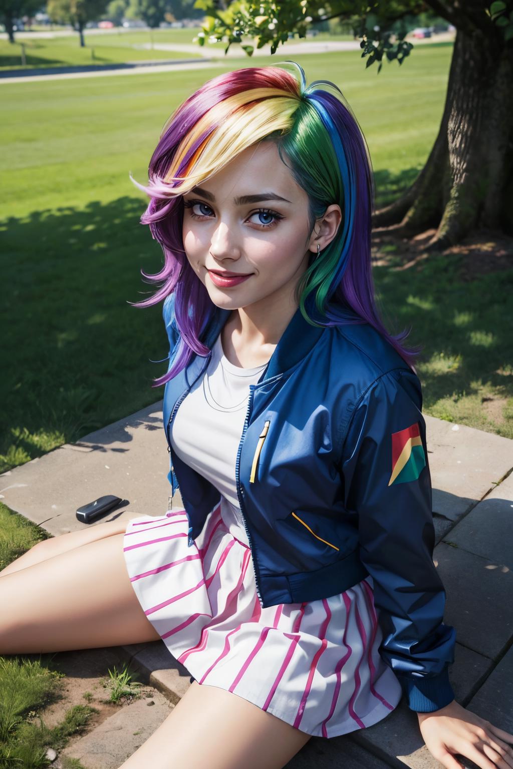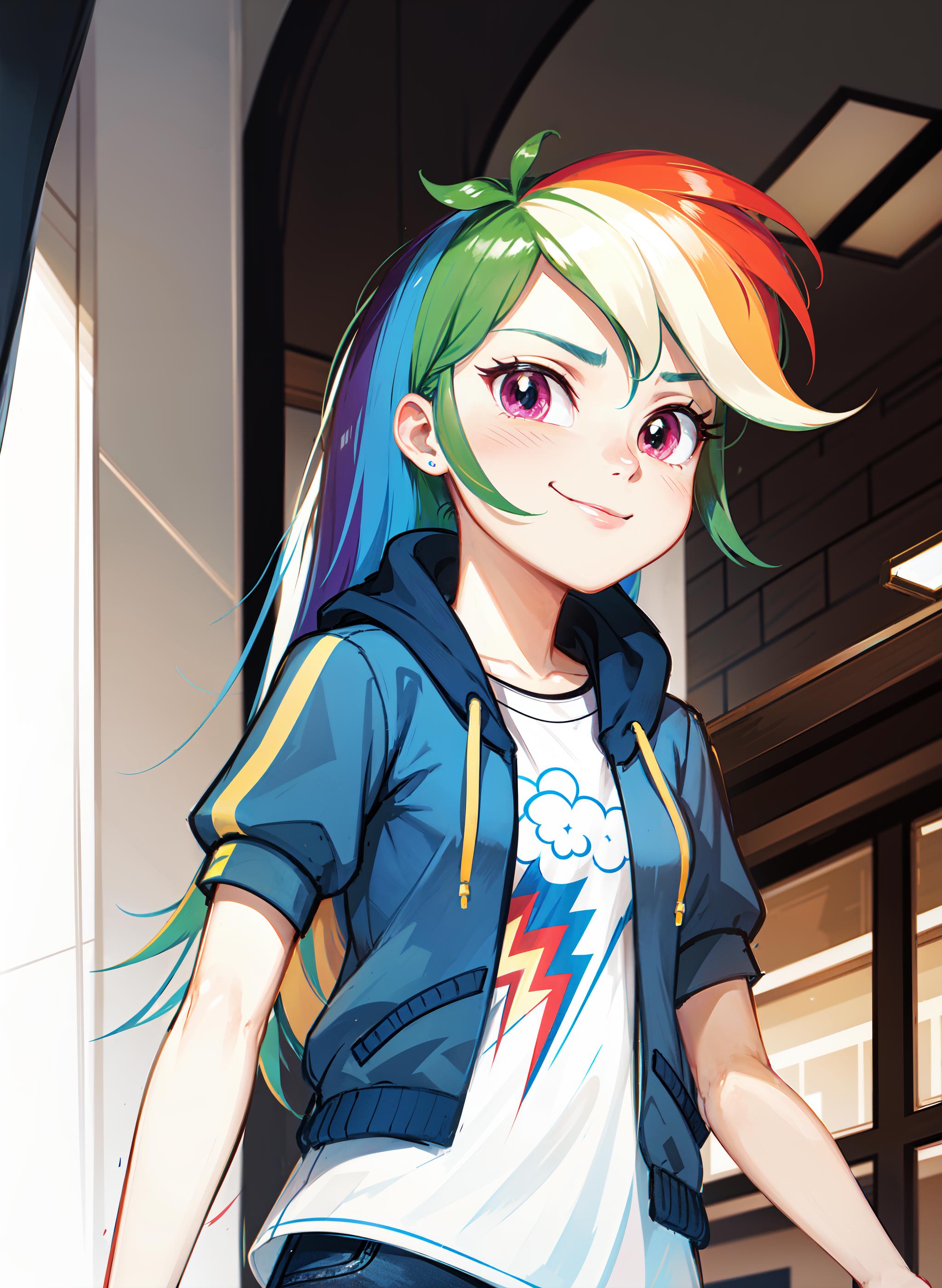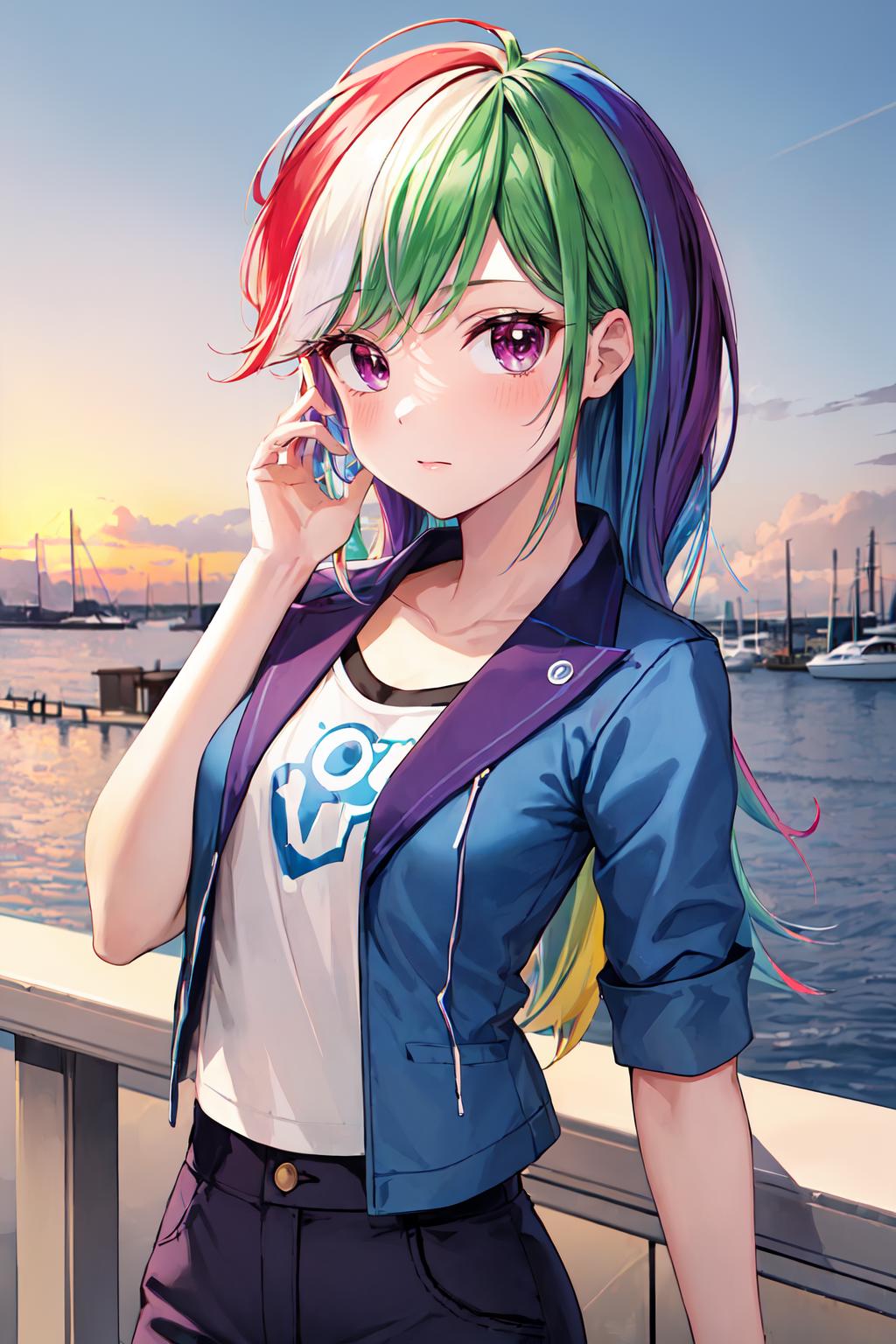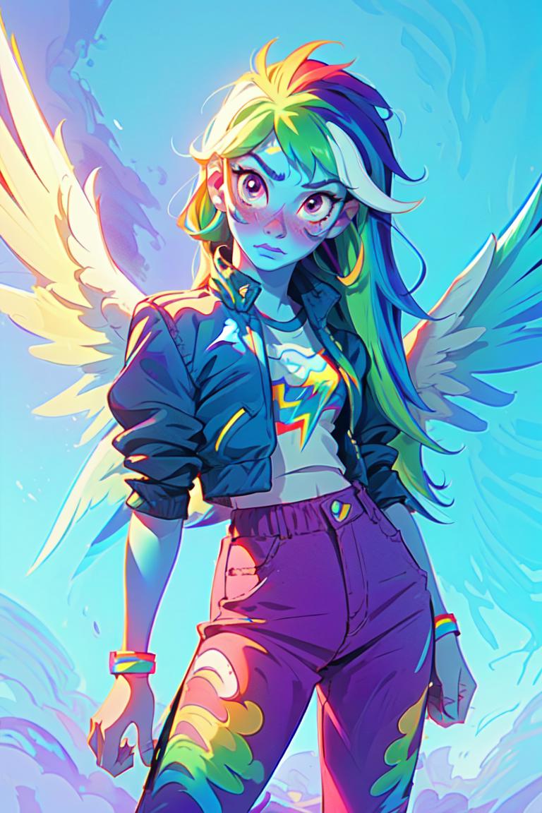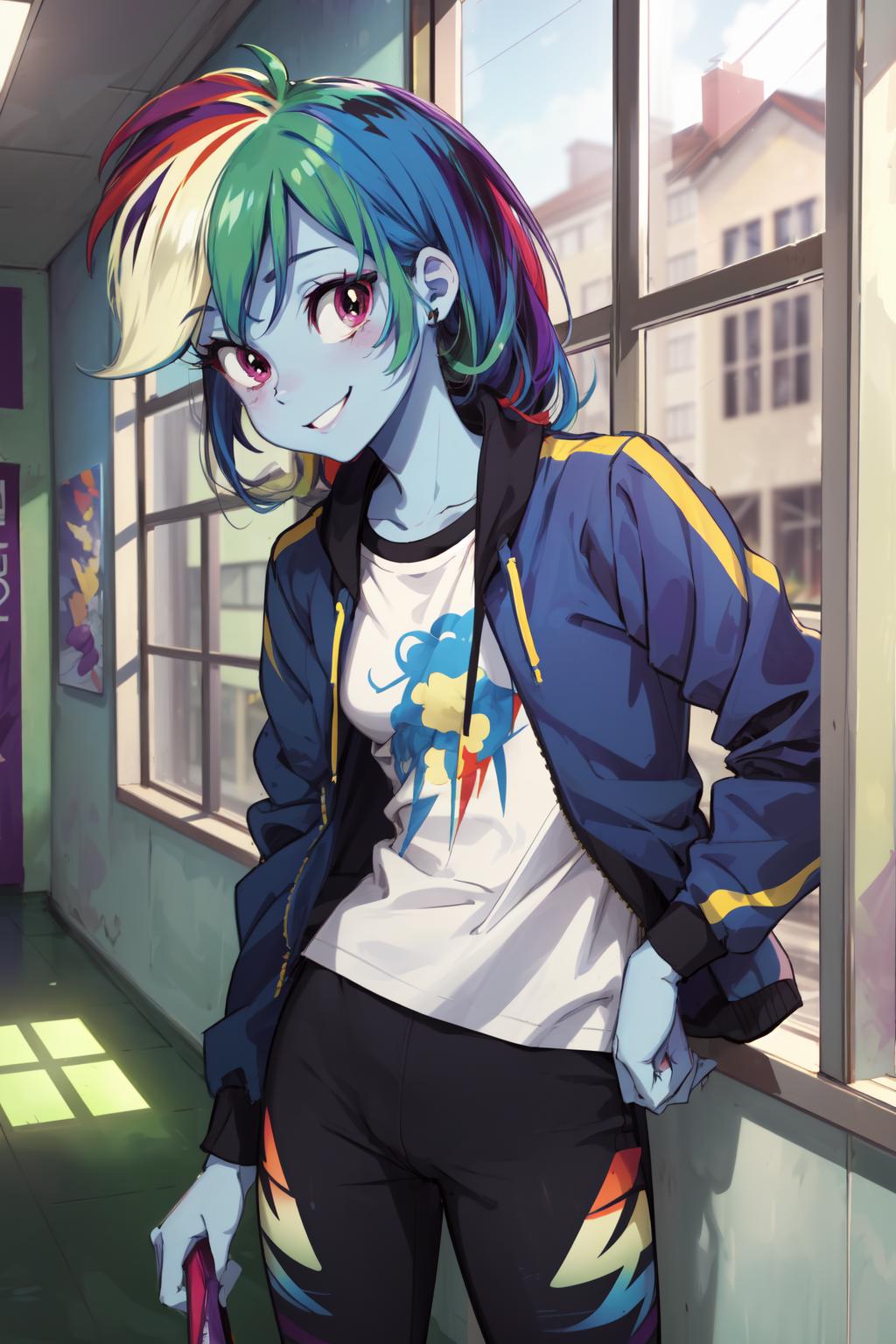 Trigger + Appearance: mlpdash, colored skin, blue skin, rainbow hair, purple eyes