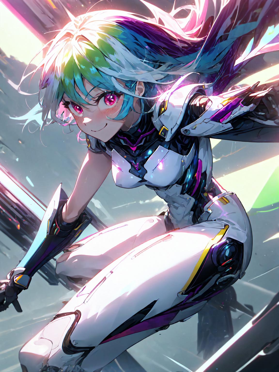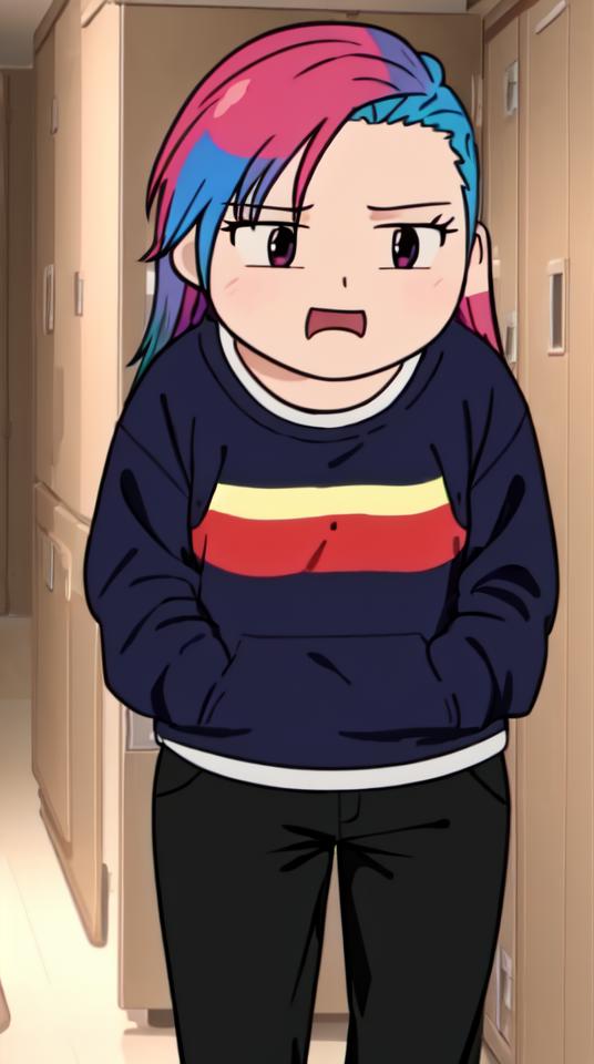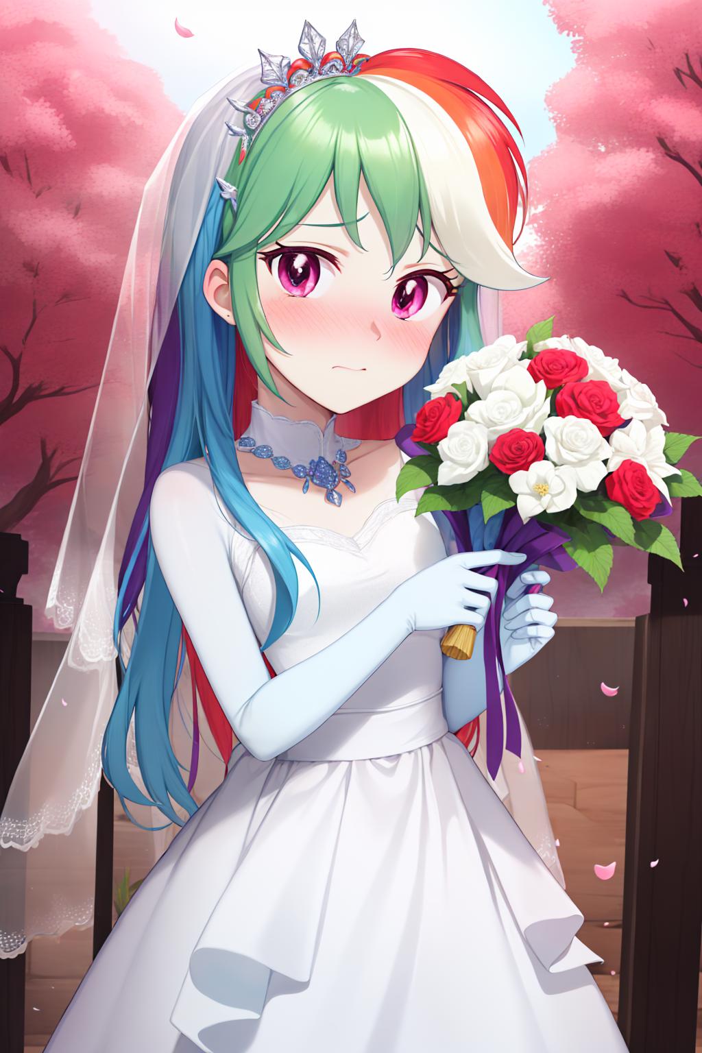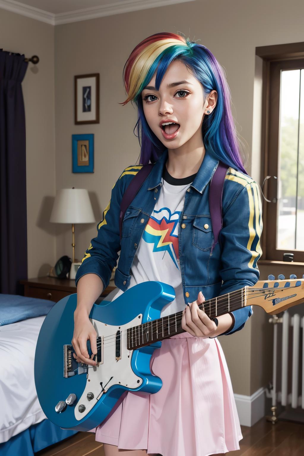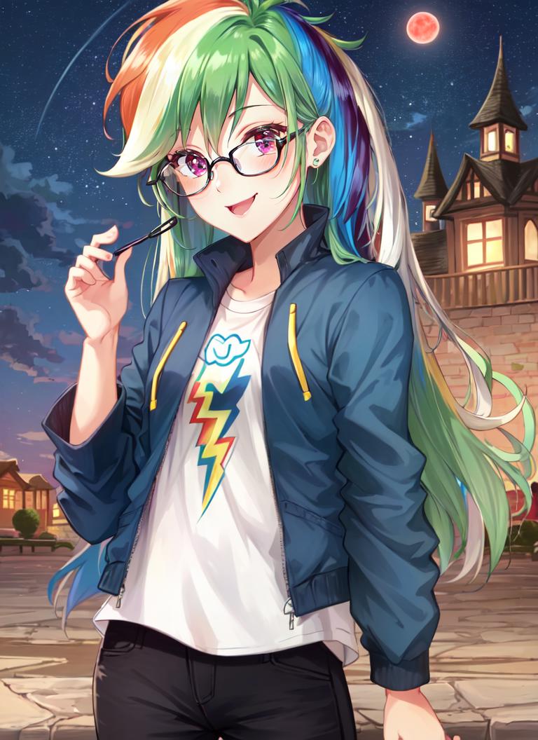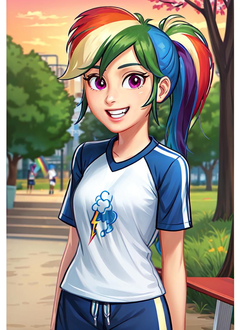 Trigger + Appearance: mlpdash, colored skin, blue skin, rainbow hair, purple eyes