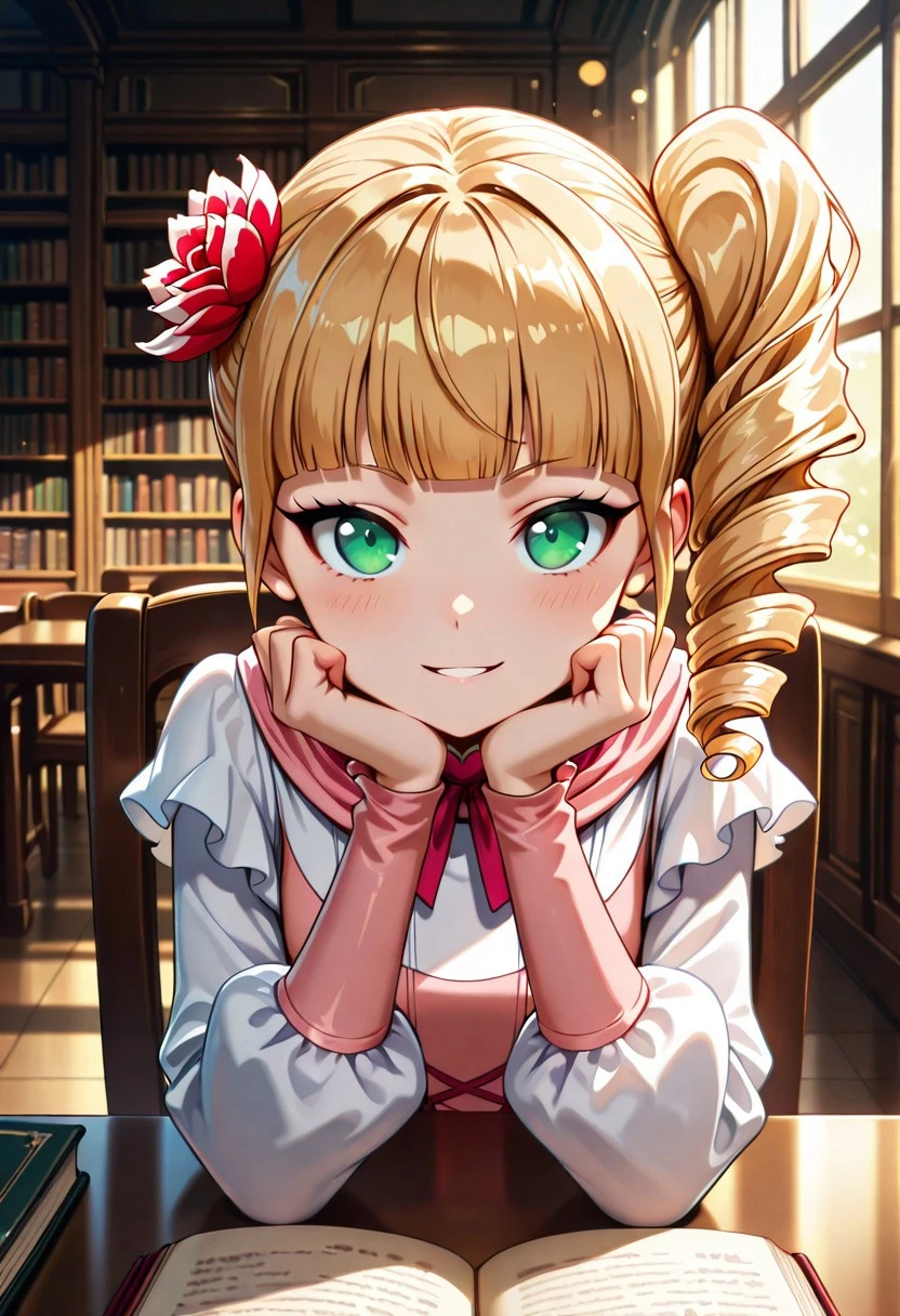 Character appearance: short hair, blonde hair, side ponytail, drill hair, sidelocks, blunt bangs, green eyes, hair flower,