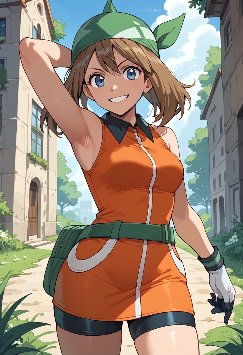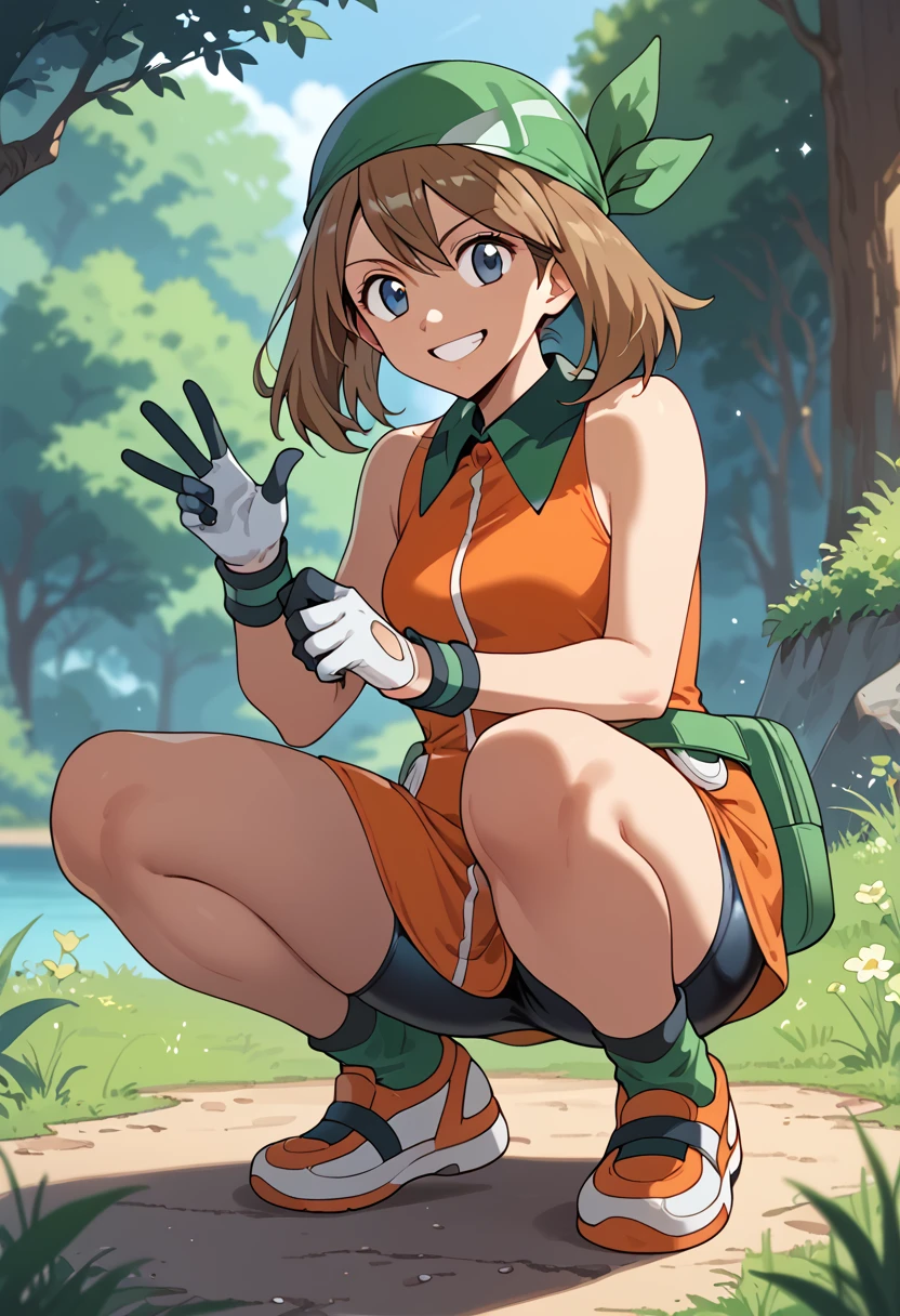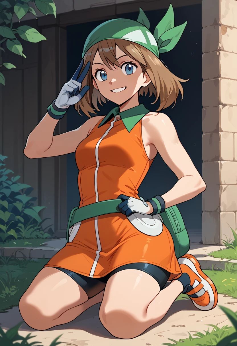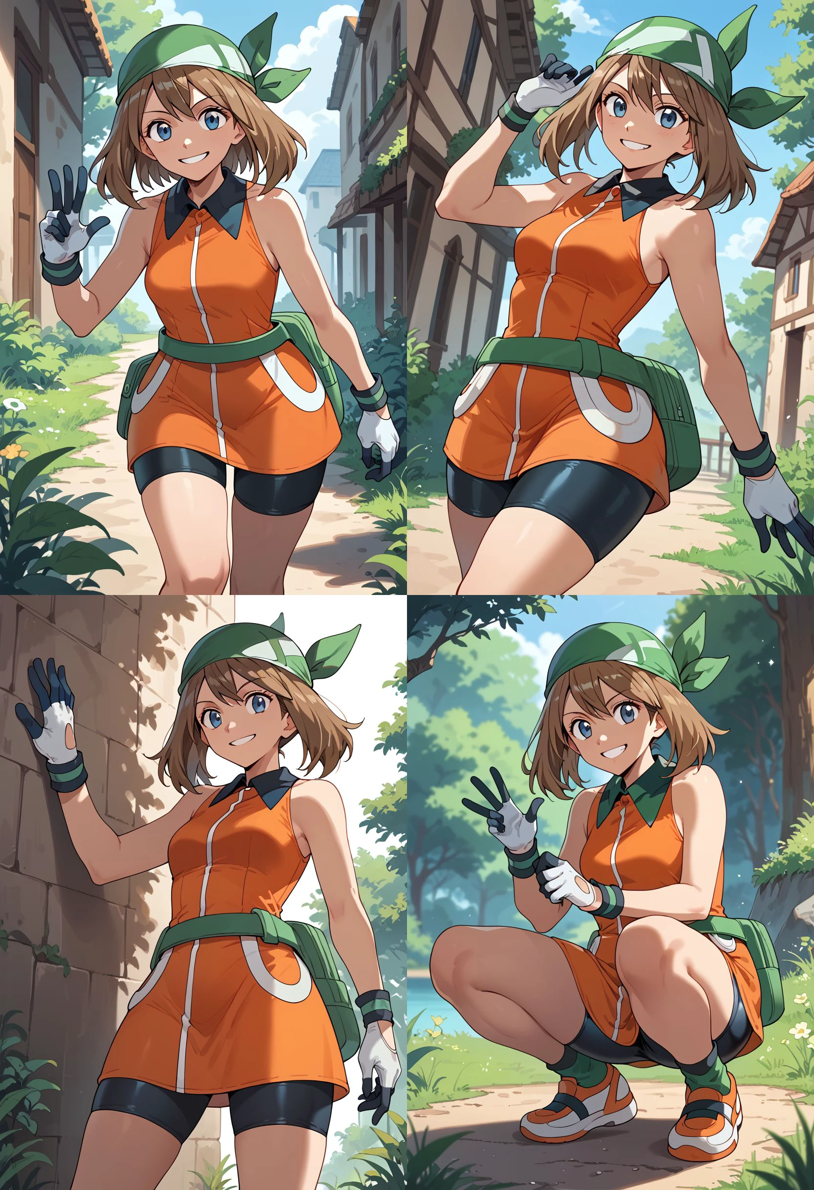 May_Es, medium hair, brown hair, blue eyes, green bandana, collared dress, sleeveless dress, orange dress, white gloves, fanny pack, green belt, shorts under dress, bike shorts, orange footwear,
