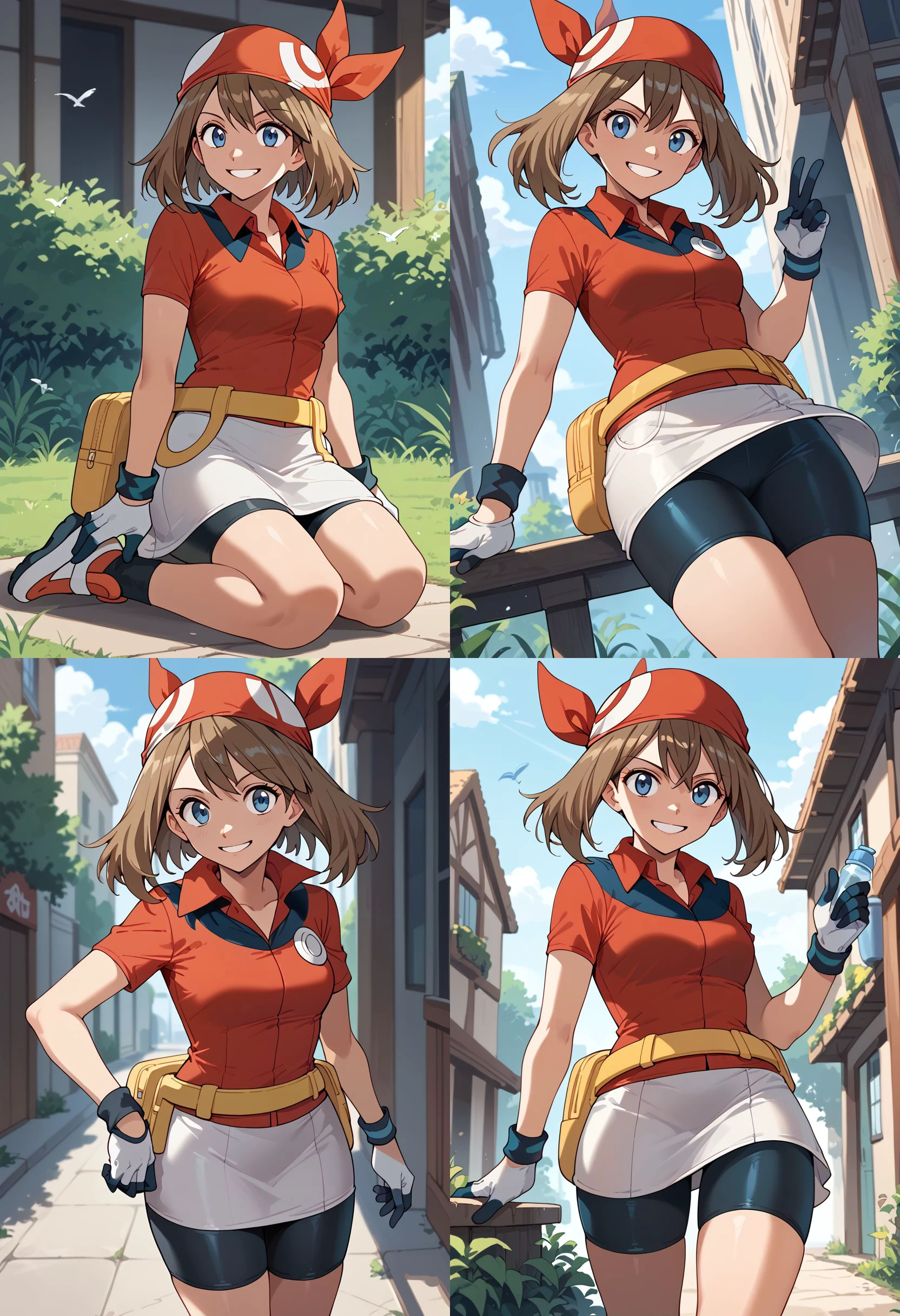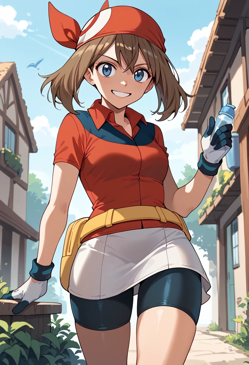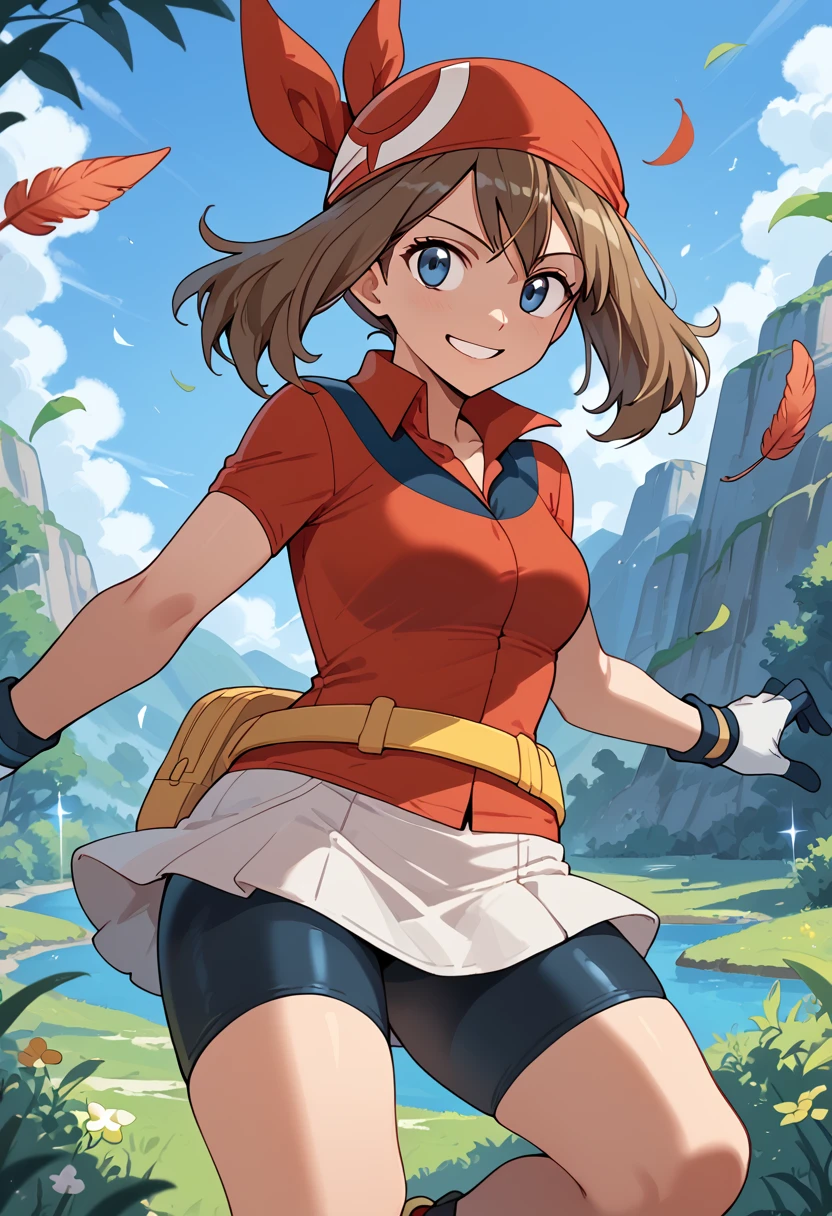 May_RS, medium hair, brown hair, blue eyes, red bandana, collared shirt, red shirt, short sleeves, white gloves, fanny pack, yellow belt, white skirt, bike shorts under skirt, bike shorts, red footwear,