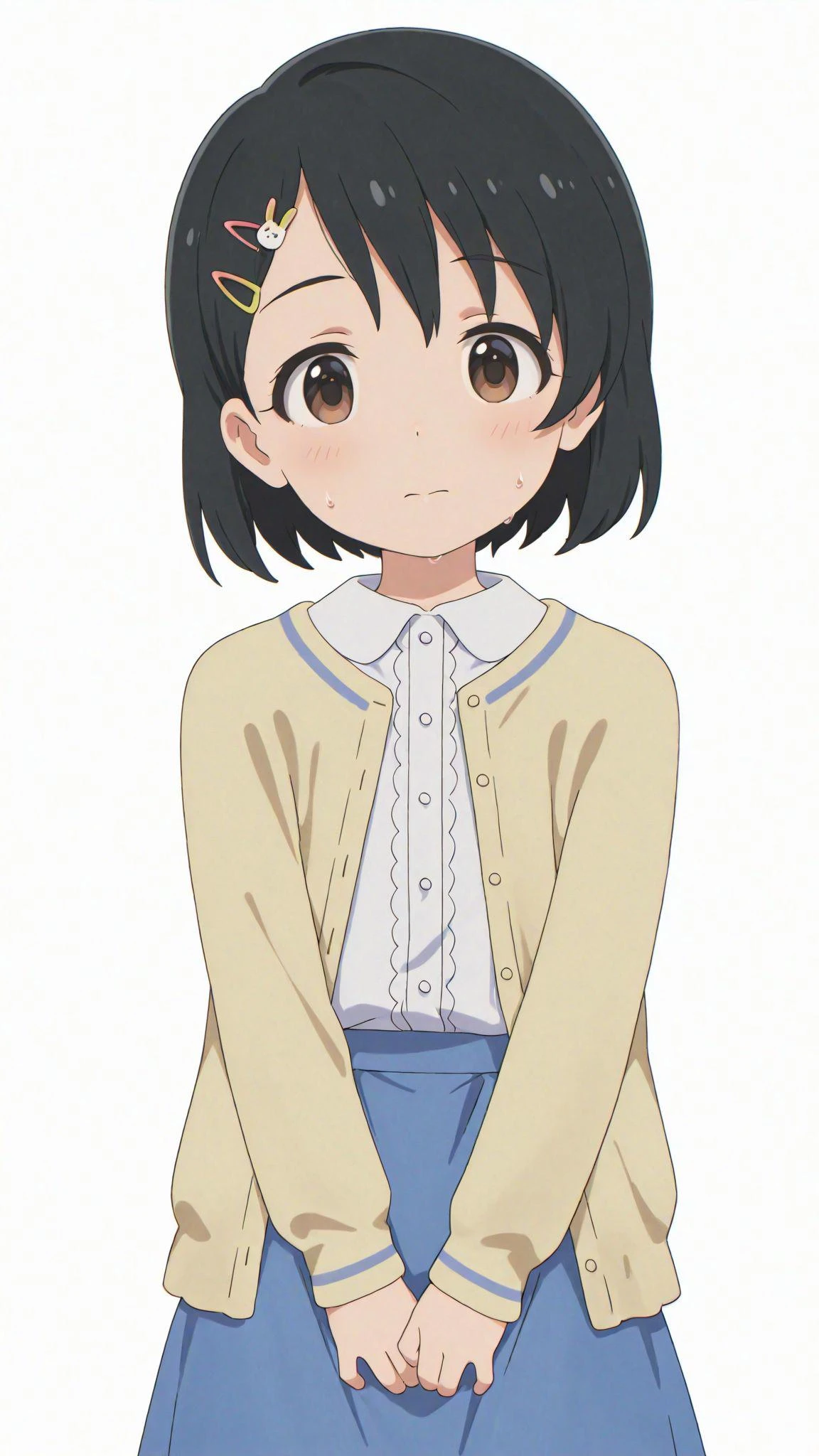 Prompt: sasakichie,black hair,short hair,hairclip,brown eyes,cardigan,white blouse,blue skirt
