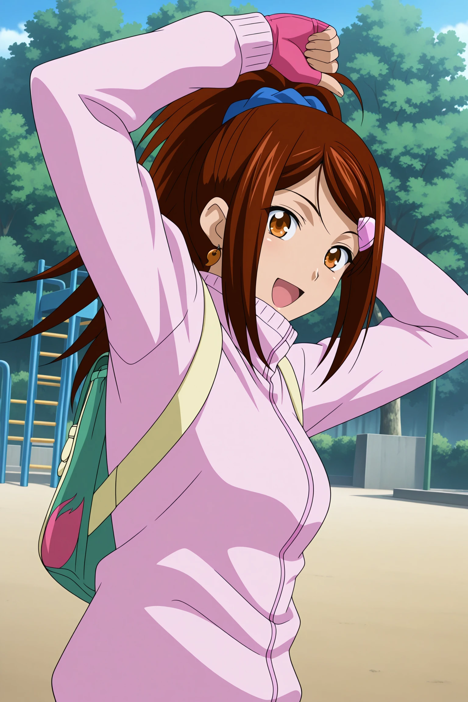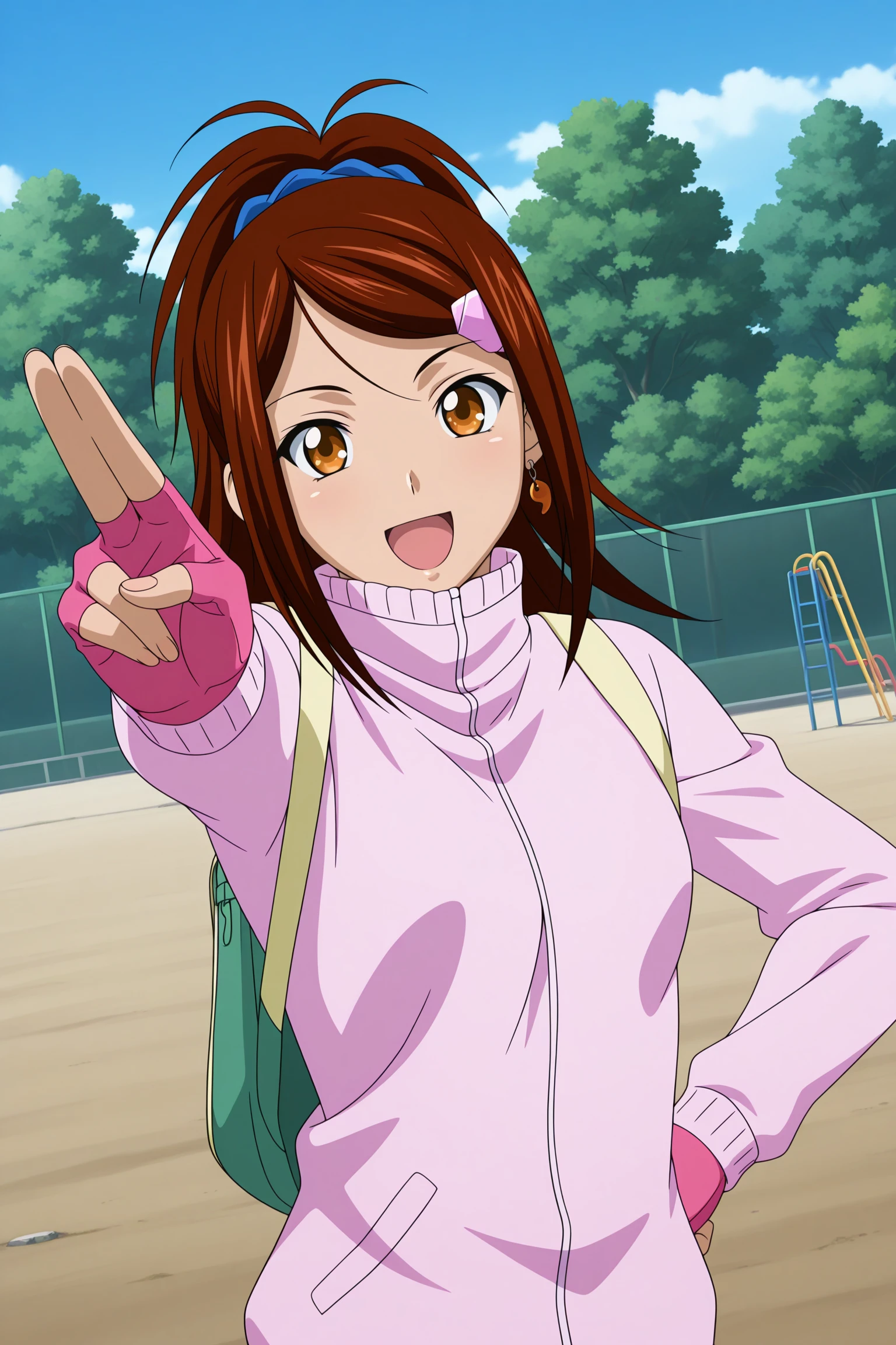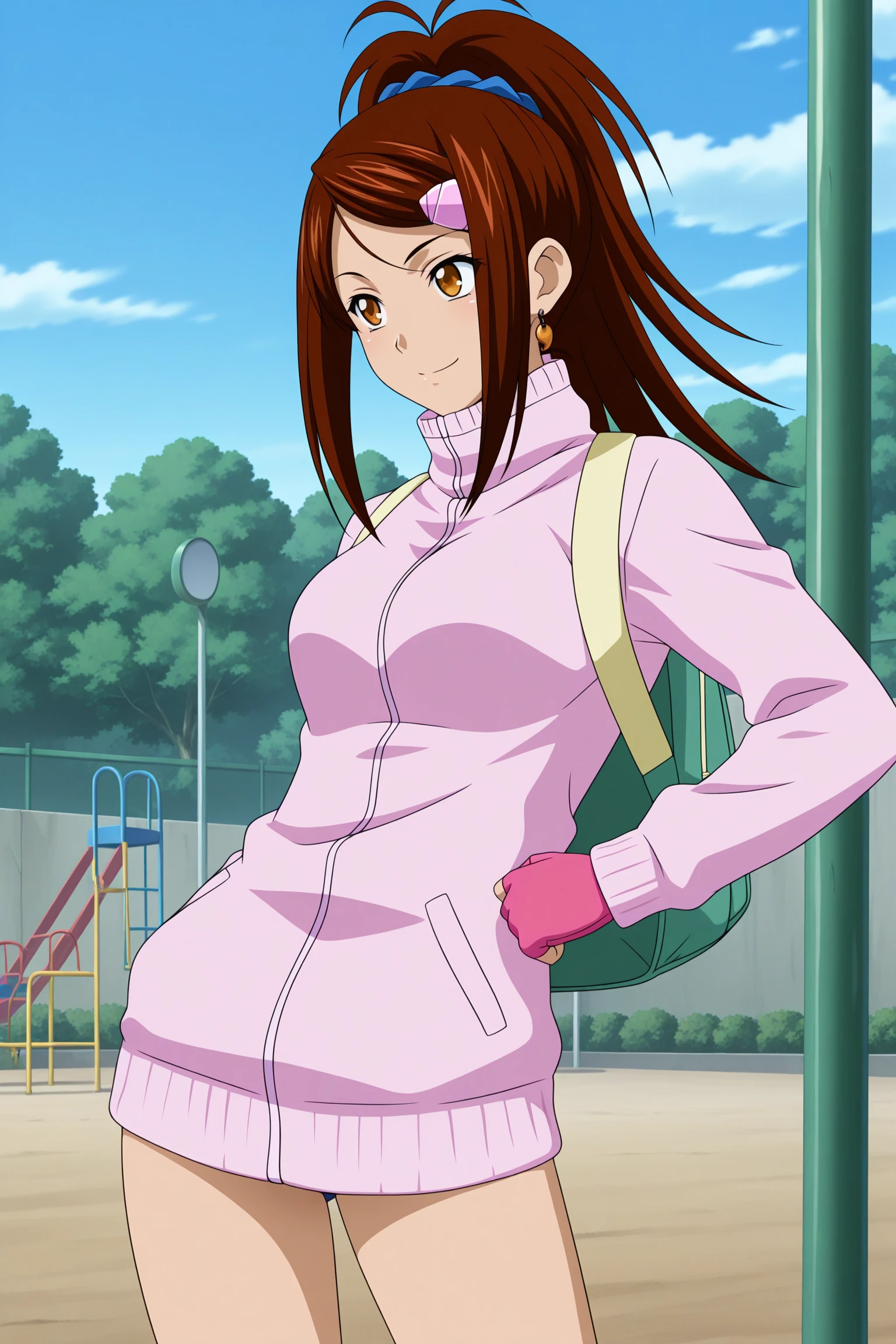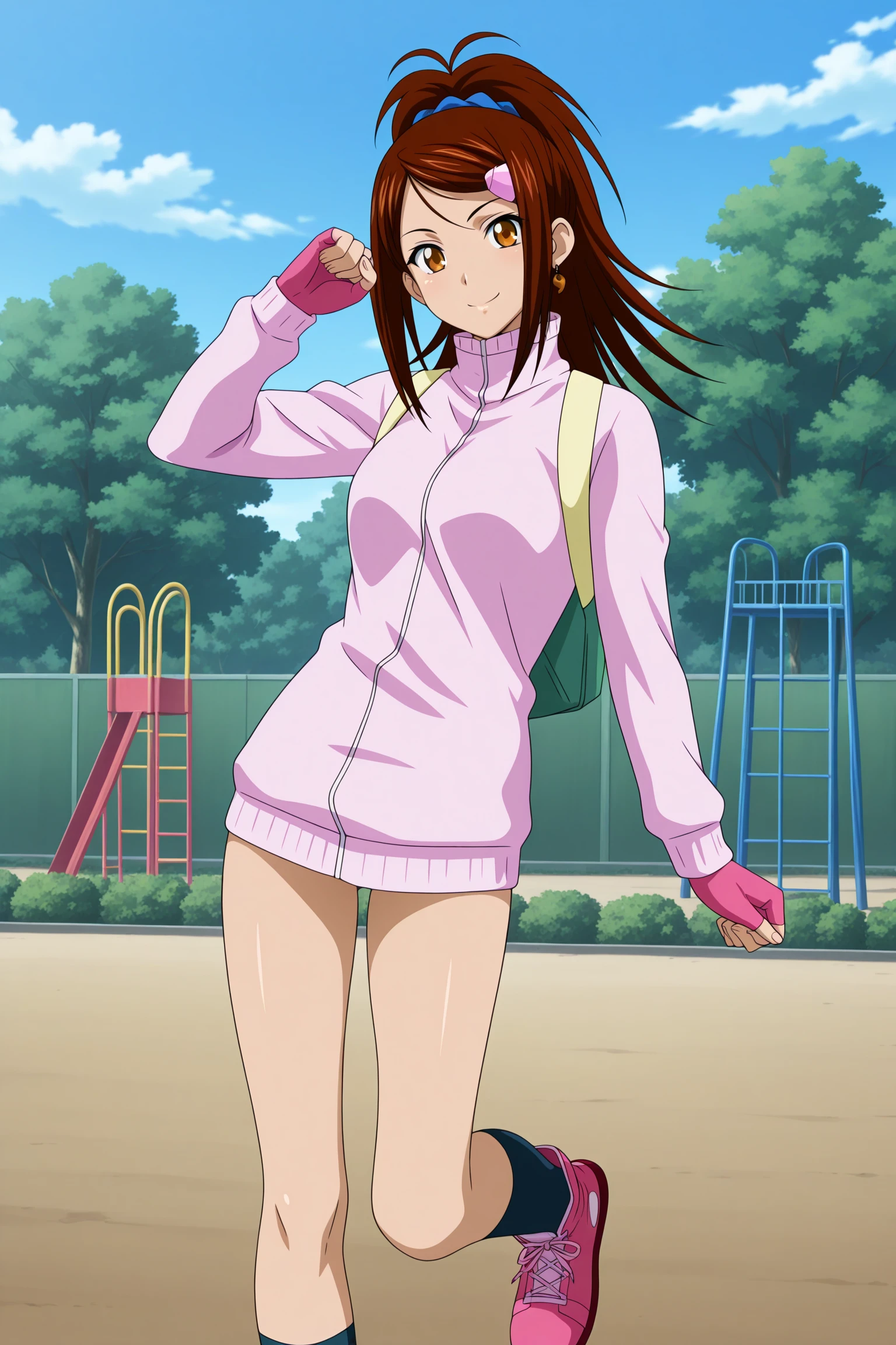 bachou mouki, long hair, brown hair, ponytail, hair scrunchie, hairclip, sidelocks, parted bangs, brown eyes, magatama earrings, single earring, long sleeves, pink jacket, track jacket, high collar, pink gloves, fingerless gloves, backpack, blue socks, kneehighs, pink footwear, high topsDescription