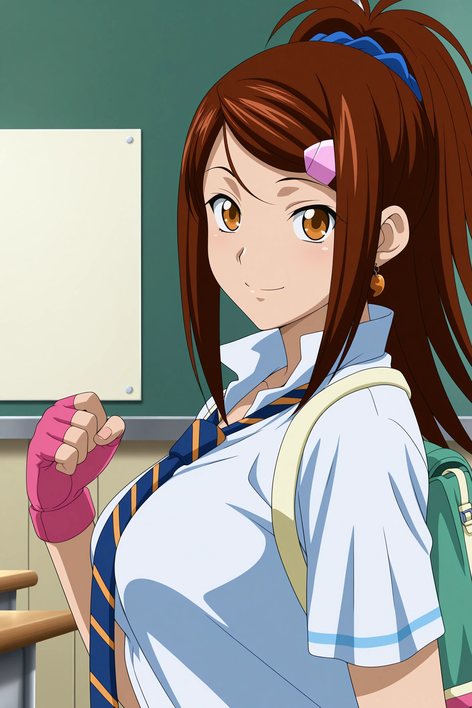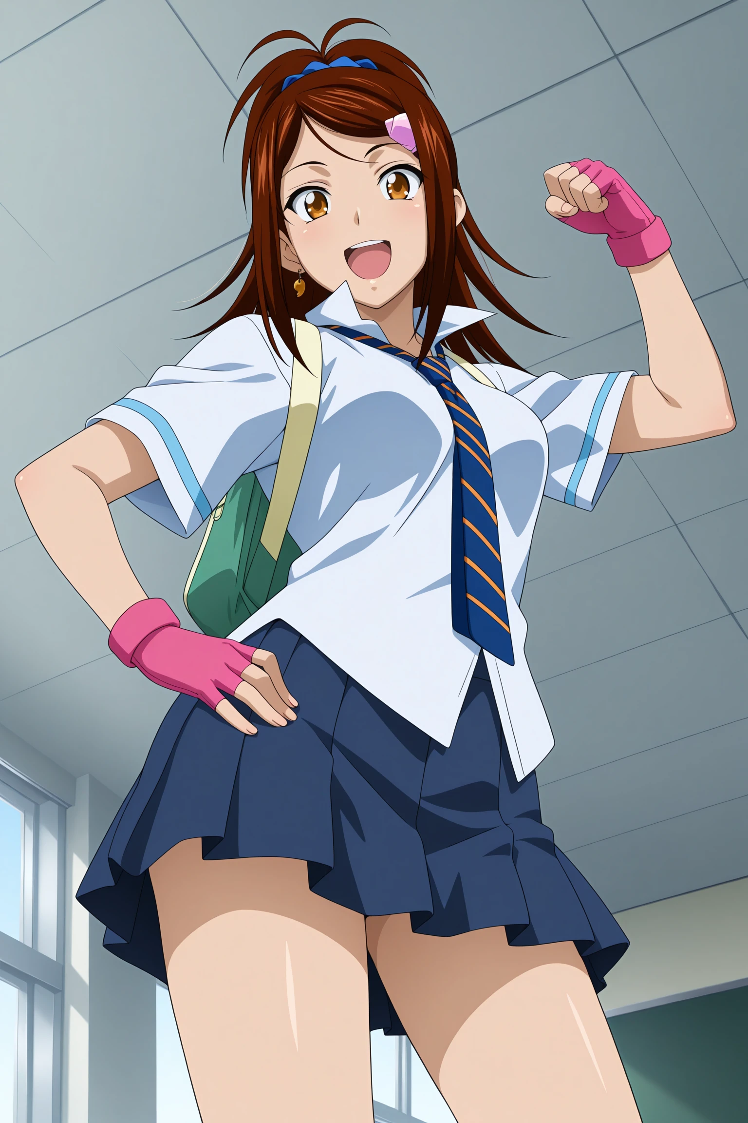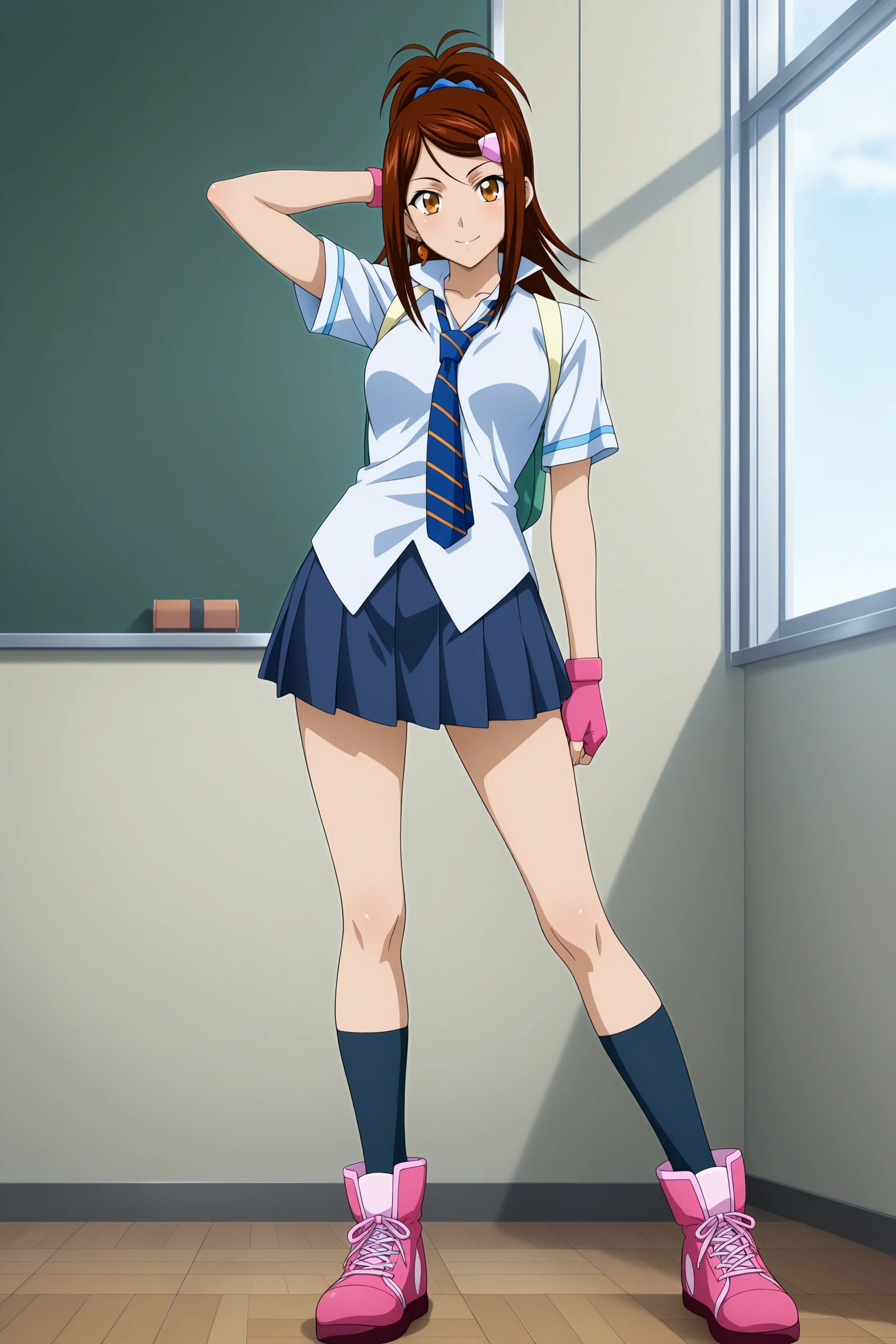 bachou mouki, long hair, brown hair, ponytail, hair scrunchie, hairclip, sidelocks, parted bangs, brown eyes, magatama earrings, single earring, short sleeves, white shirt, collared shirt, high collar, blue necktie, striped necktie, pink gloves, fingerless gloves, backpack, untucked shirt, blue skirt, pleated skirt, blue socks, kneehighs, pink footwear, high tops