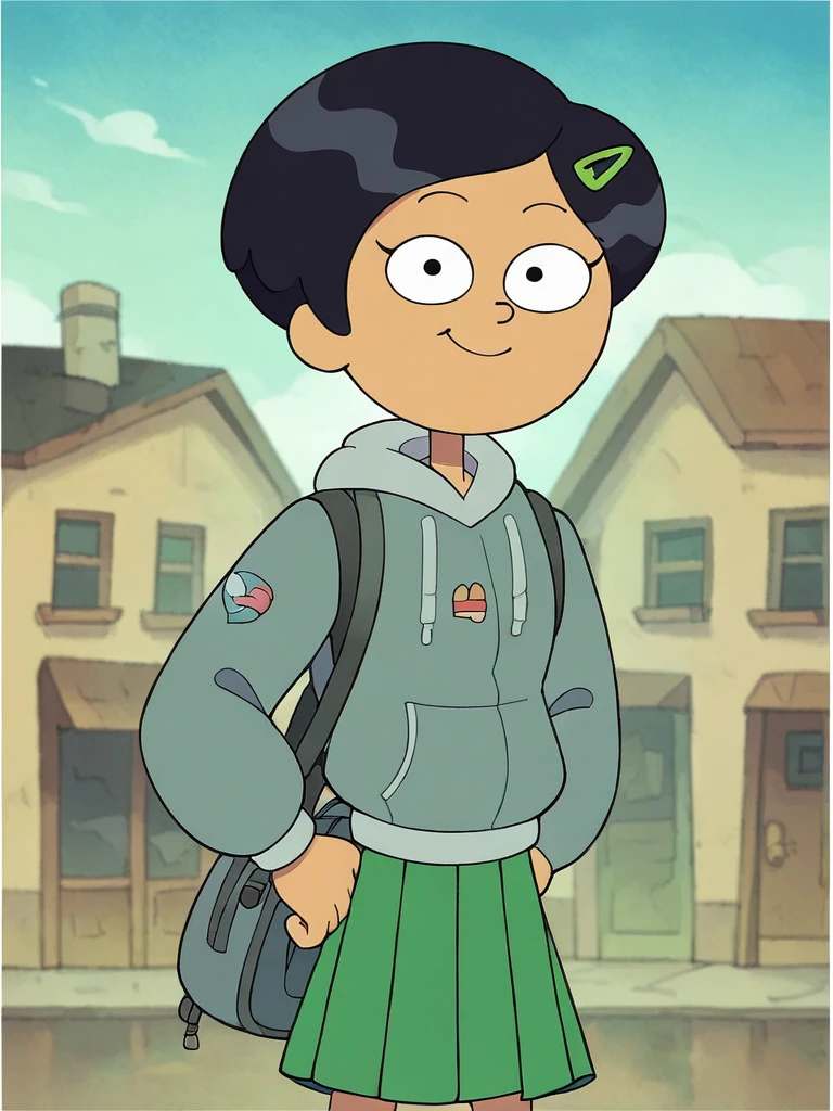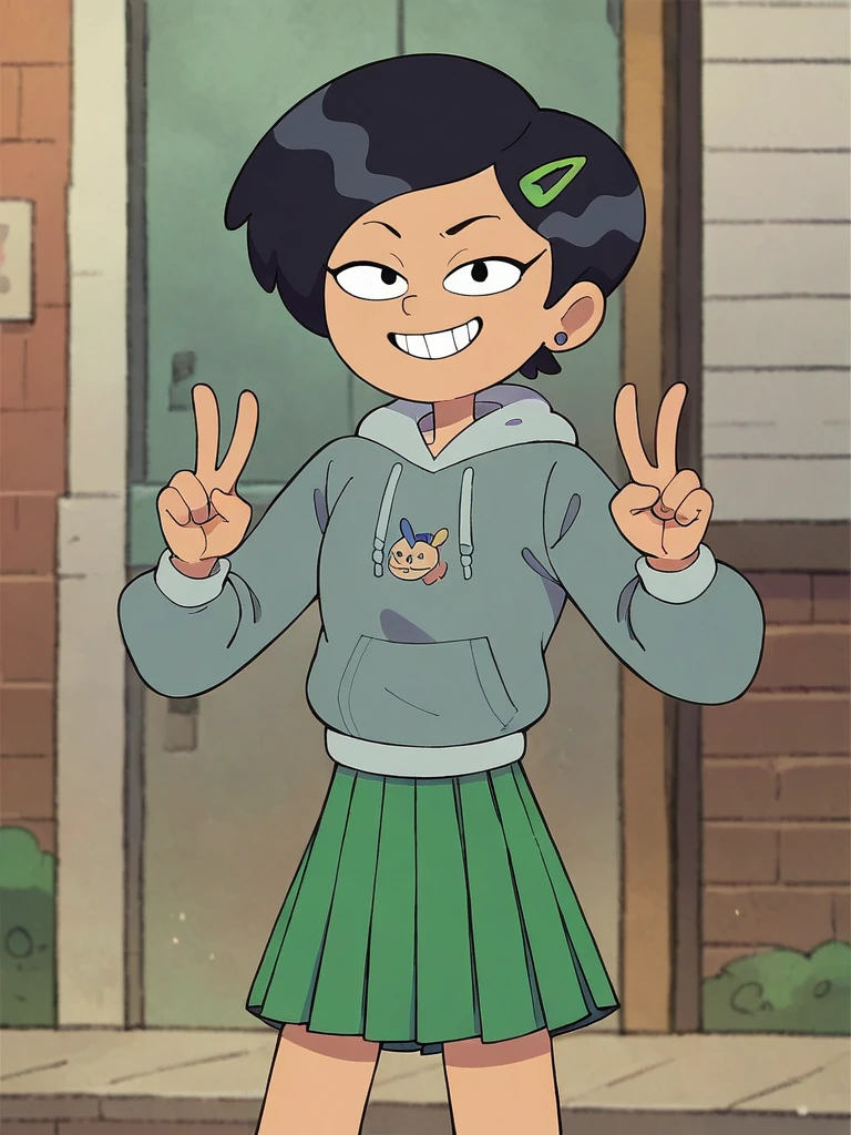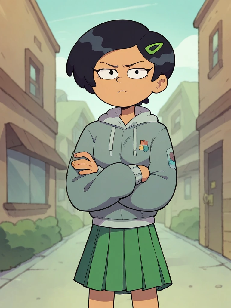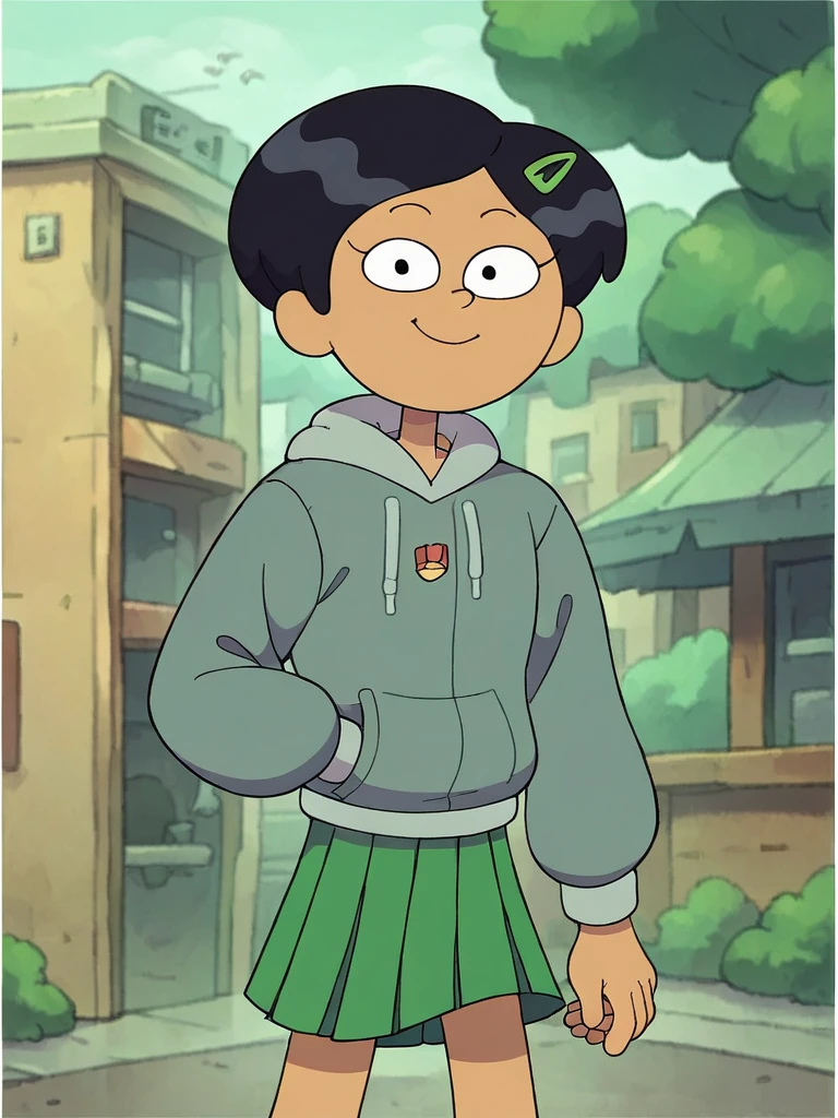 School: grey hoodie, green skirt, pleated skirt,