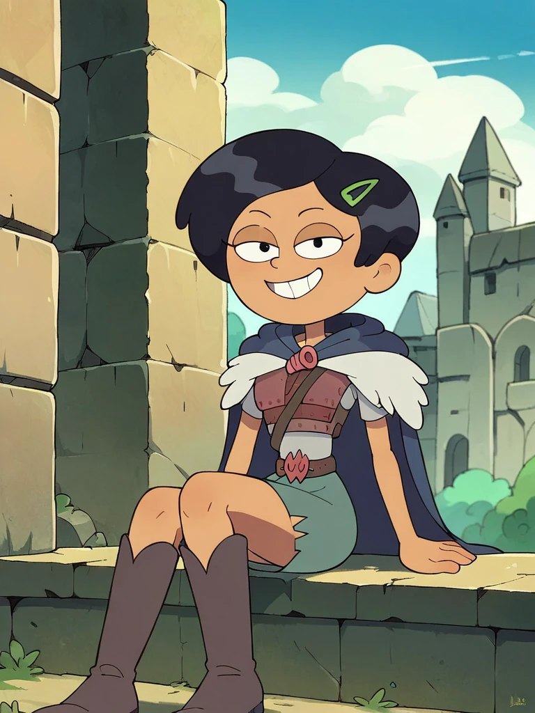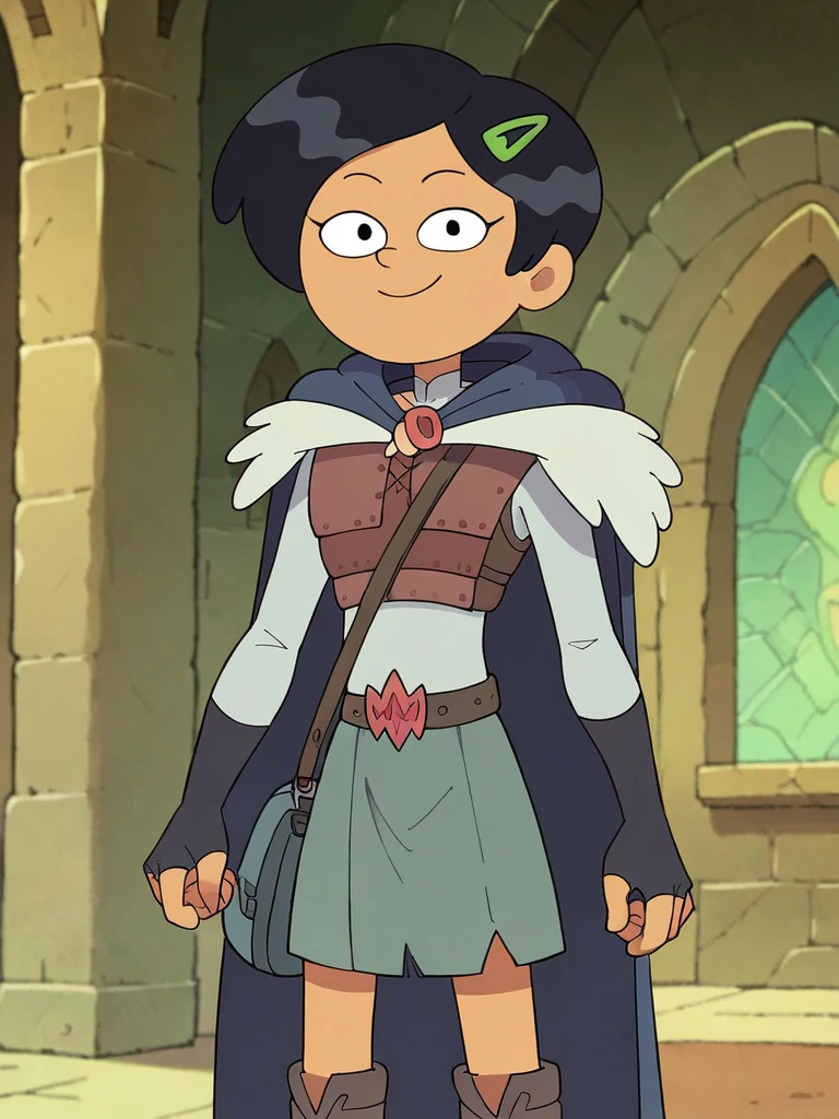 Armor: armor, grey skirt, black cape,