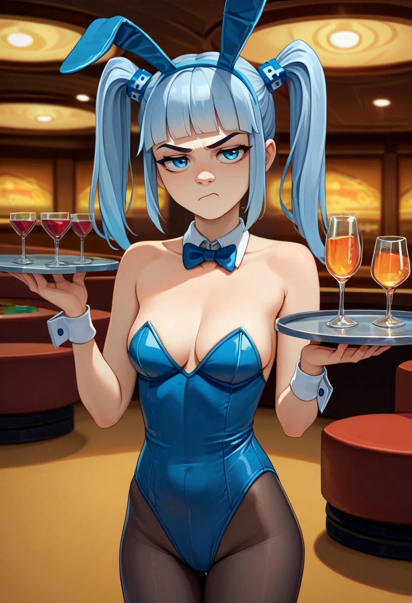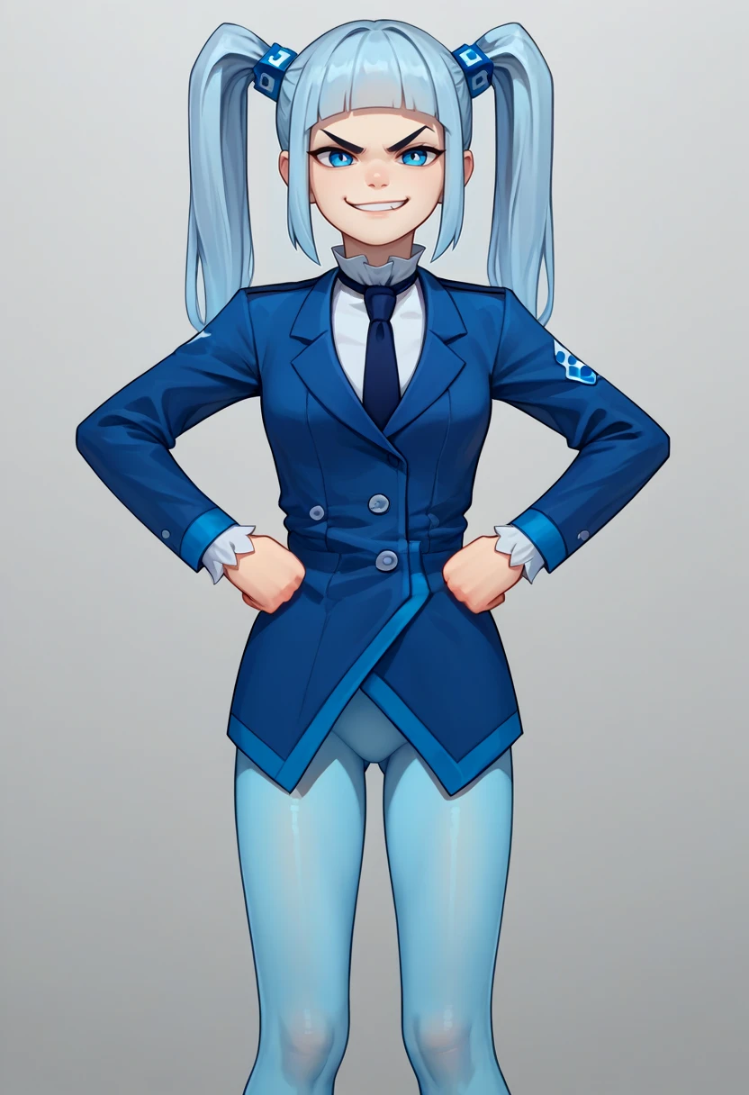 Default Outfit: blue jacket, necktie, long sleeves, blue pantyhose