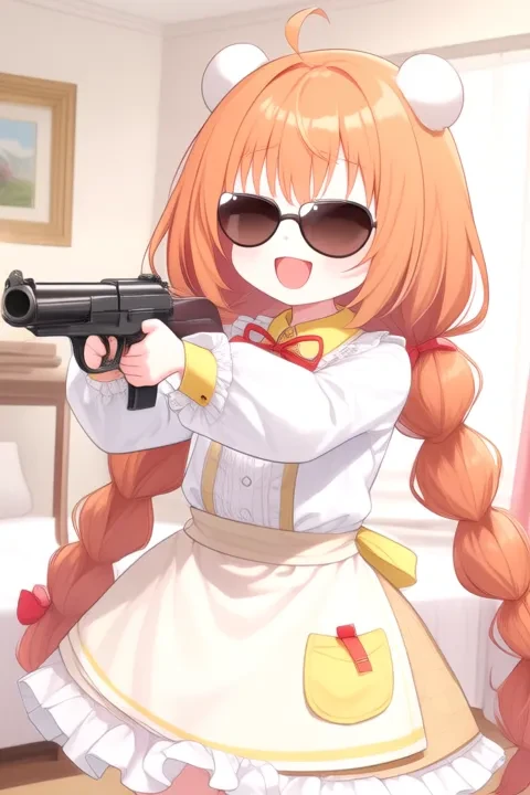 sample prompt:Kirara Tamako, anime-style girl. The image features an anime-style character with long, orange hair styled in twin pigtails. The hair is adorned with small, white bear ears on the top of each head. The character has large, expressive eyes that are brown. They have a cheerful expression.The character is wearing a white blouse with ruffled sleeves and a yellow collar. The blouse has a red ribbon tied around the neck and a small bow at the front. The character's outfit also includes a light-colored skirt with a red stripe down the side and a small pocket on the left side. The overall attire suggests a playful and cute style, possibly inspired by a school uniform or a costume. The apron also has a small pocket on the left side. Her outfit includes a white skirt with a ruffled hem and a yellow belt. (she is dancing:2.5), (chibi Nendoroid:3.5) in bedroom.