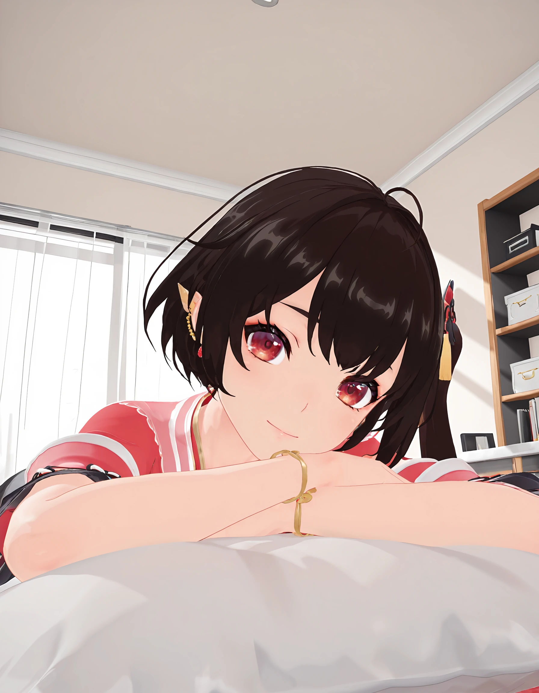 <lora:yousa_DaXi_Illustrious:1>, yousadaxi, red eyes, hair ornament, ahoge, black hair, bangs, side ponytail, earrings, dress, see-through sleeves, long sleeves, black gloves, thigh strap, red footwear,