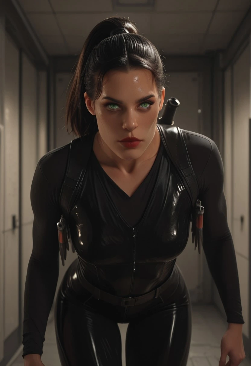 PHOTO-REALISTIC, REALISTIC, noir shelob, shelob, black hair, sharp eyes, bodysuit, femme fatal, CINEMATIC,
