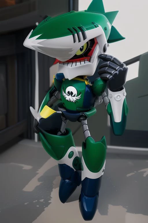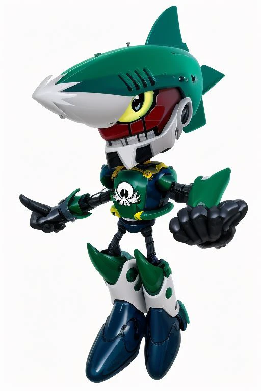 Prompt: Johnny, green robot, yellow eye, gray gloves, shark head, Eggman symbol on chest