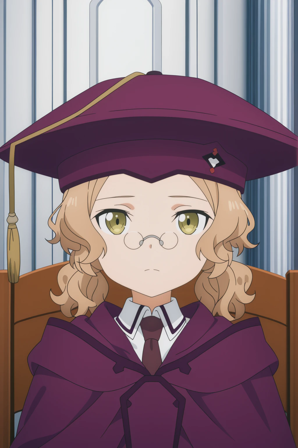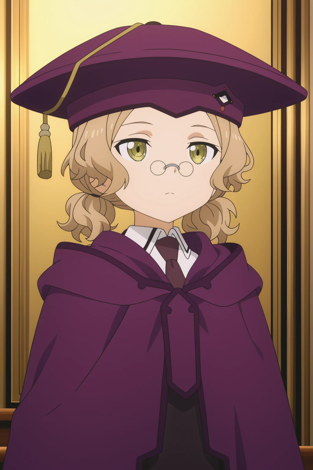 hooded cloak, rimless eyewear, purple necktie, purple cape, hat