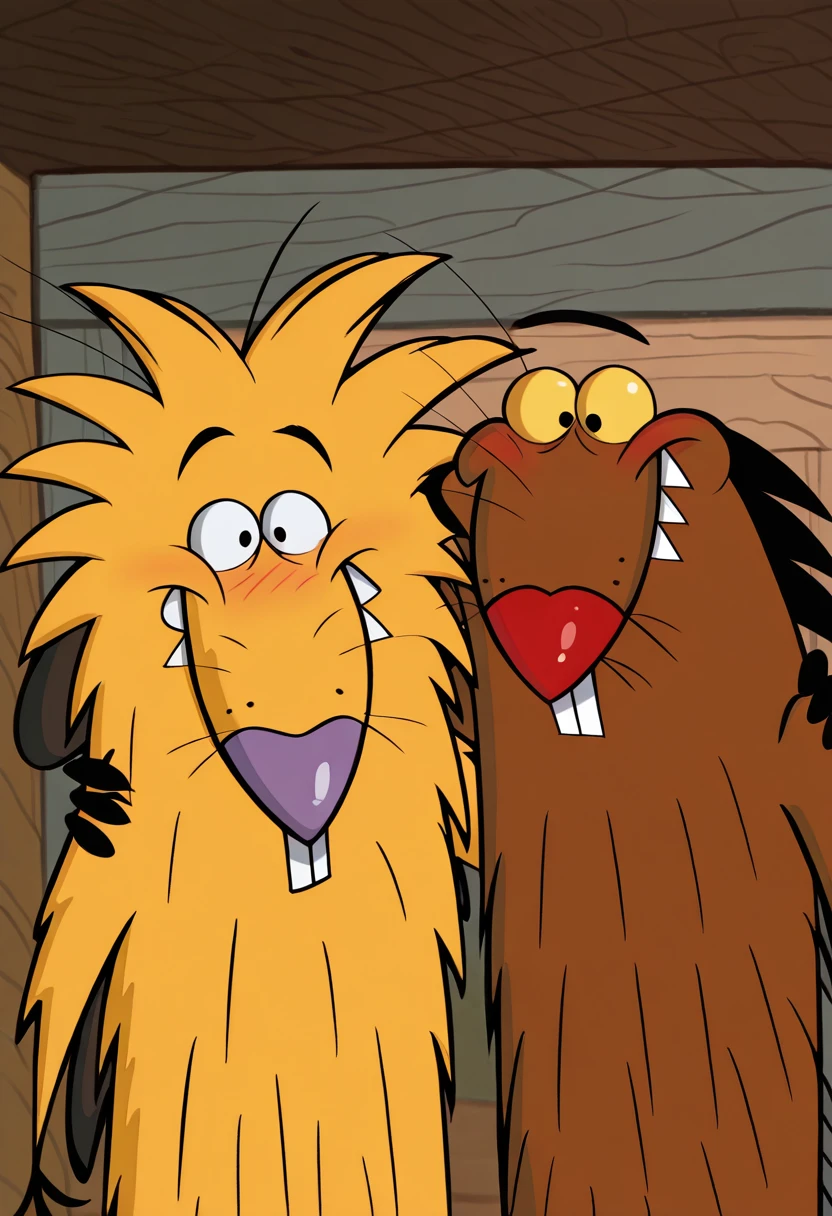 1boy, daggett beaver, furry, furry male, beaver tail, brown fur, black eyes, yellow sclera, red nose, whiskers, buckteeth, sharp teeth,