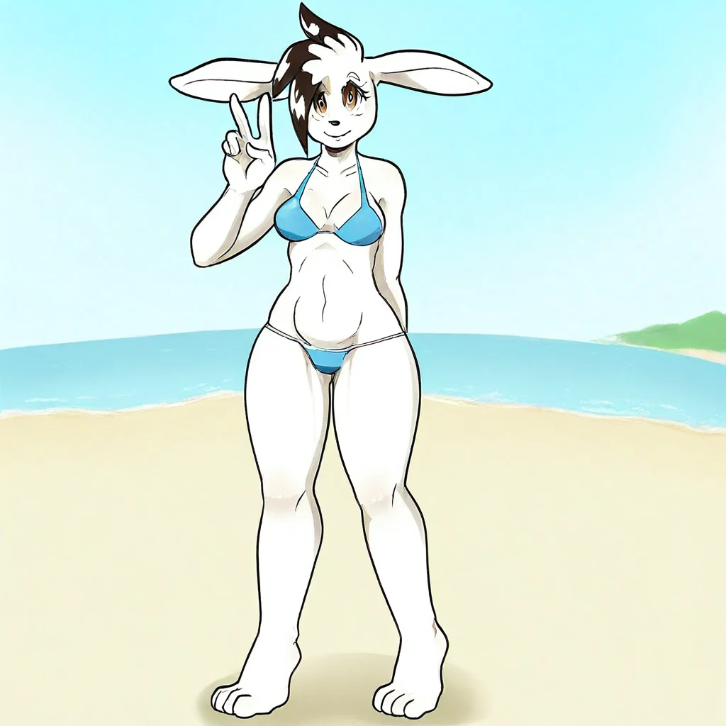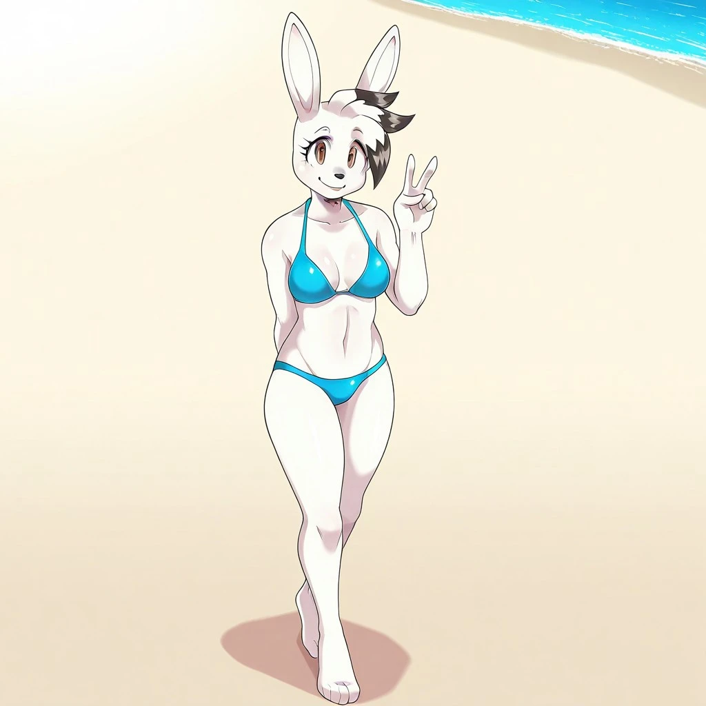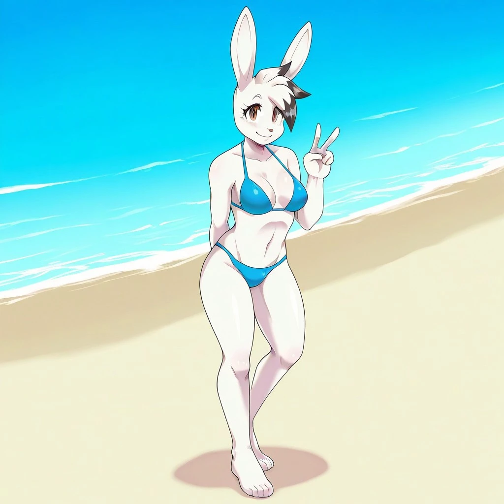 rabbit, bunny girl, white fur, white and black hair, long ears, brown eyes, medium breasts,
