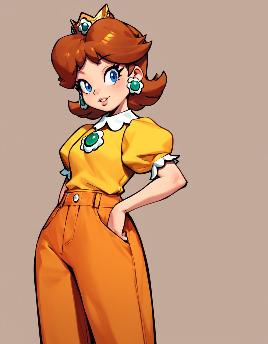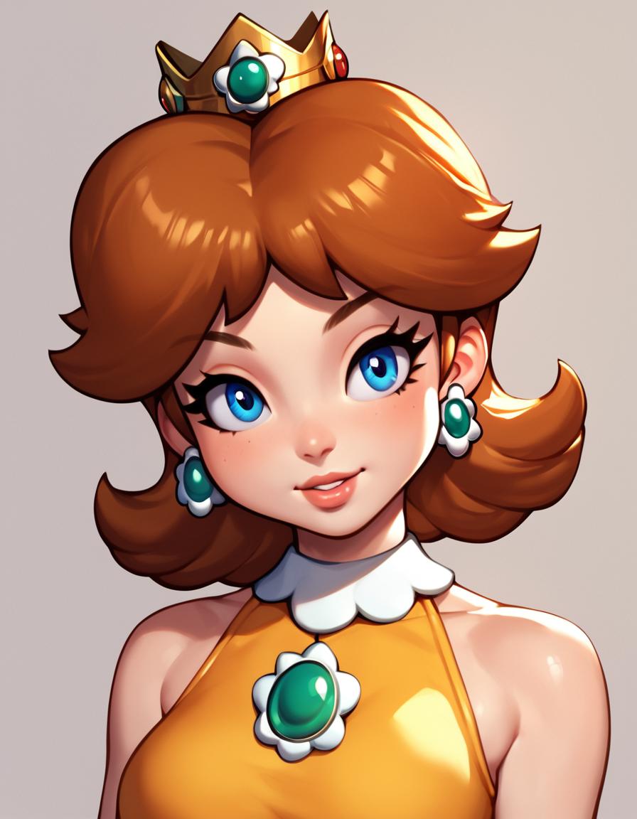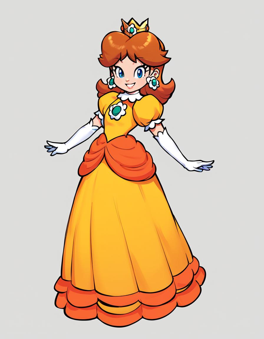 Activation: princess_daisy, dress, elbow gloves, brown hair, blue eyes, flower earrings, crown