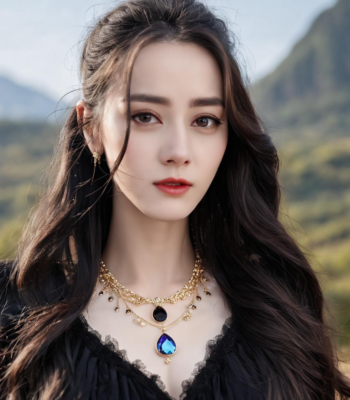 dilreba, 1girl, solo, long hair, shirt, black hair, holding, jewelry, short sleeves, necklace, black shirt,cinematic photo, 4k, highly detailed, uhd image, intricate details