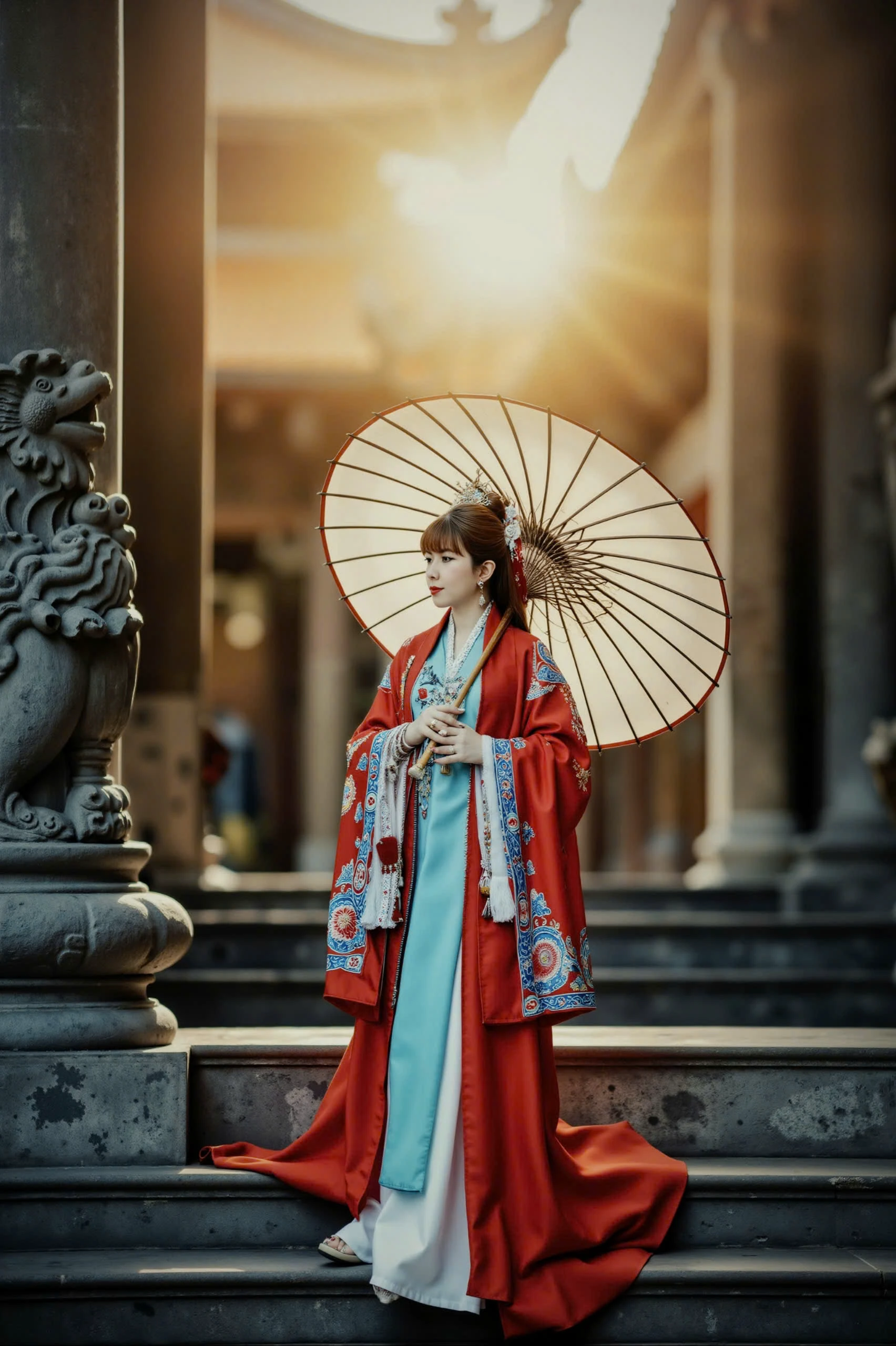 HanoiGirl, ancient, A woman dressed in traditional Chinese Hanfu, adorned with intricate embroidery, stands elegantly on the steps of a historical temple. She holds a large, delicate parasol, which partially shields her from the soft sunlight. Her hair is styled with ornate hairpins and tassels, complementing her red and blue robes. The temple's stone carvings and pillars, featuring dragon motifs, add to the scene's cultural richness. The warm glow of the setting sun enhances the serene and reflective atmosphere, as the woman appears deep in thought, embodying grace and tradition.