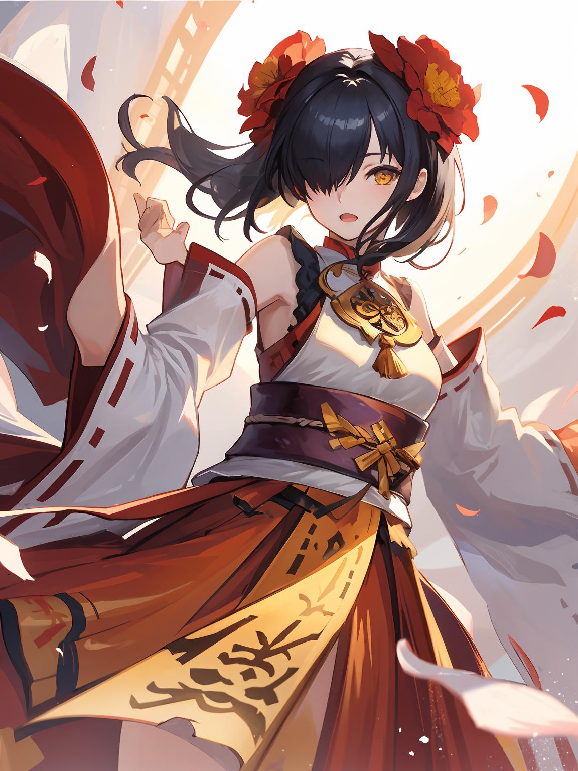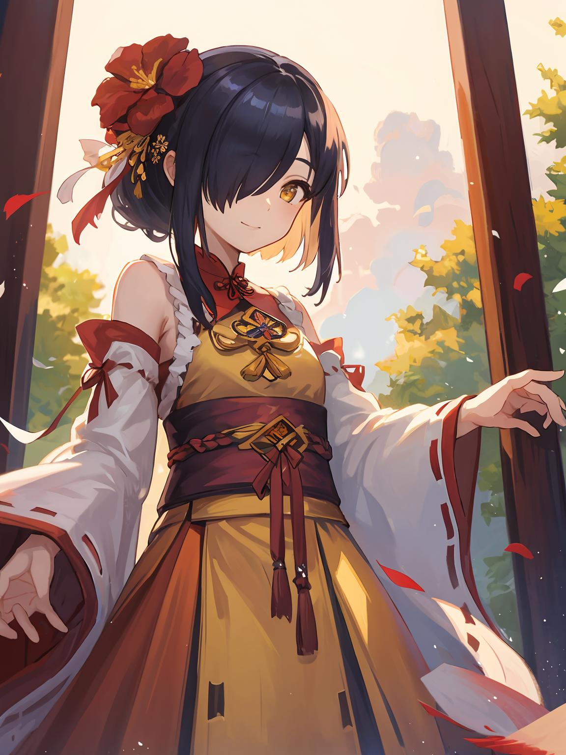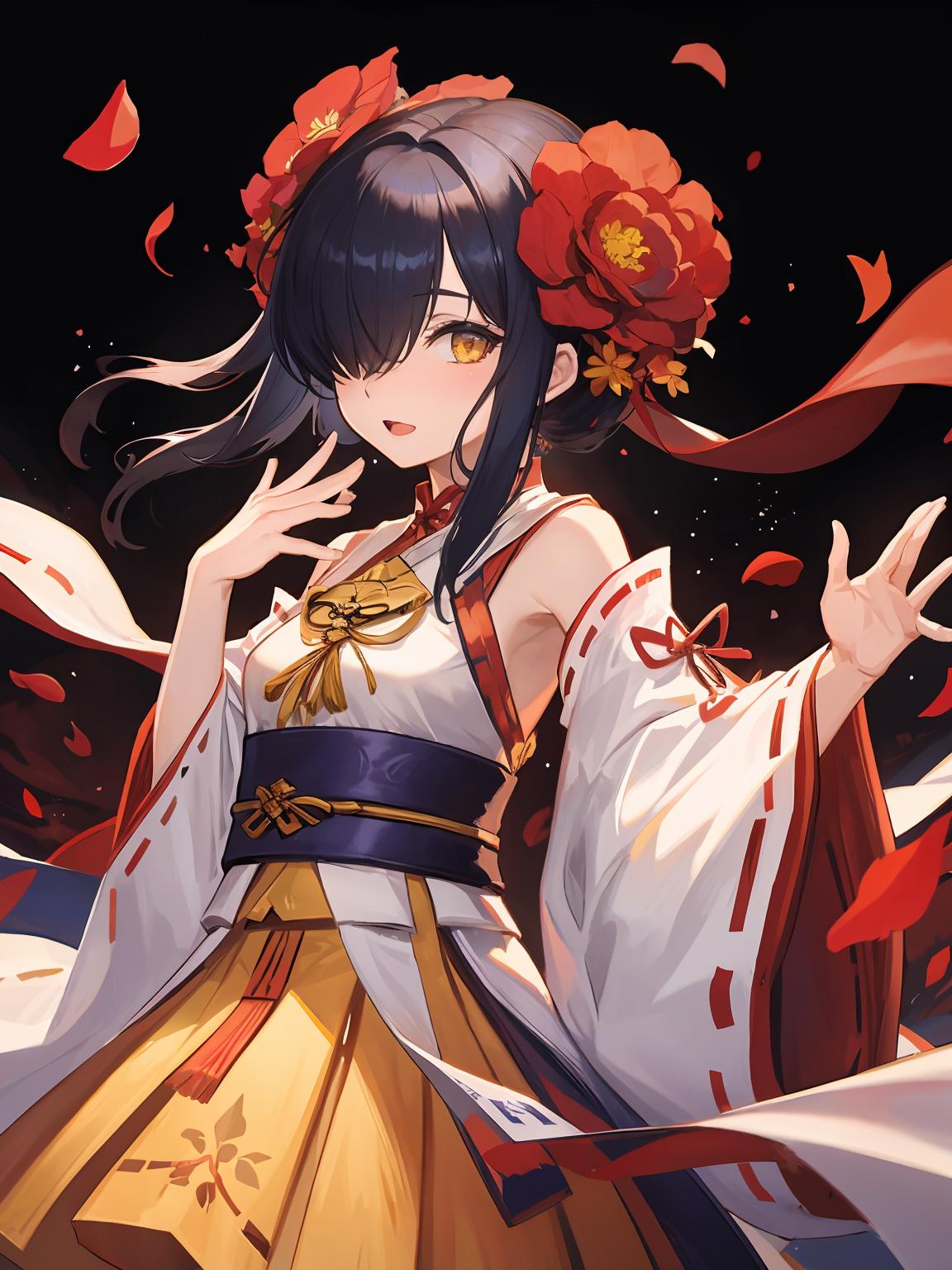 Basic: Black hair,yellow eyes,hair ornament,hair flower,dress(recommend not using color as prompt),miko,obi,detached sleeves,wide sleeves