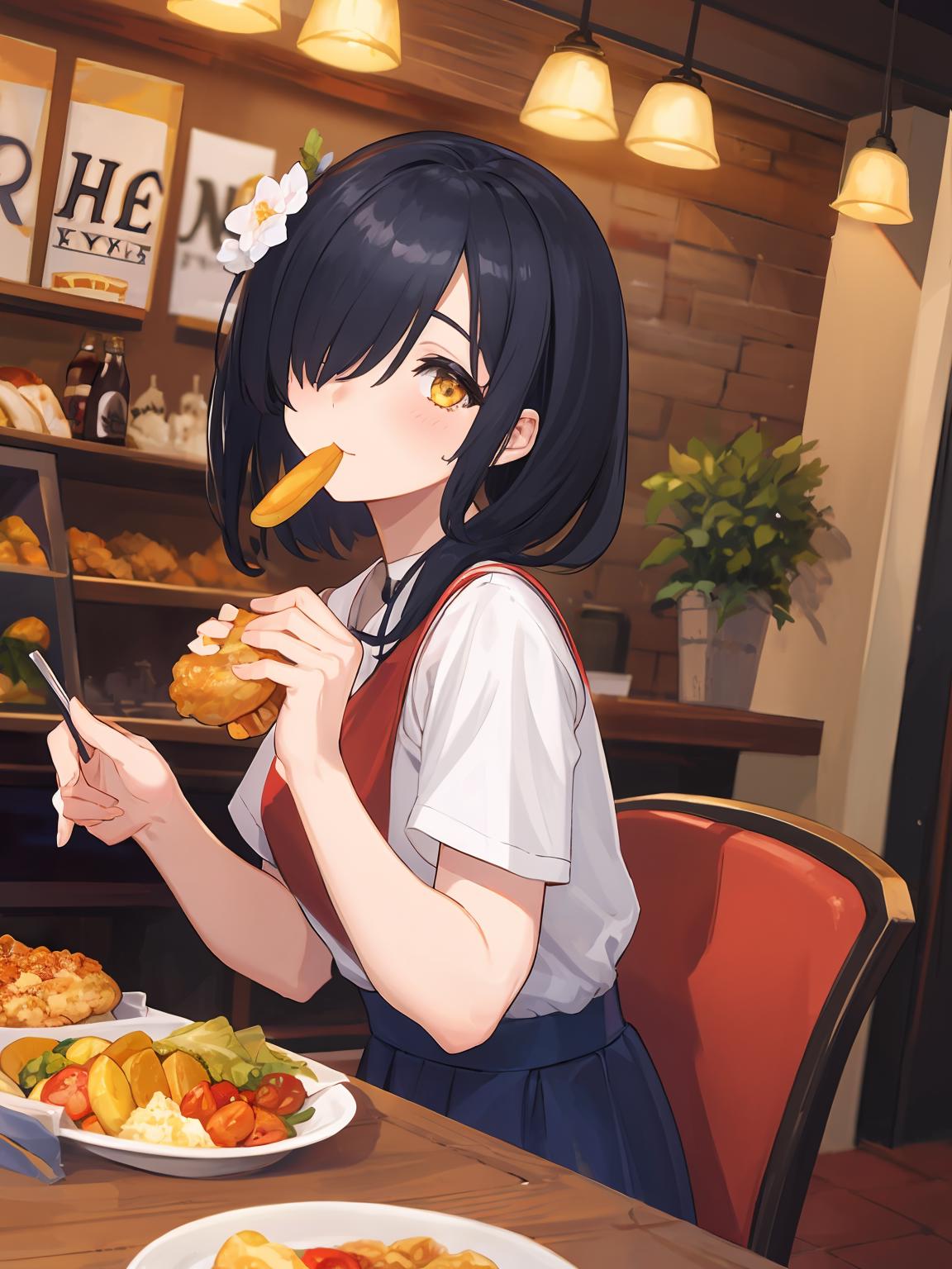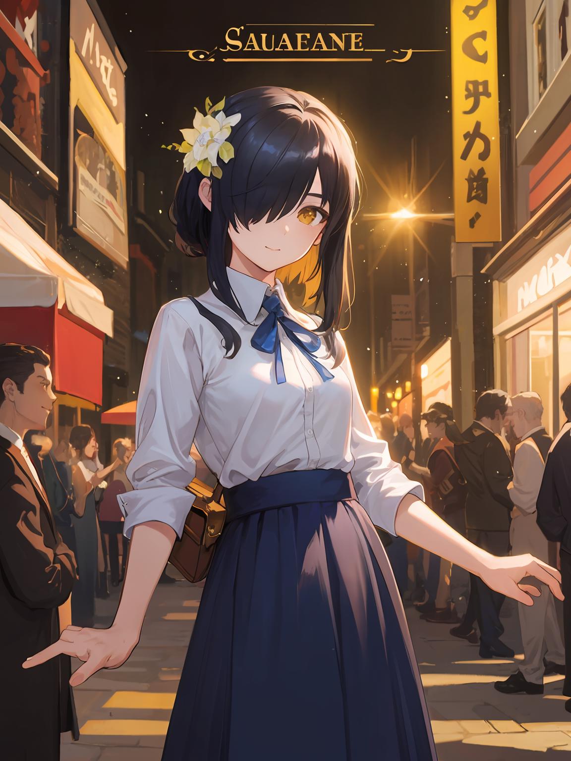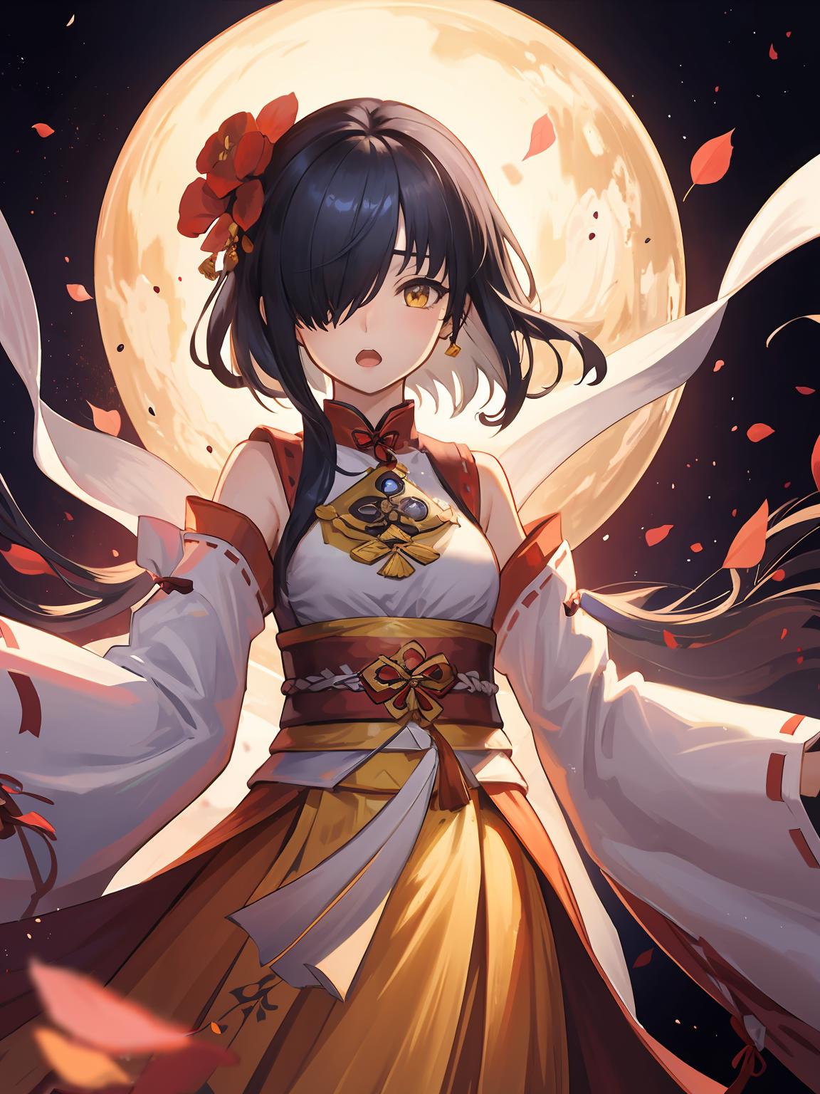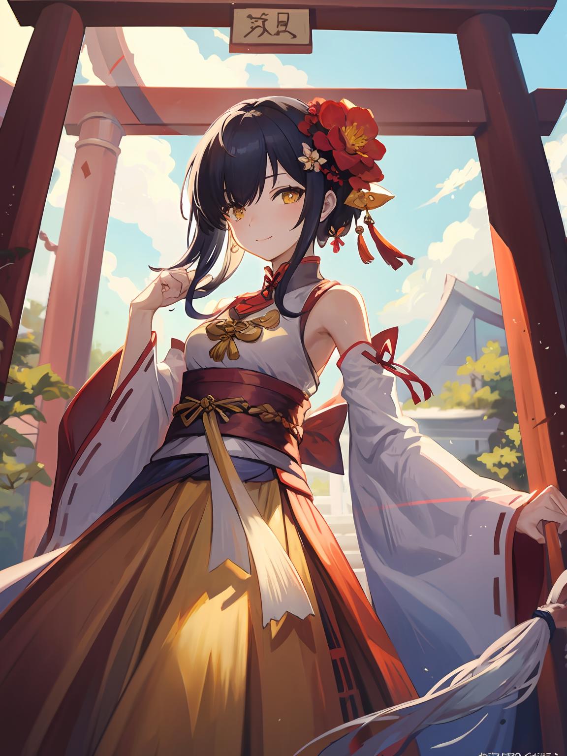 Basic: Black hair,yellow eyes,hair ornament,hair flower,dress(recommend not using color as prompt),miko,obi,detached sleeves,wide sleeves