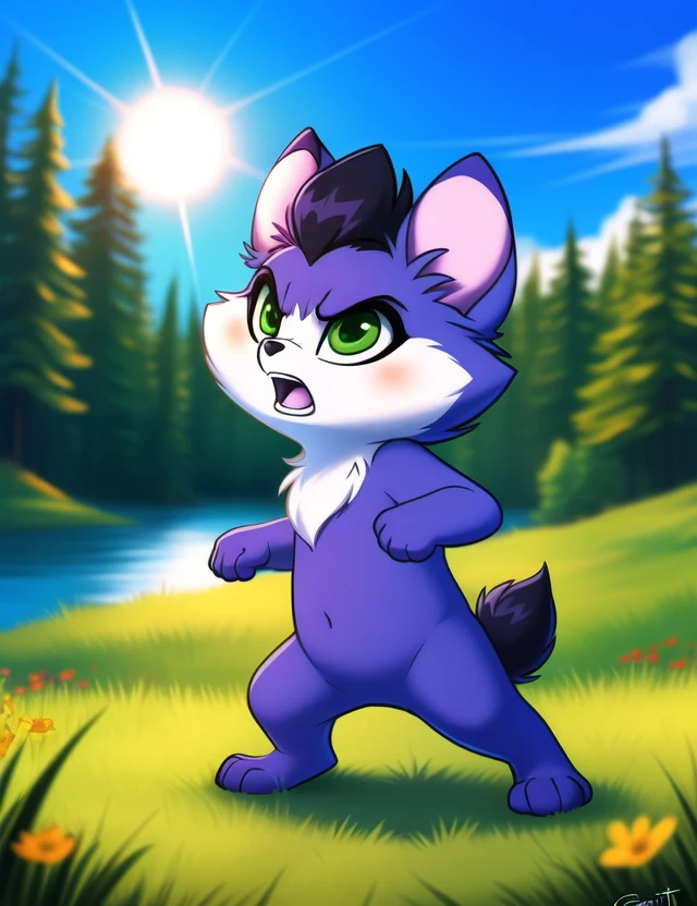 AmaruLoliRock, purple fur, green eyes, black tail, chibi, ( ass up rear view, looking back,)
