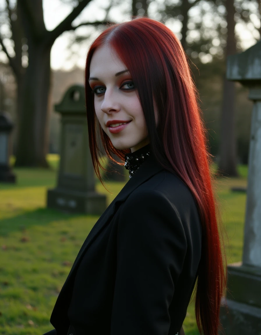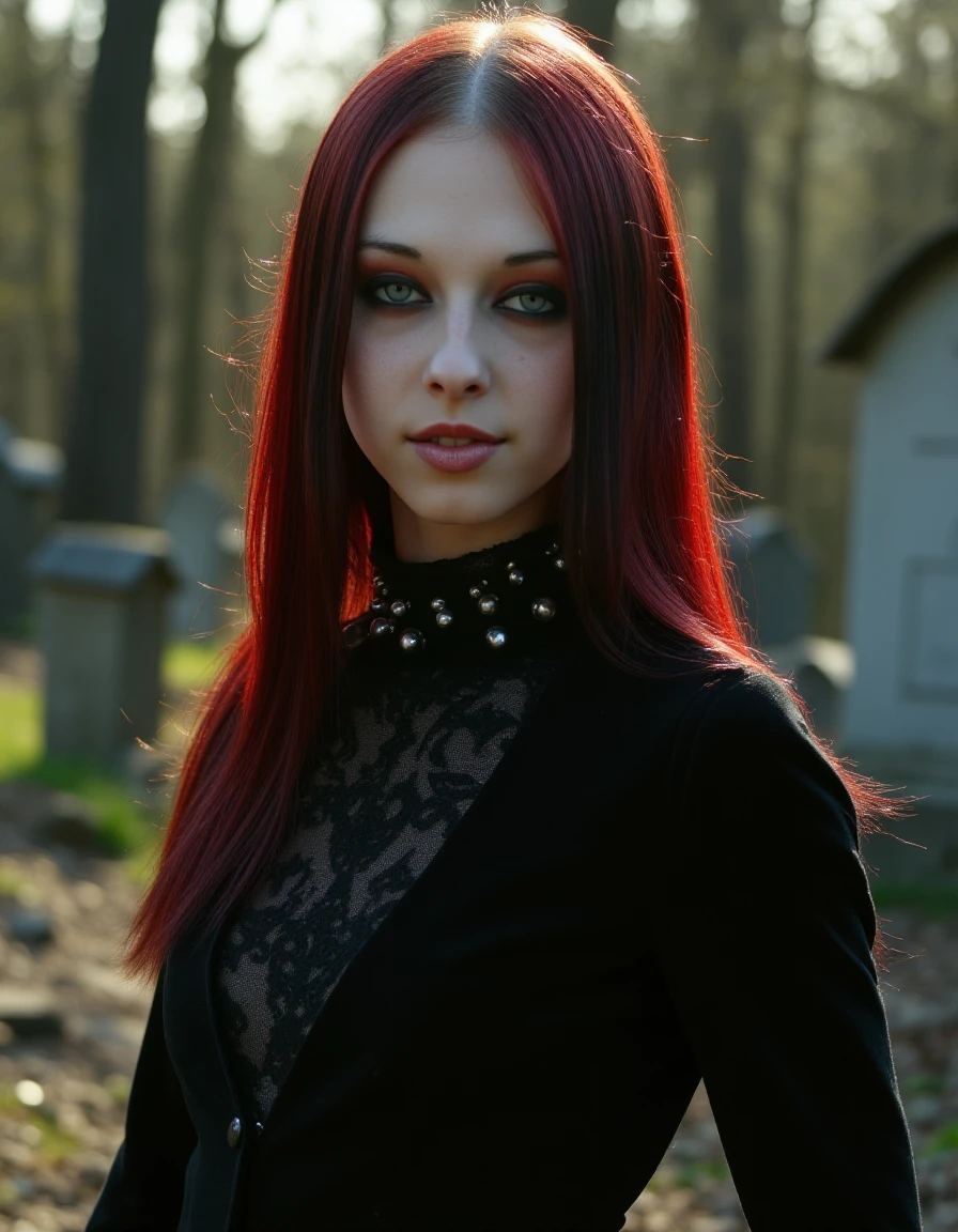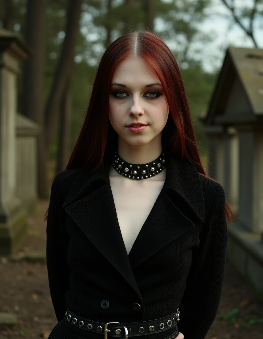 a photo of a lizvicious in a beautiful graveyard with a light fog all around, she has long dark red hair in an emo style with blue eyes and freckles, there are wiccan symbols and and candles and other gothic witch aesthetics, she has makeup on and is wearing a black choker with emo style, she is smiling with delicate soft pale skin