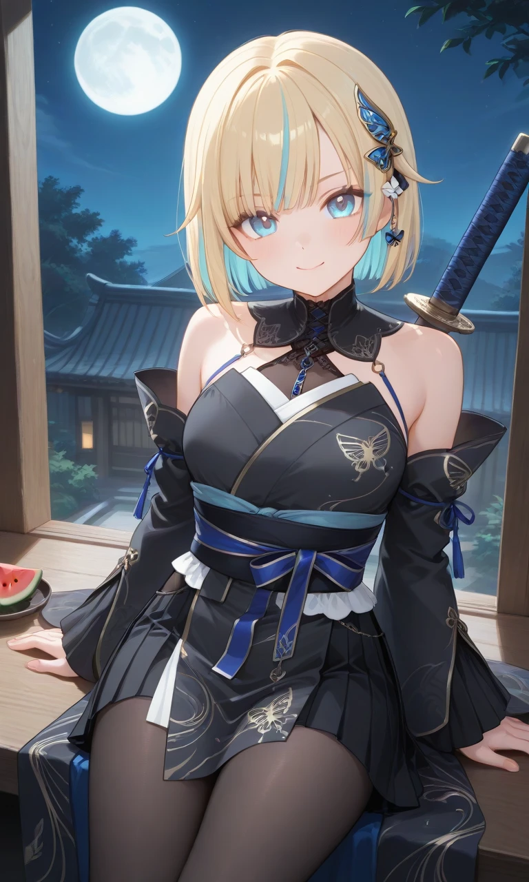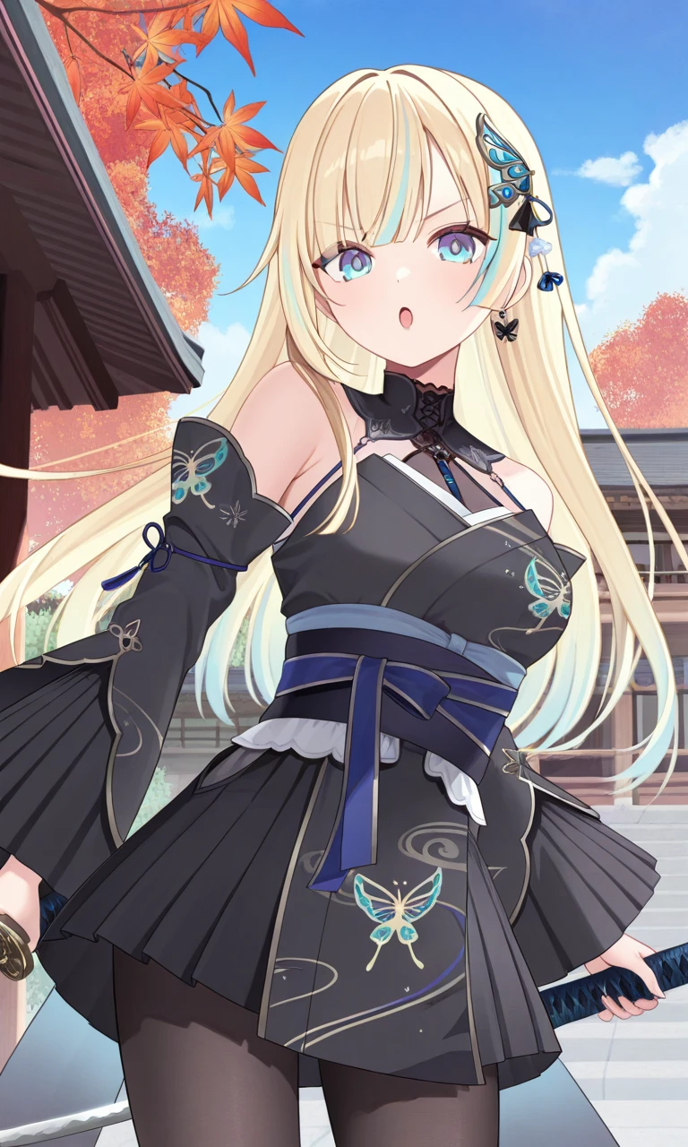 japanese clothes, black kimono, detached sleeves, wide sleeves, buterfly print, obi, black pantyhose