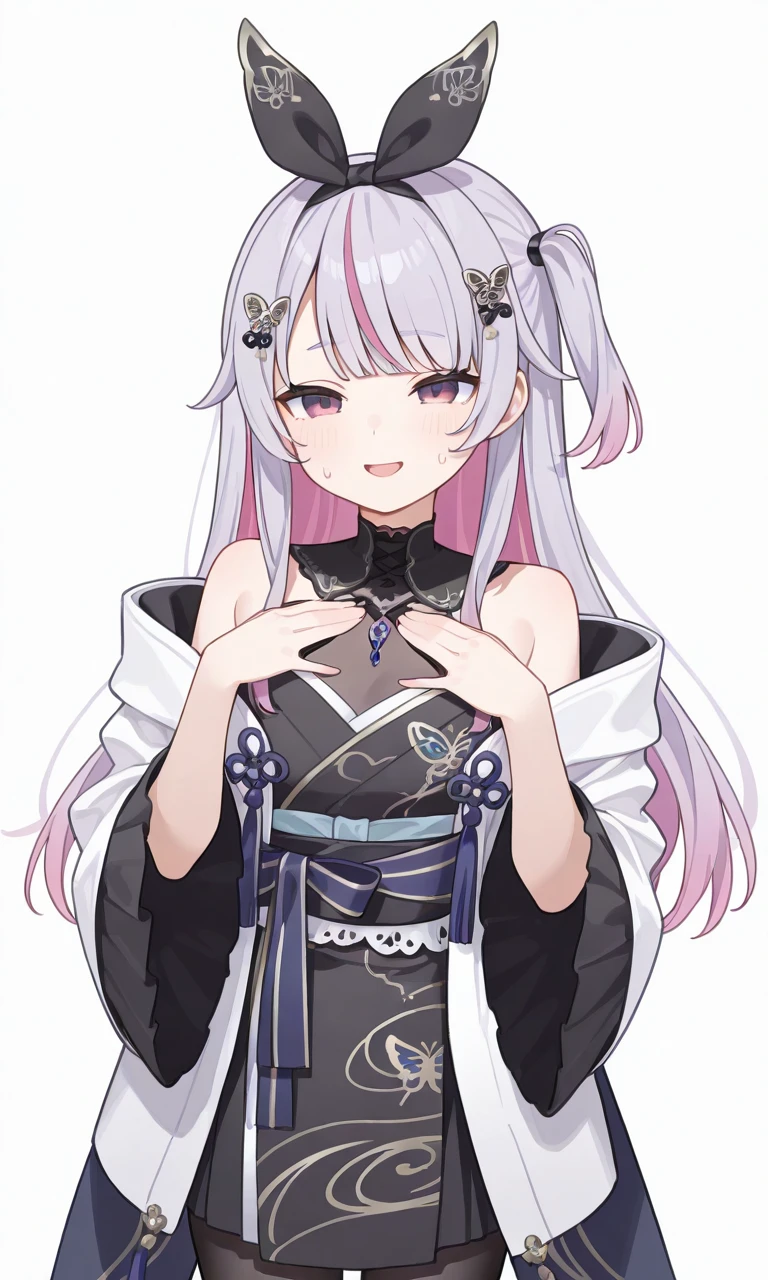 japanese clothes, black kimono, white jacket, flower knot, wide sleeves, off shoulder, buterfly print, obi, black pantyhosejacketless :