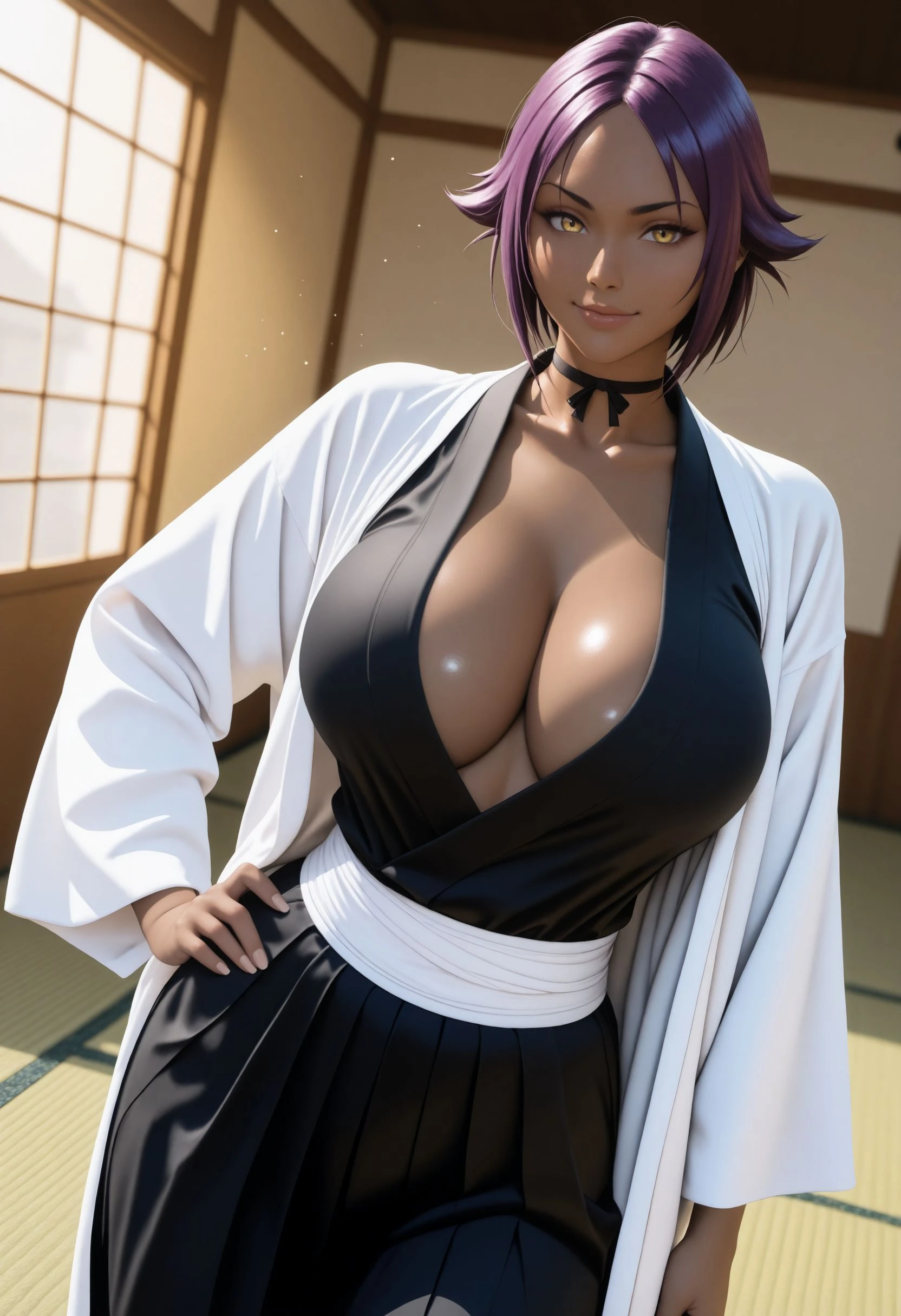 Captain Outfit w/ Haori: captain_yoruichi, short hair, black choker, black kimono, sideless kimono, sleeveless, black elbow gloves, sash, hip vent, white haori,