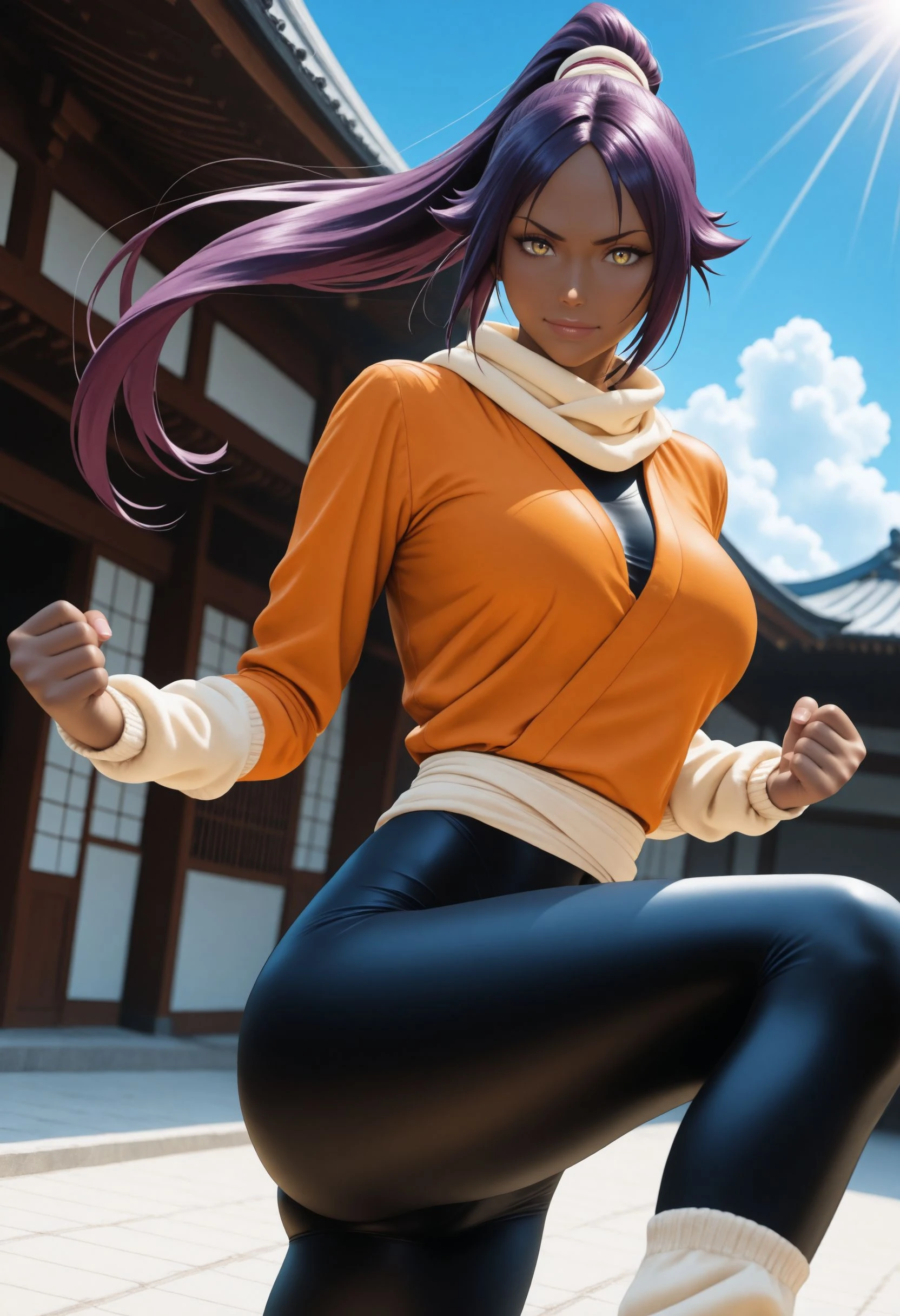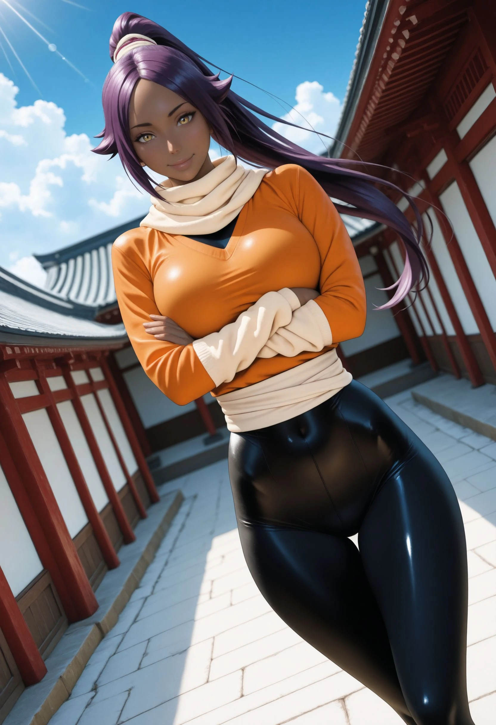 Original Outfit: default_yoruichi, long hair, high ponytail, hair tie, beige scarf, orange shirt, beige arm warmers, beige sash, black bodysuit,