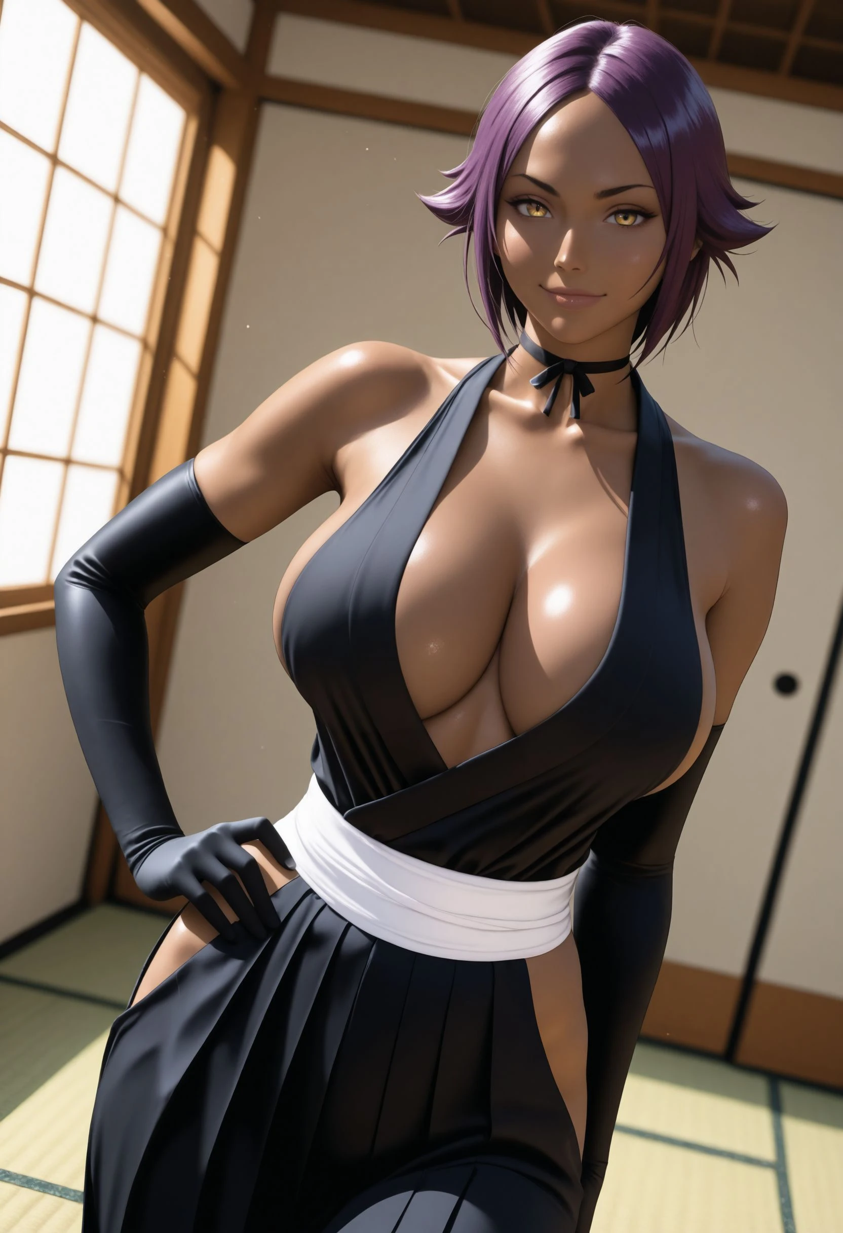 Captain Outfit w/o Haori: captain_yoruichi, short hair, black choker, black kimono, sideless kimono, sleeveless, black elbow gloves, sash, hip vent,