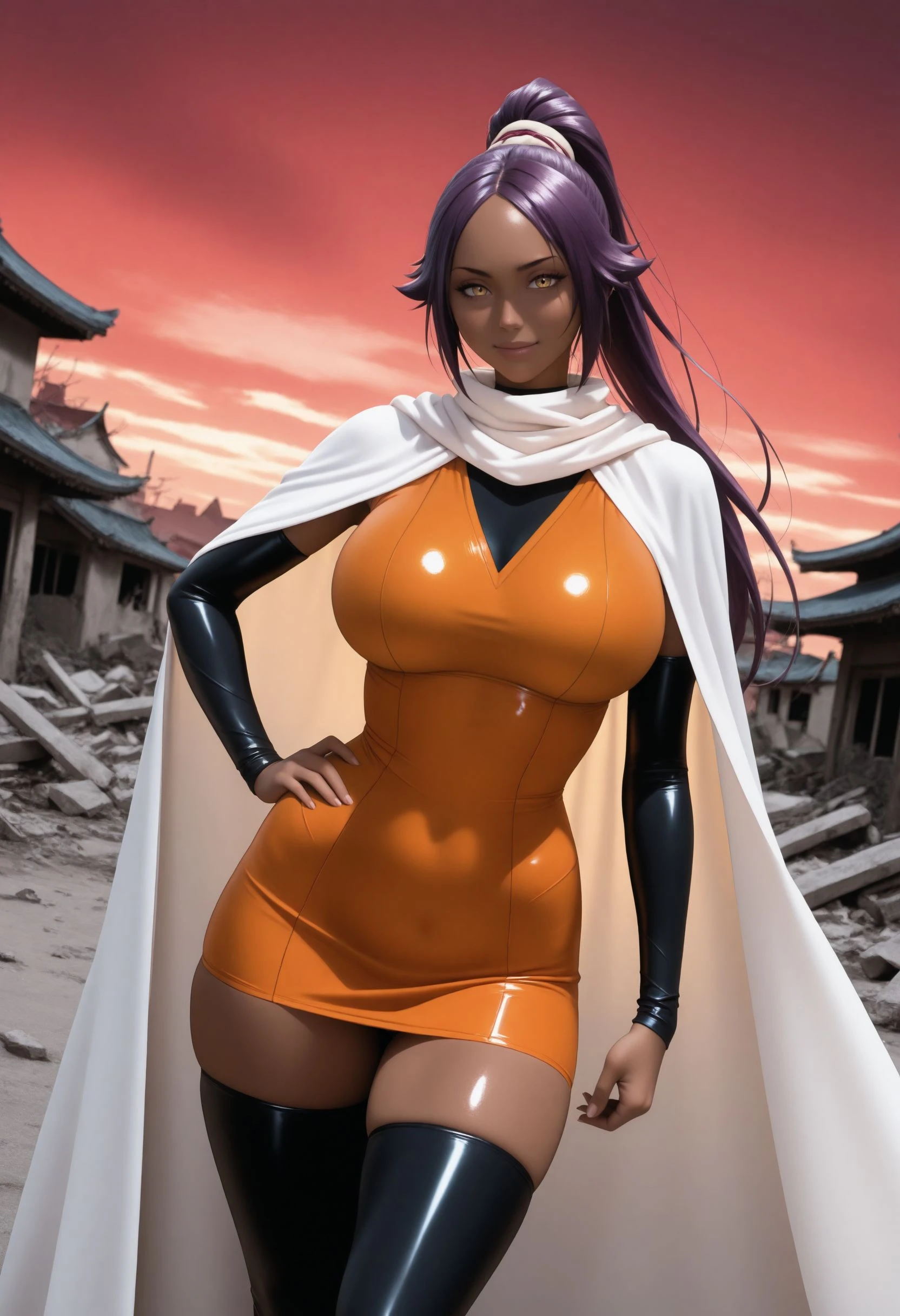 TYBW Outfit w/ Cape: tybw_yoruichi, long hair, high ponytail, hair tie, short dress, orange dress, bodysuit, black bodysuit, bodysuit under clothes, black arm warmers, black thighhighs, thigh boots, zettai ryouiki,