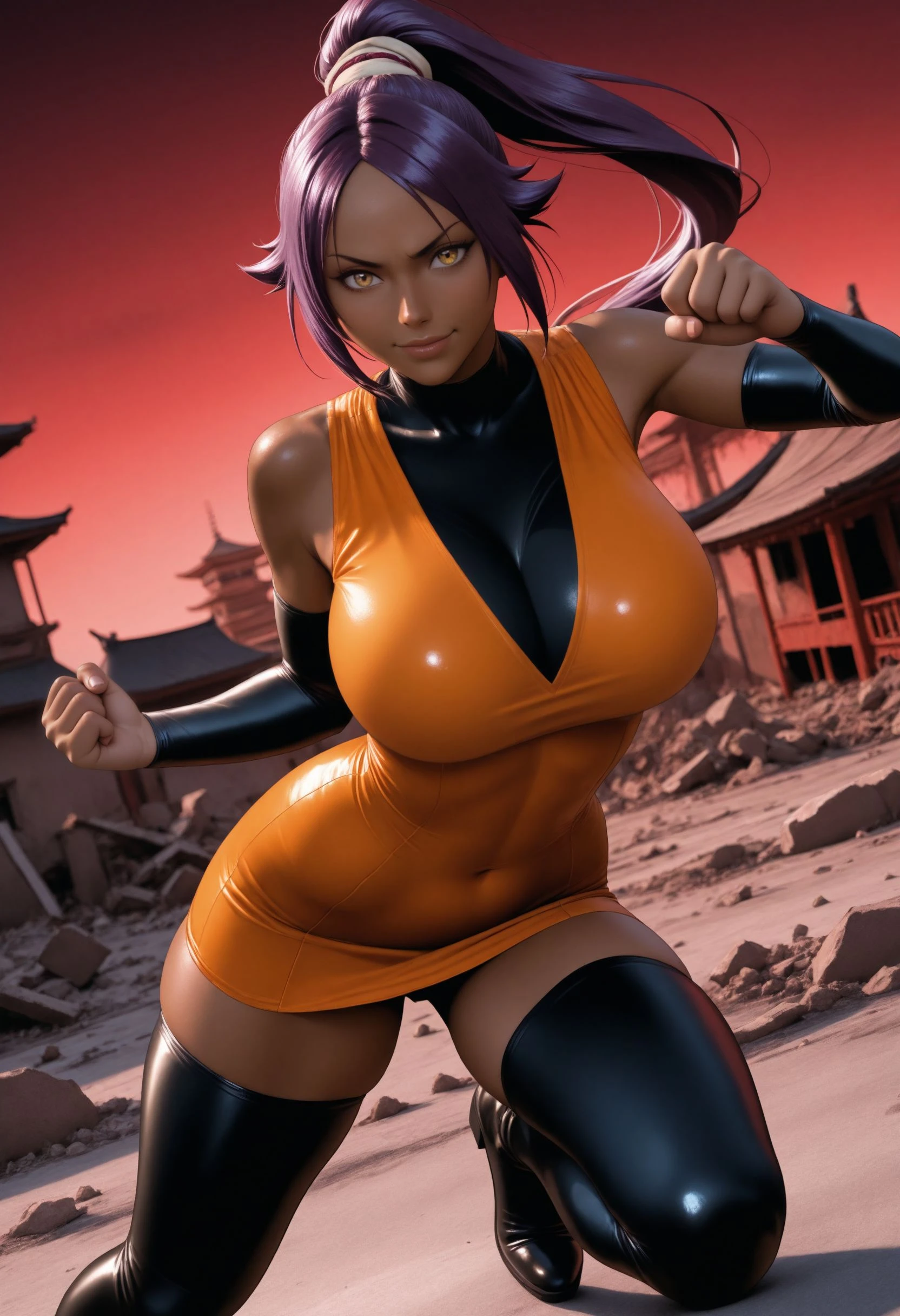 TYBW Outfit w/o Cape: tybw_yoruichi, long hair, high ponytail, hair tie, short dress, orange dress, bodysuit, black bodysuit, bodysuit under clothes, black arm warmers, black thighhighs, thigh boots, zettai ryouiki,