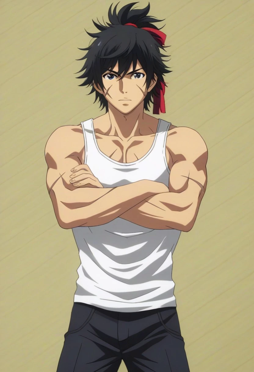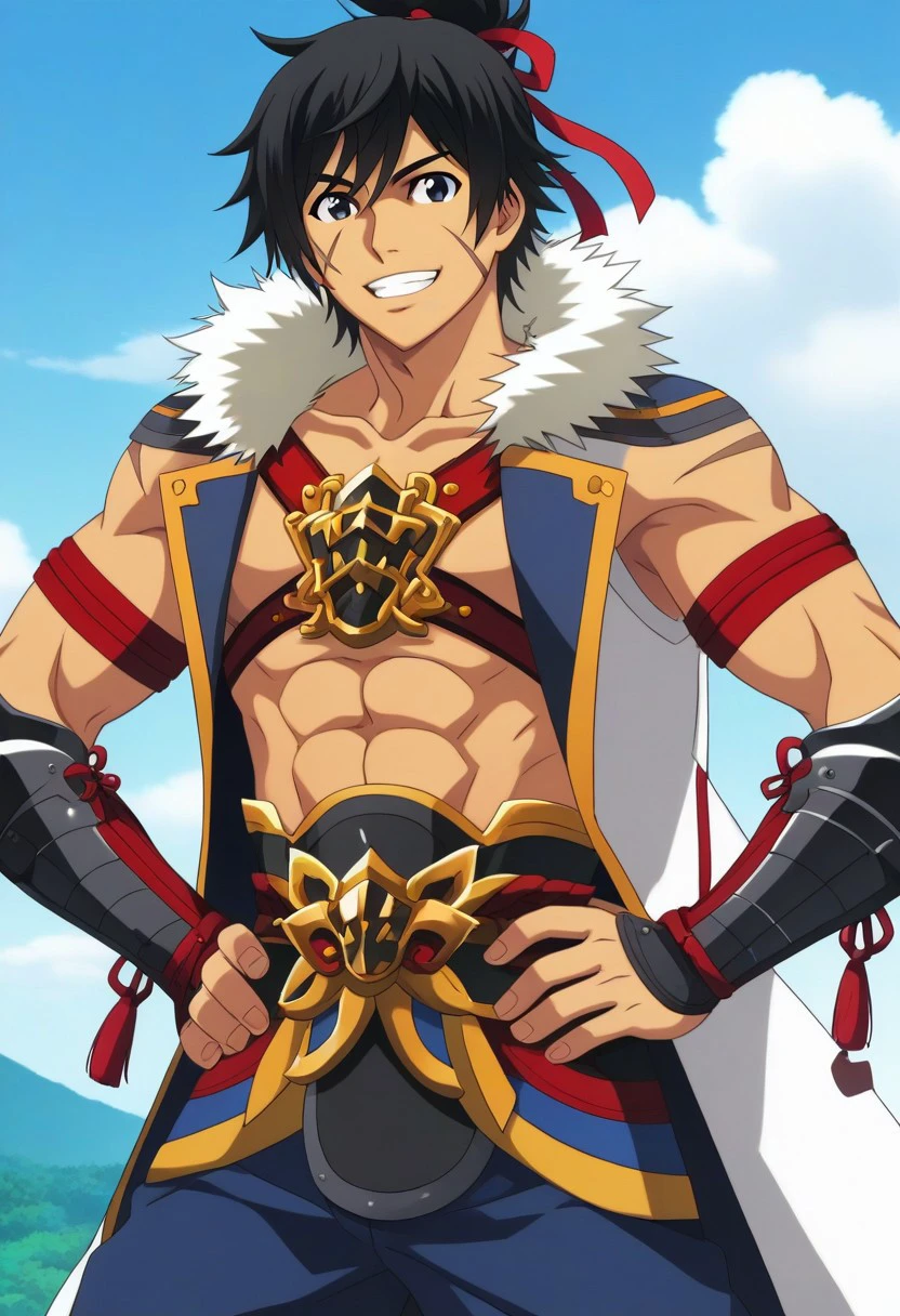 Keiichiro Tokugawa, black hair, messy hair, bushy hair, ponytail, hair ribbon, black eyes, face scars, fur hood, arm bands, vambraces, blue pants, greaves, sandals