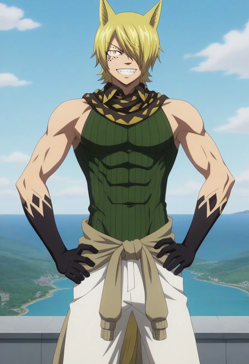 Jackal, blonde hair, animal ears, yellow eye, slit pupil, hair over one eye, face spots, short scarf, green shirt, sleeveless, black hands, black arm marks, gray jacket around waist, white baggy pants, yellow tail