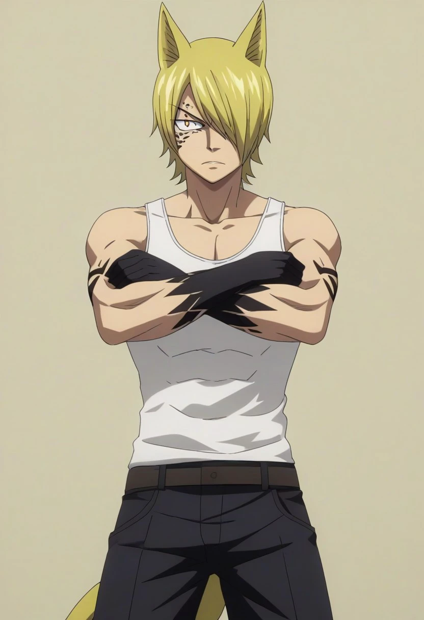 Jackal, blonde hair, animal ears, yellow eye, slit pupil, hair over one eye, face spots, long black scarf, shirtless, chest mark on right side, white gloves, elbow gloves, fingerless gloves, gray jacket around waist, black baggy pants, yellow tail
