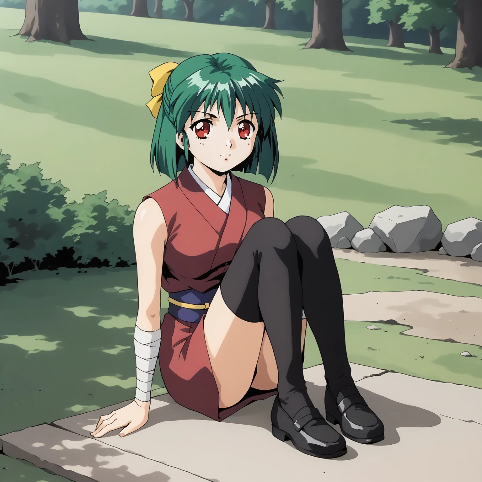 Yaku,1girl,green hair,short hair,half updo,hair ribbon,red eyes,