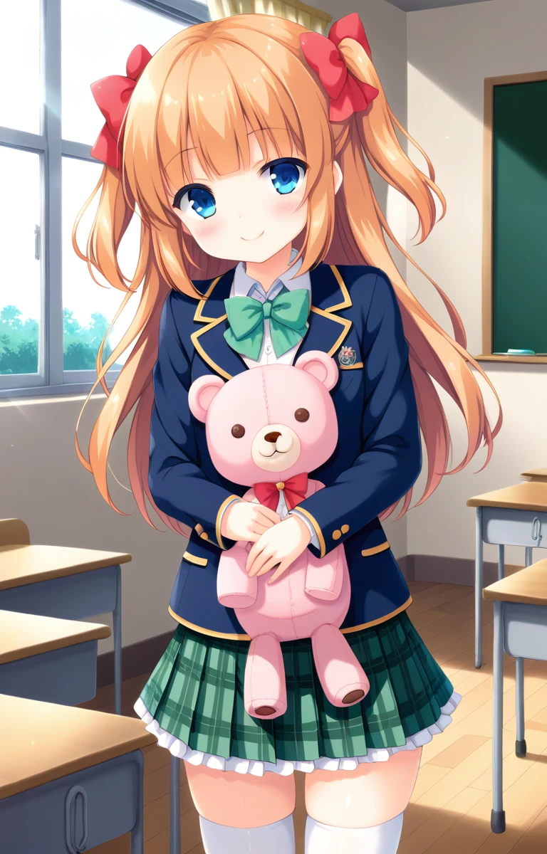トリガー(Trigger):yukinae, orange blonde hair, two side up, blunt bangs, red hair bow, blue eyes, flat chests