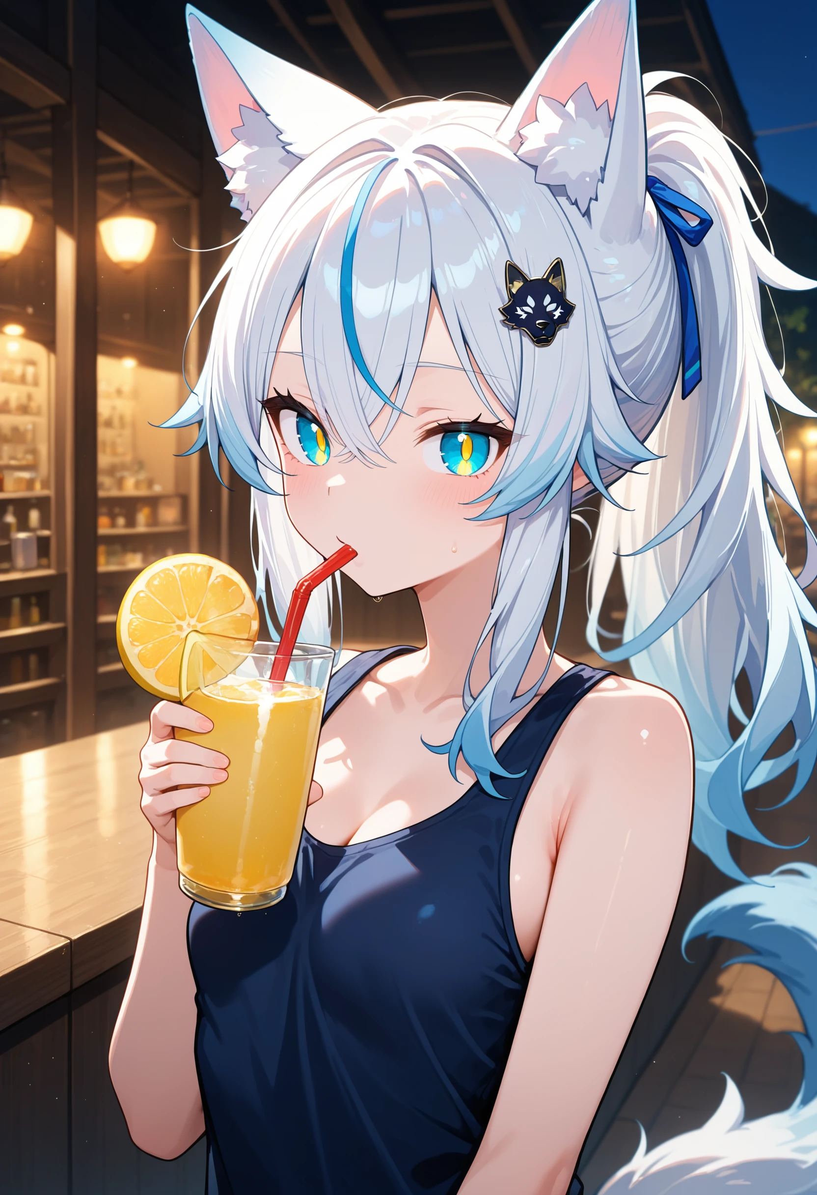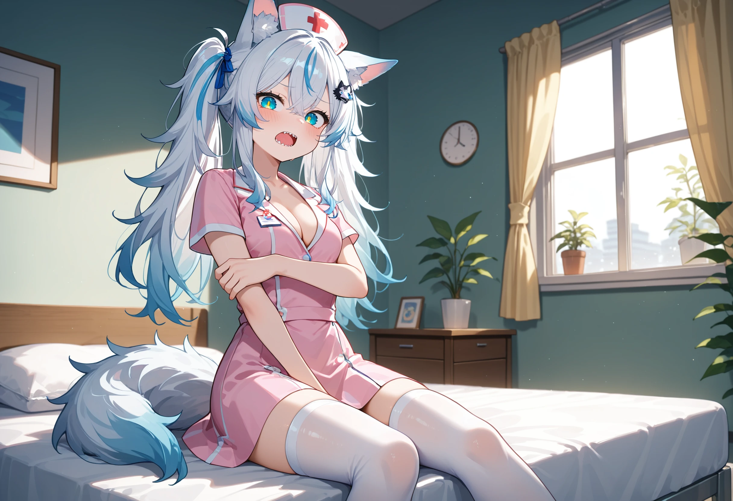Her trademarks are her wolf-shaped hair ornament and her sharp teeth.