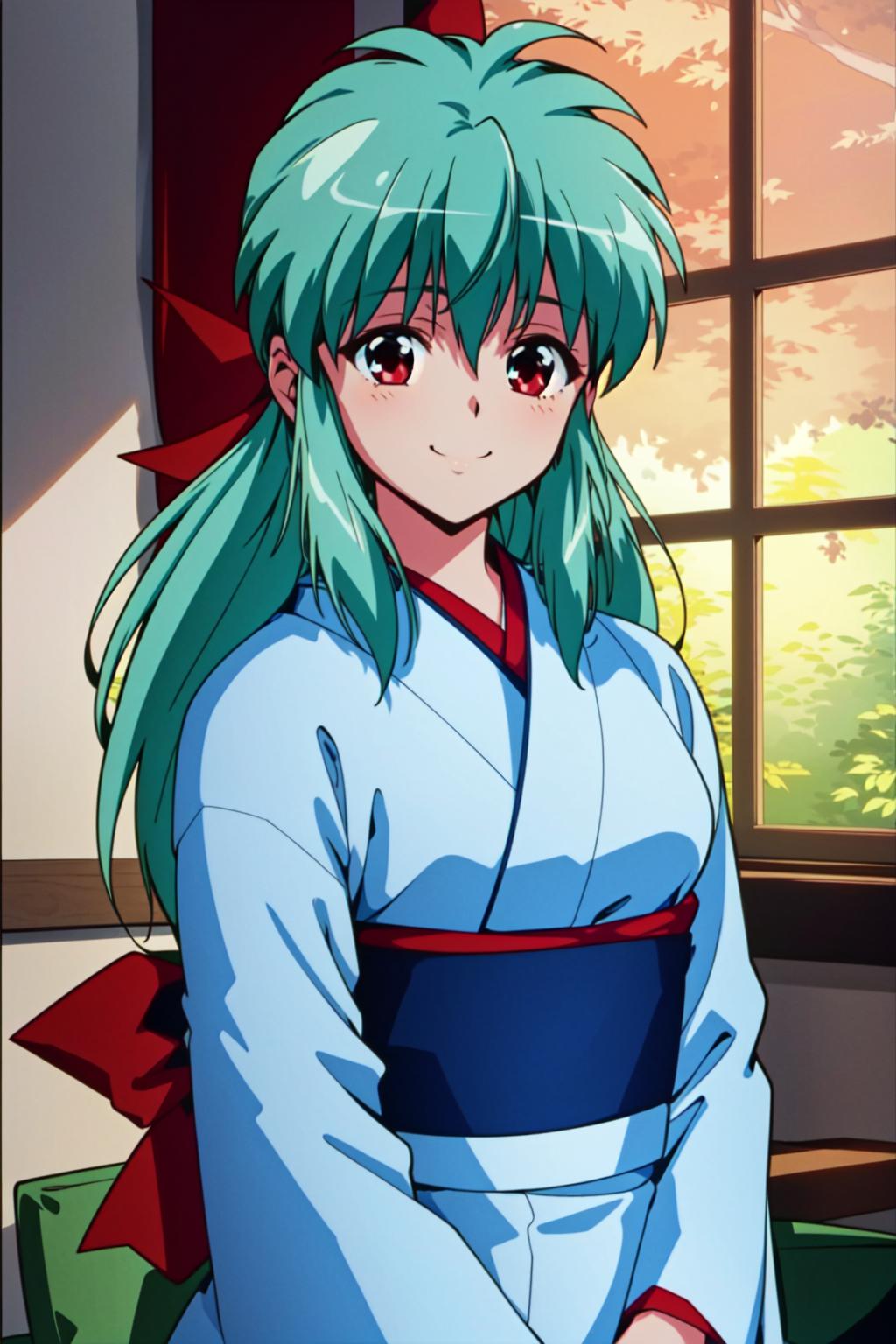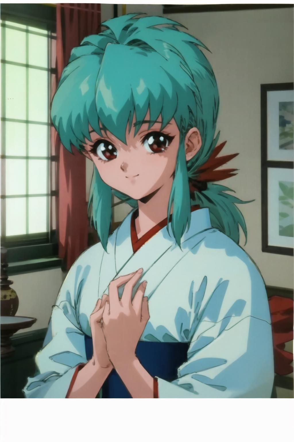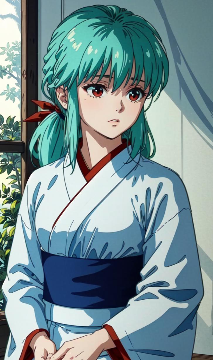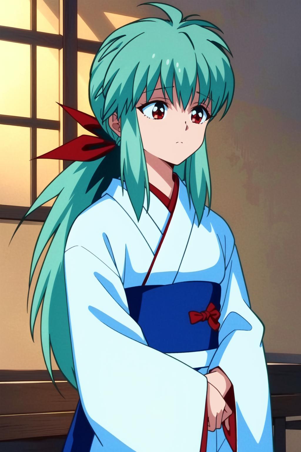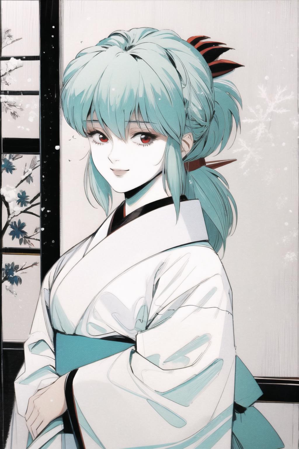 Yukina, 1girl, solo, red eyes, japanese clothes, sidelocks, kimono, ponytail, long hair, bangs, aqua hair, white kimono