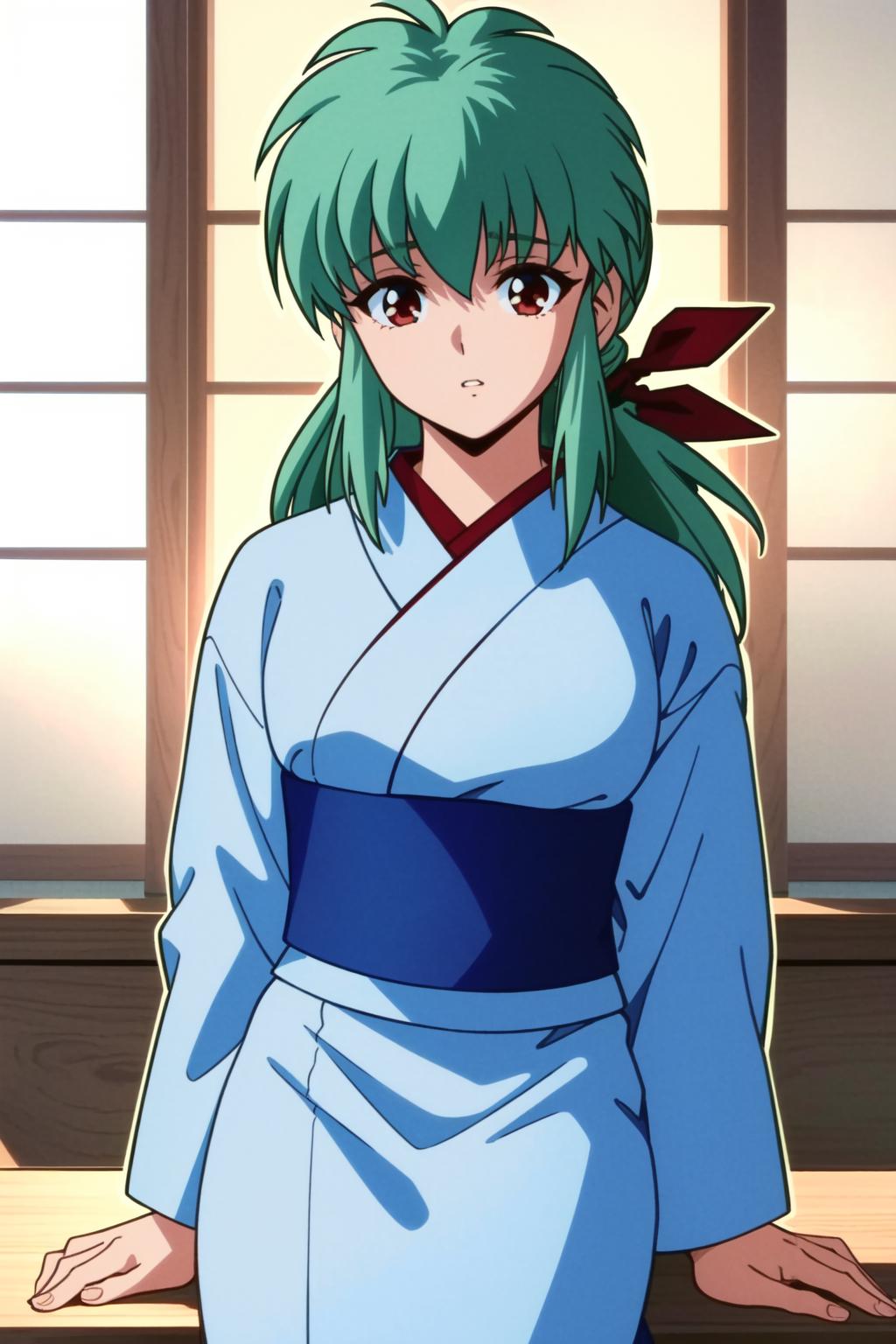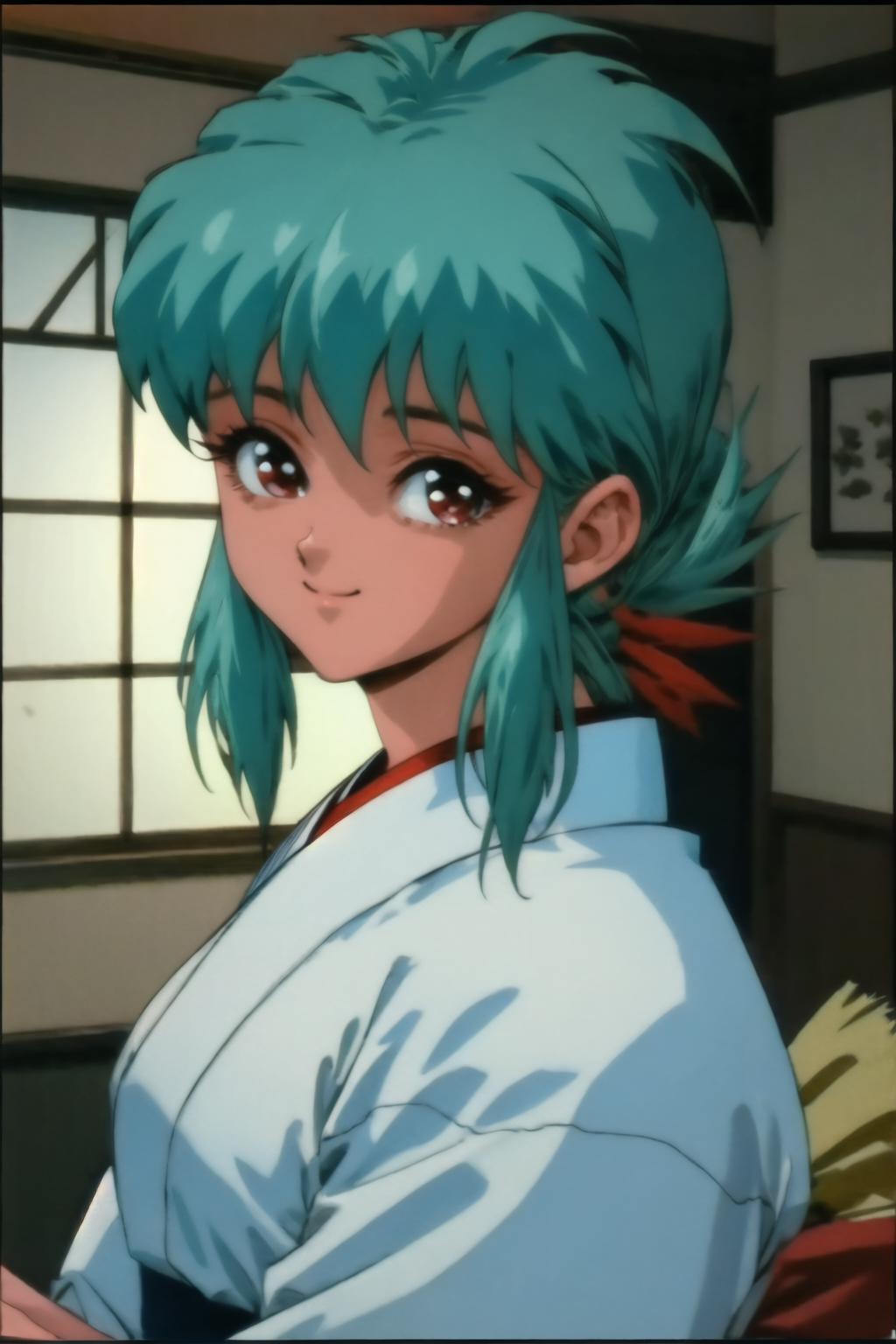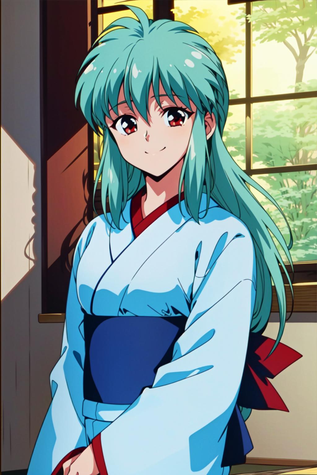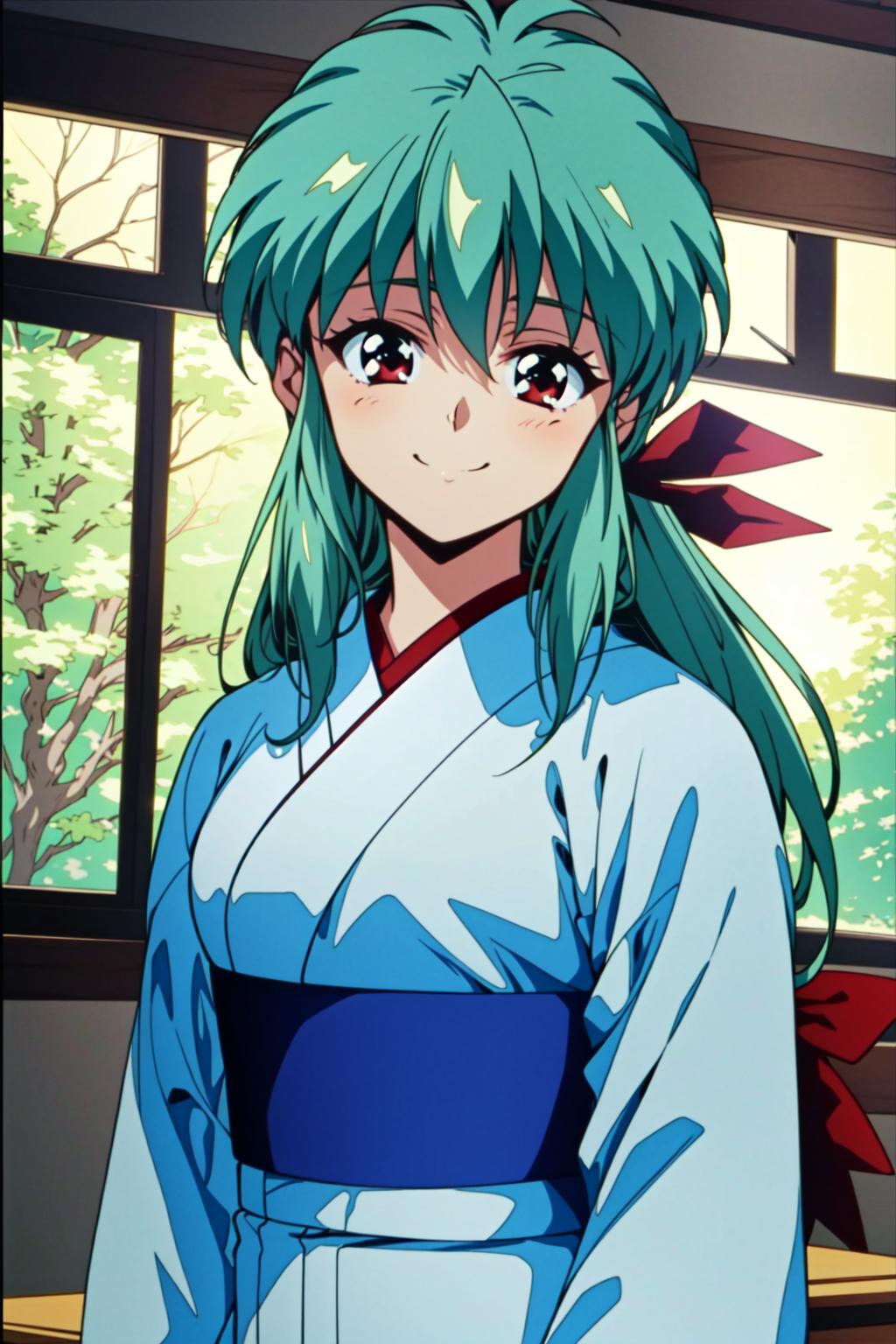 Yukina, 1girl, solo, red eyes, japanese clothes, sidelocks, kimono, ponytail, long hair, bangs, aqua hair, white kimono