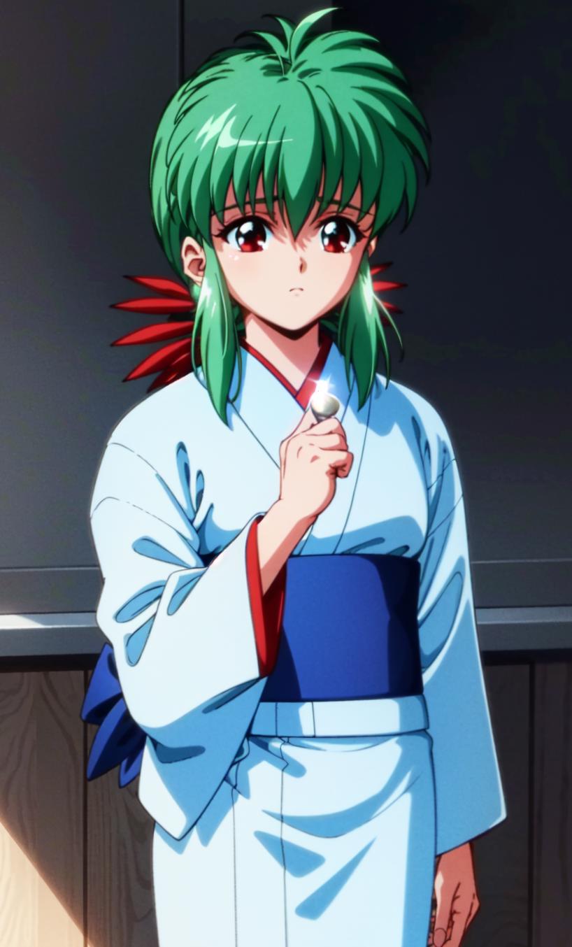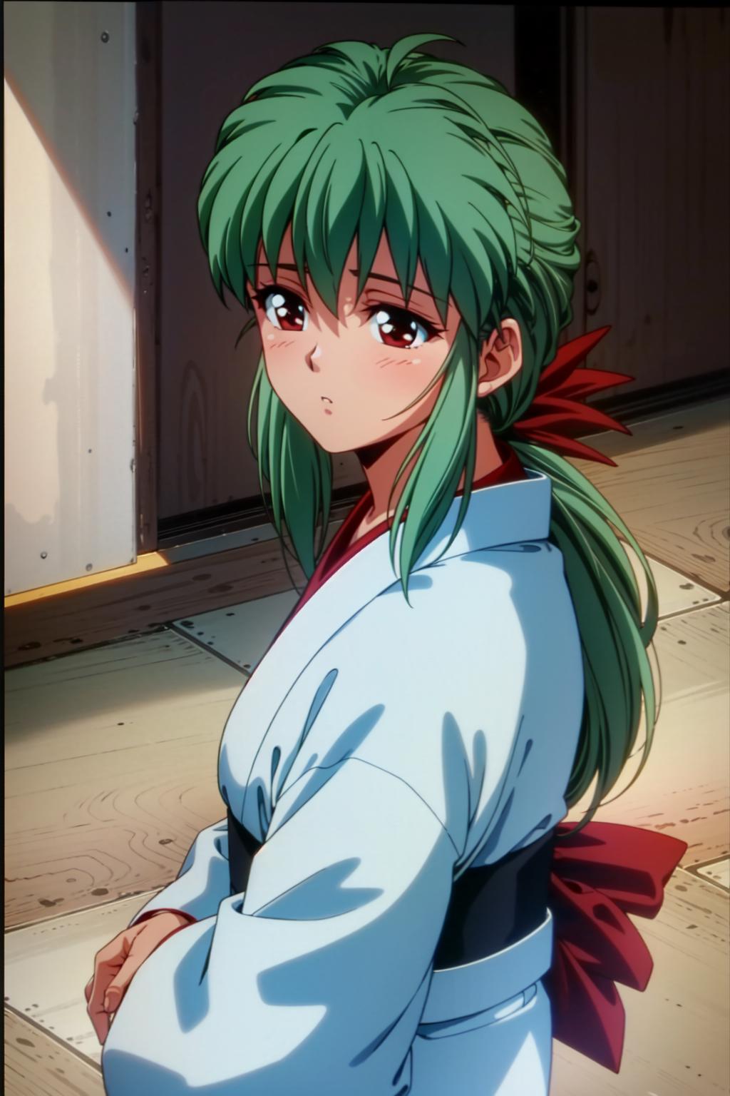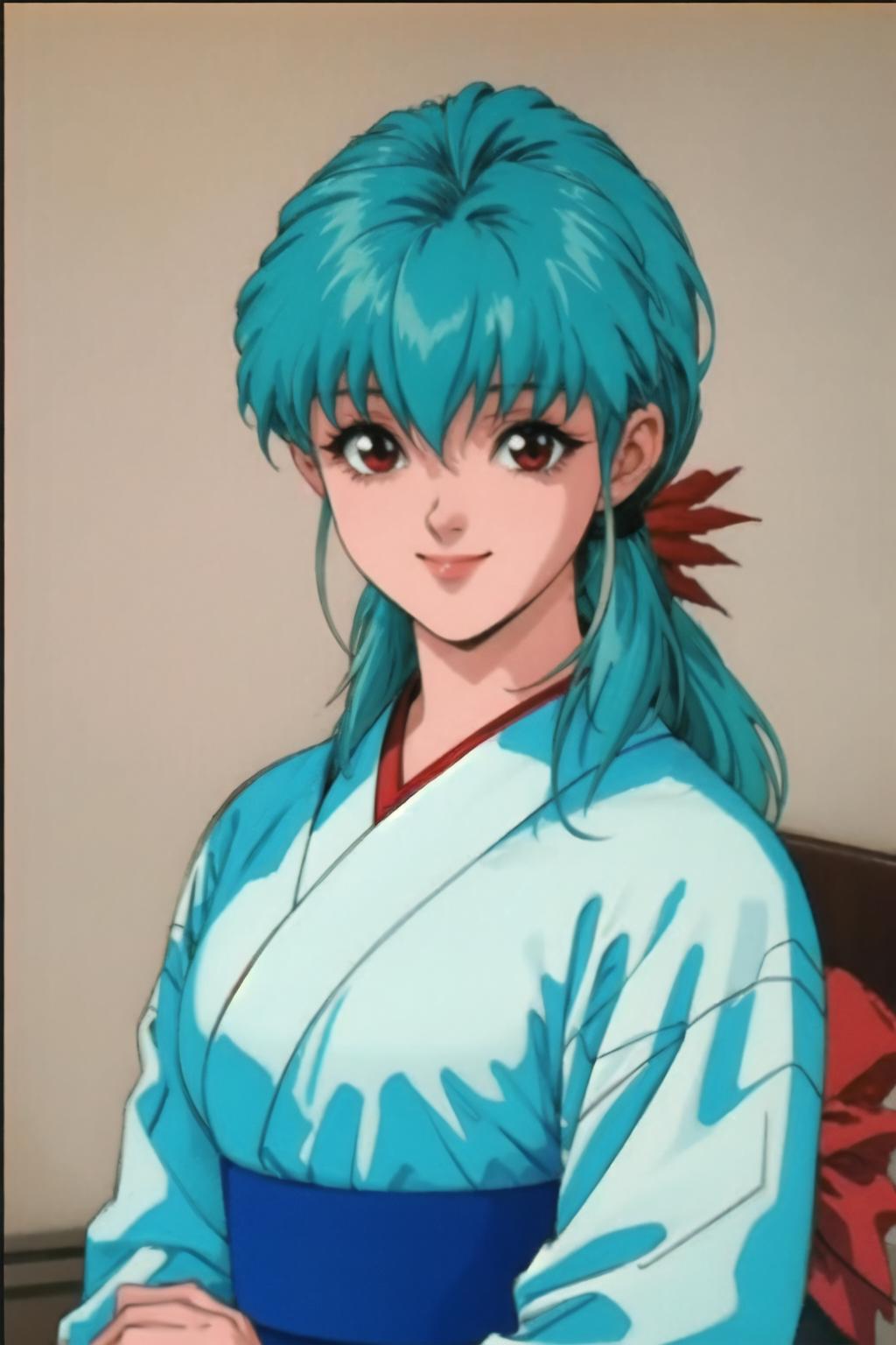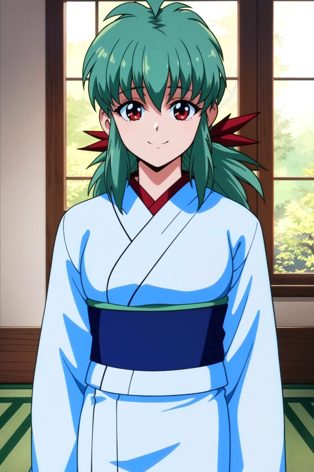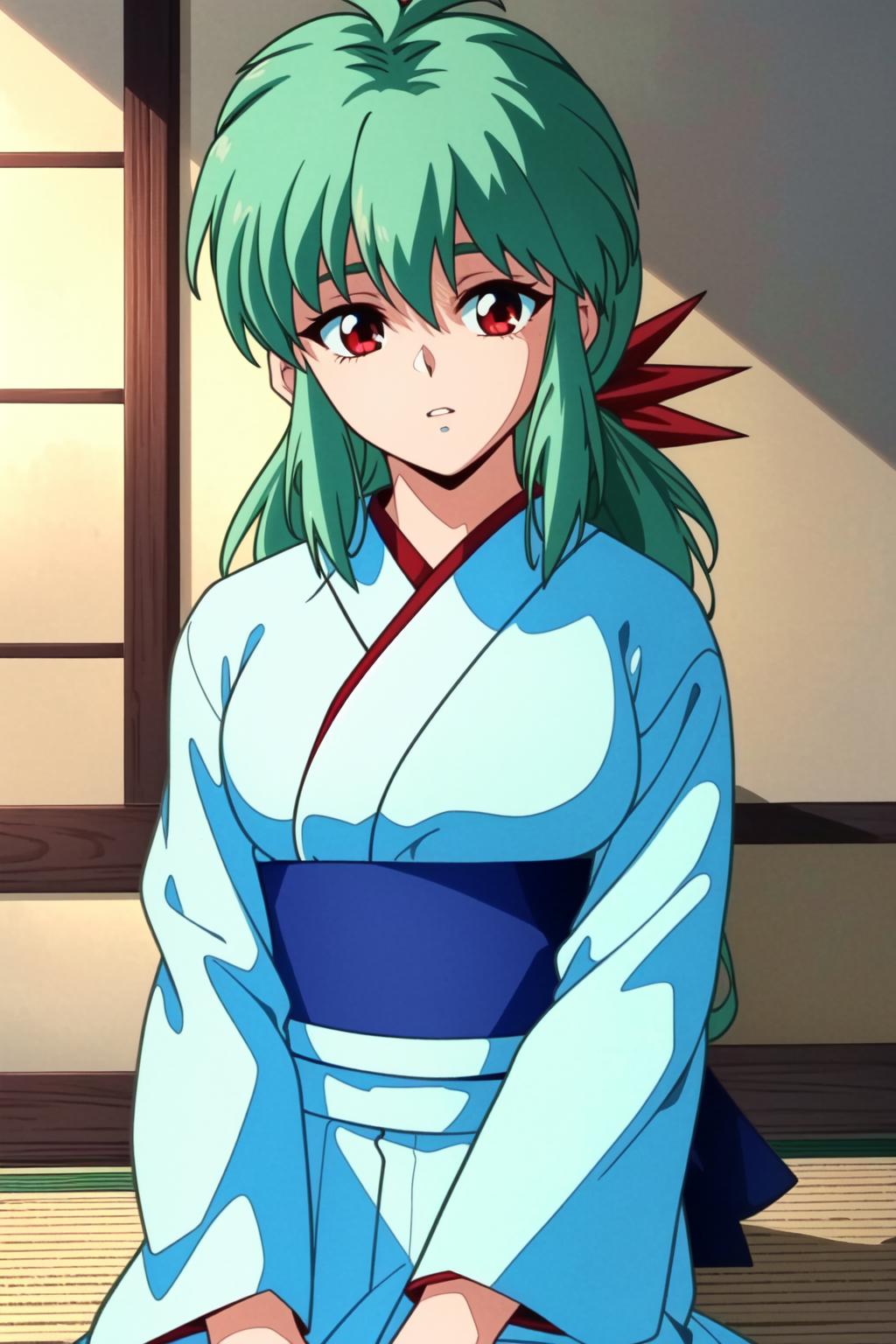 Yukina, 1girl, solo, red eyes, japanese clothes, sidelocks, kimono, ponytail, long hair, bangs, aqua hair, white kimono