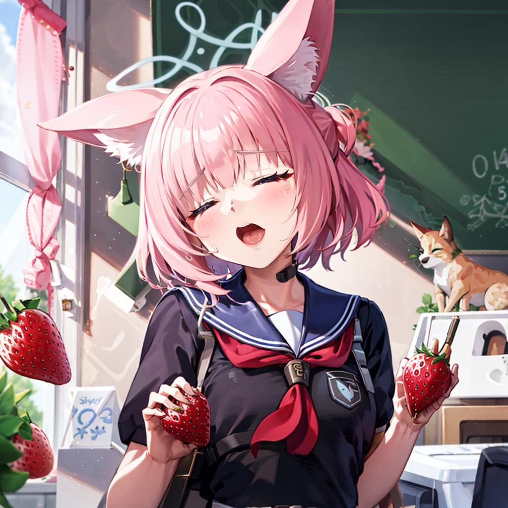 extag: closed eyes,open mouth,food,holding,fruit,strawberry,holding food,upper body,